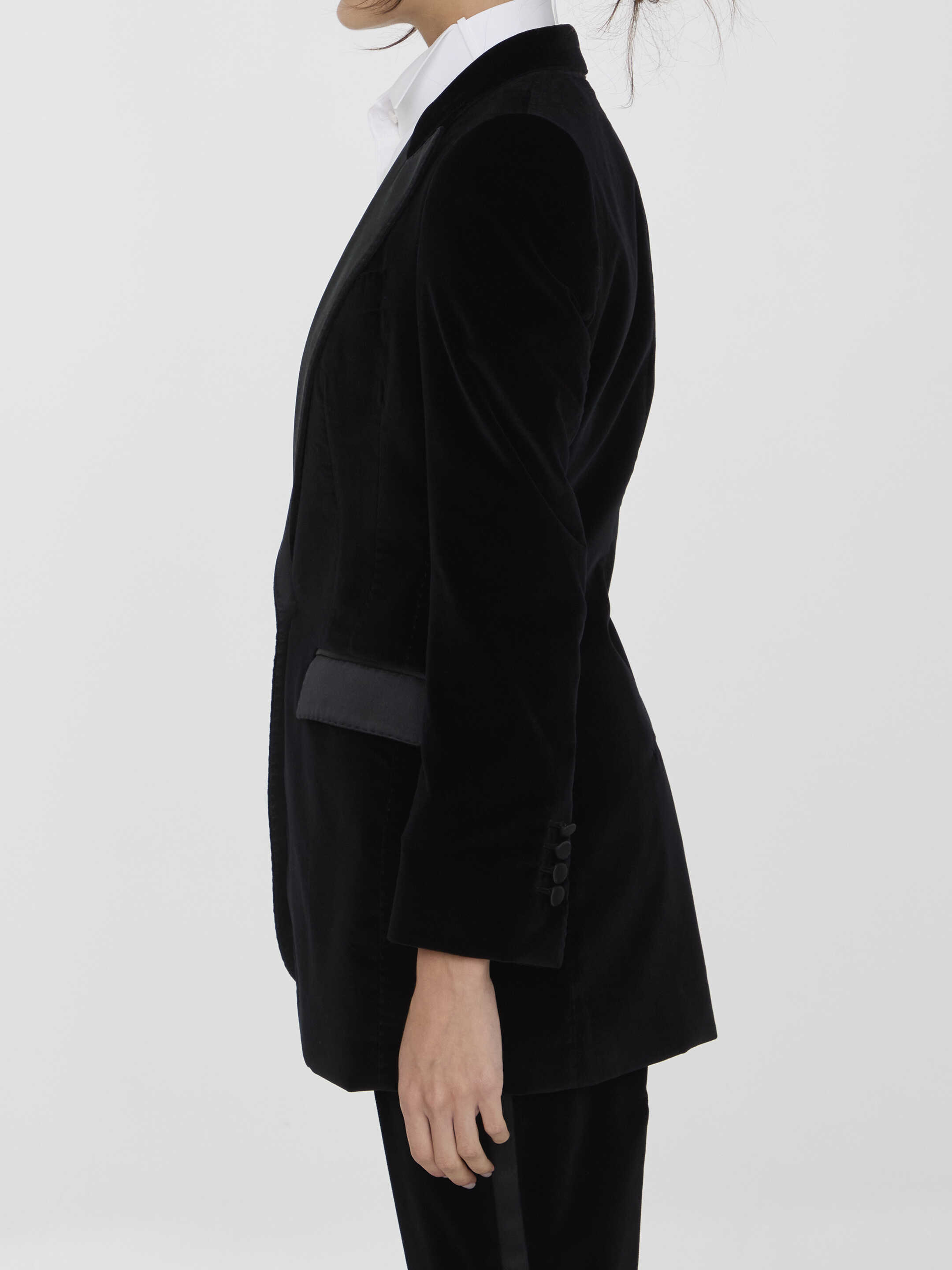 Turtlington tuxedo jacket in black velvet with silk duchesse details. It features peaked lapels, single-breasted single-button closure, one welt pocket on chest, two front flap pockets and buttoned cuffs. Silk satin lining. Regular fit.