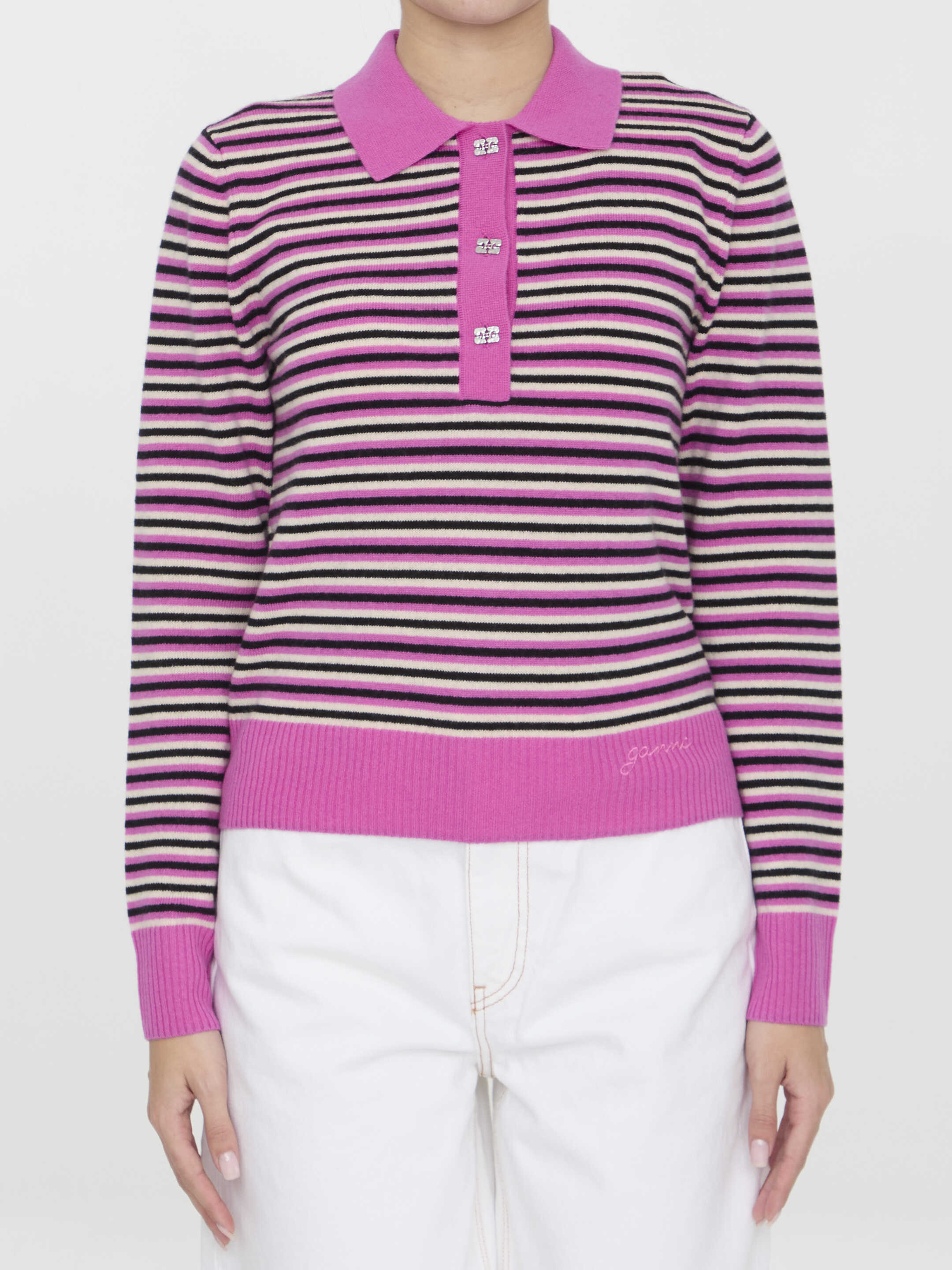 Long-sleeved polo sweater in striped multicolor wool and cashmere. It features classic collar, Ganni Butterfly buttons and embroidered Ganni logo. Ribbed edges. Regular fit.
