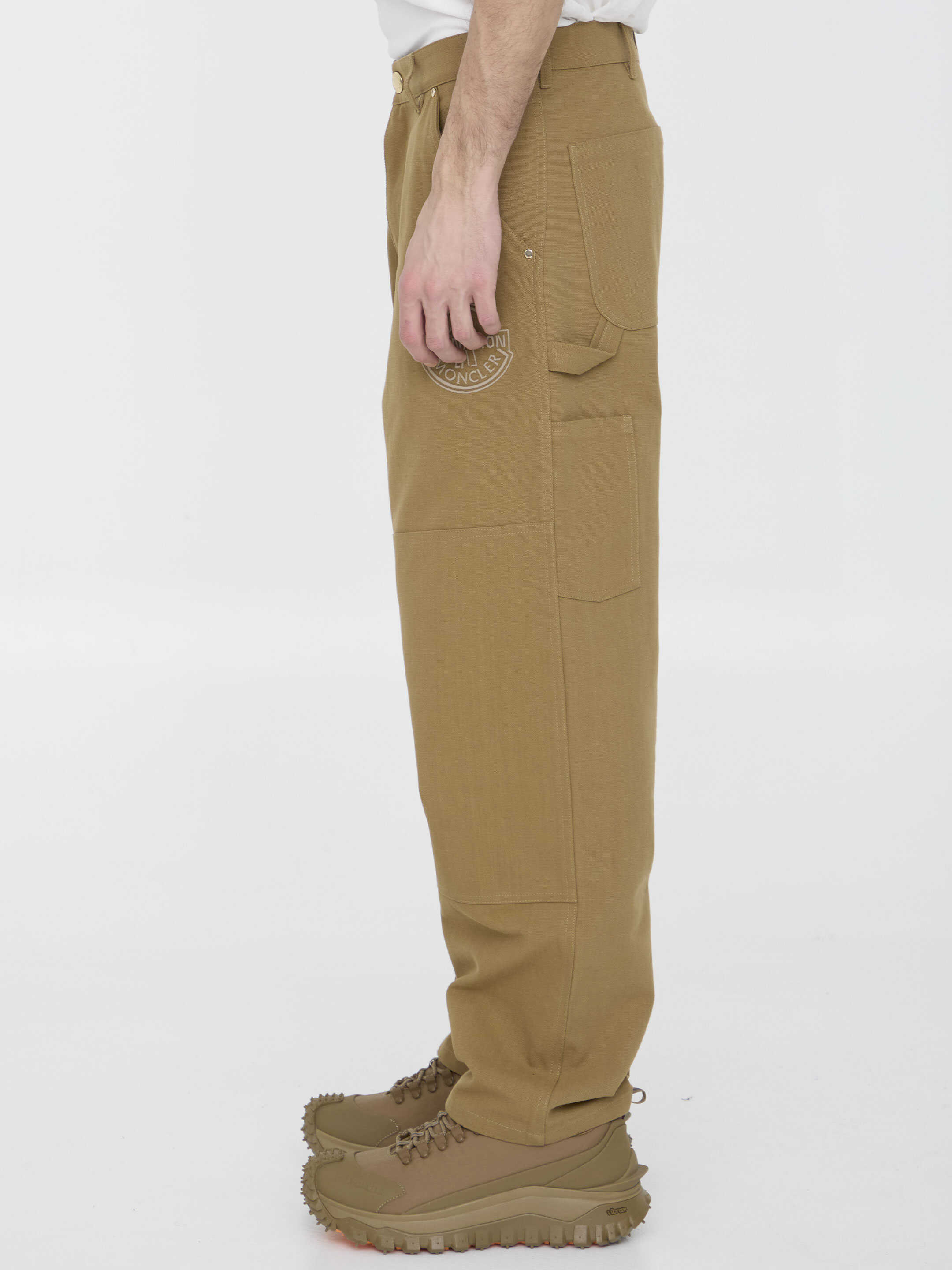 Camel cotton canvas trousers with embroidered logo on the front. It features zip and press-stud fastening, multi-pocket design and belt loops. Regular fit.