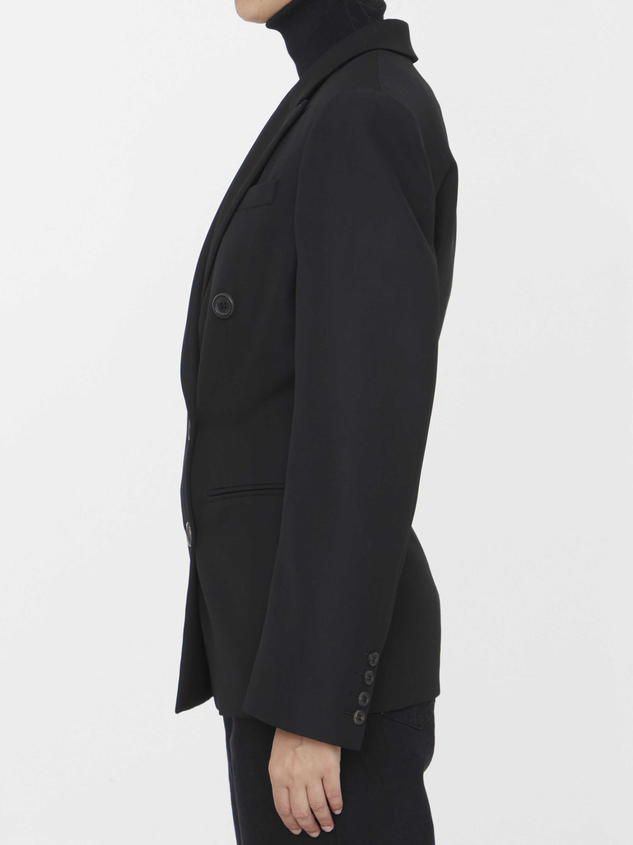 Myra double-breasted jacket in black virgin wool. It features peaked lapels front six-button closure, two side welt pockets, a welt pocket on chest and buttoned cuffs. Regular fit.
