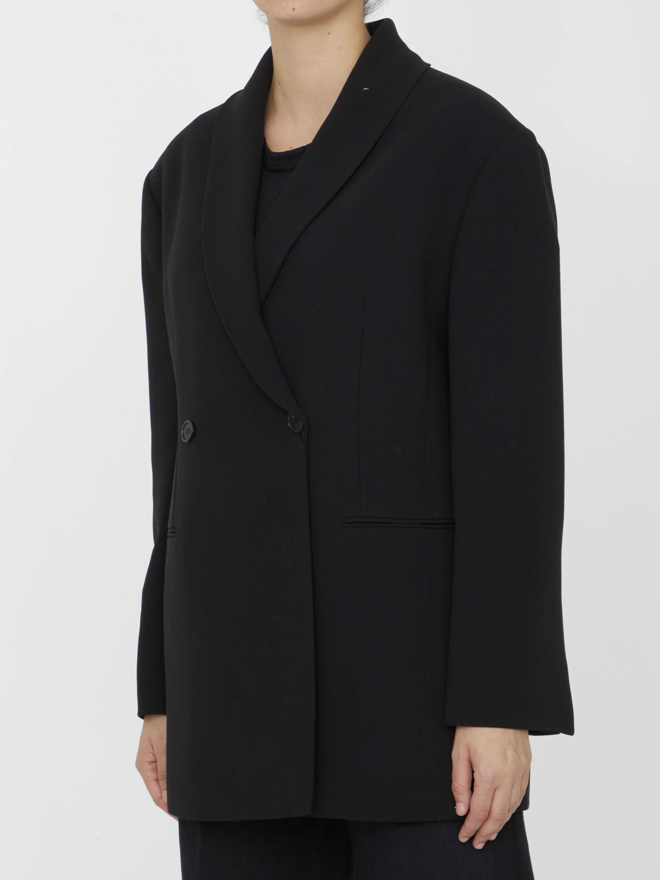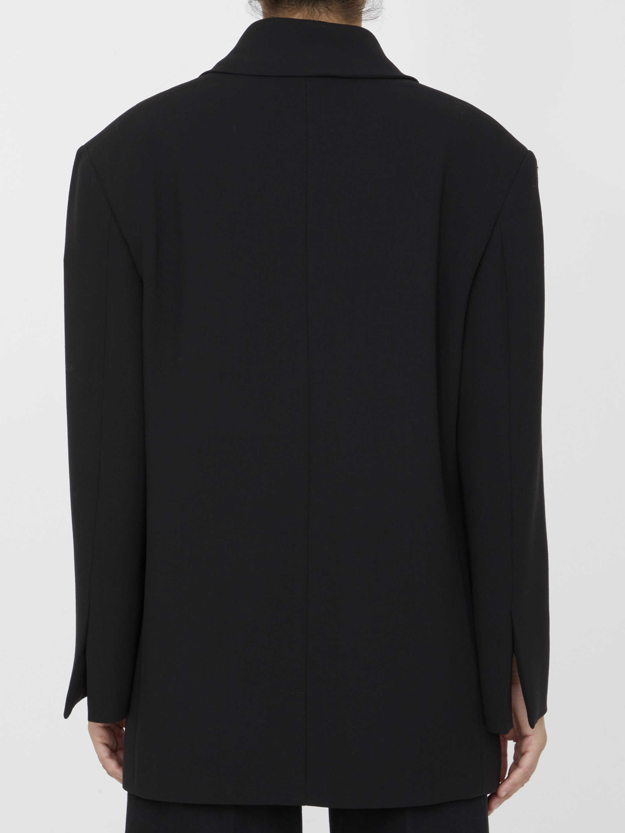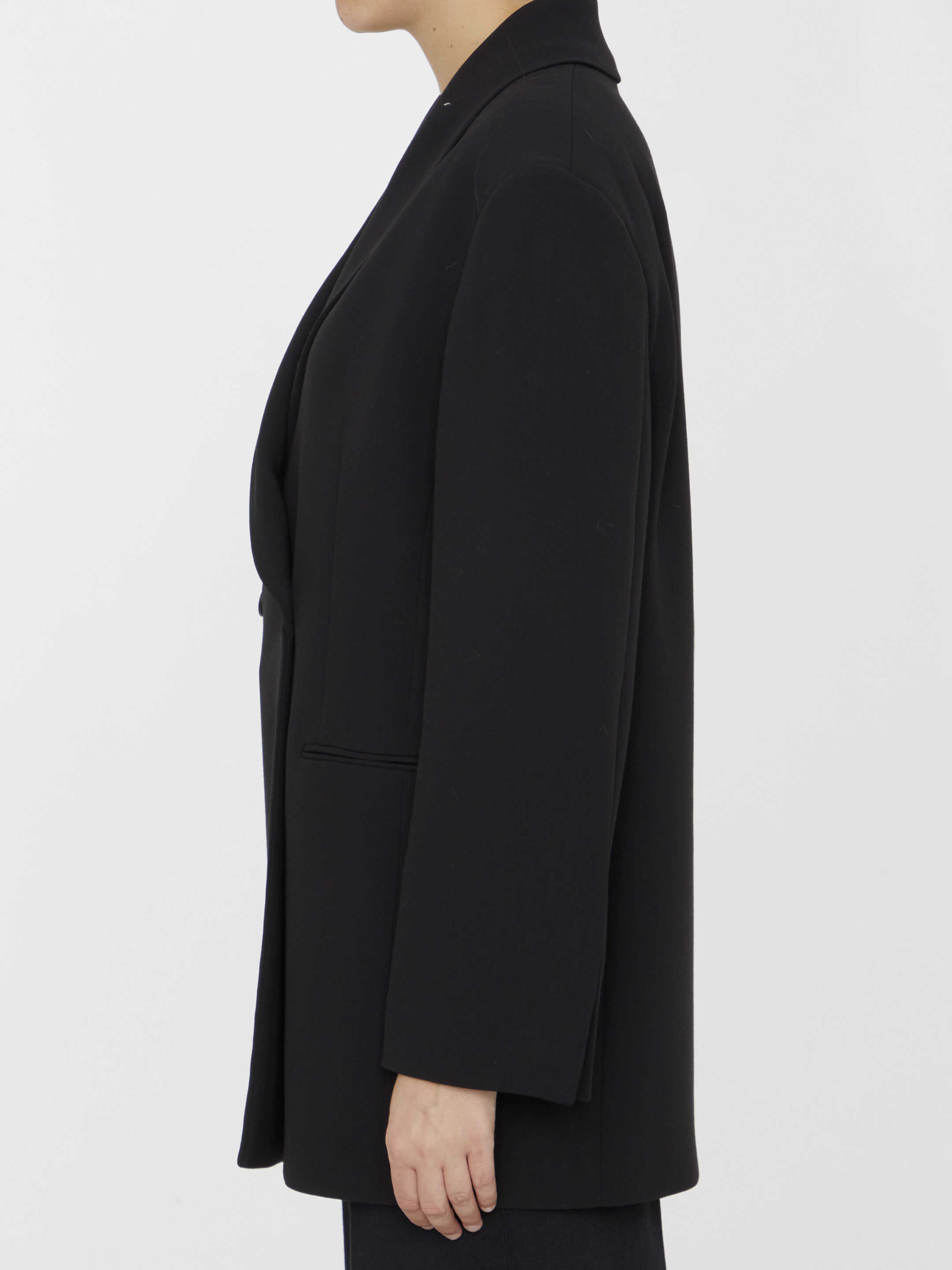 Diomede jacket in black virgin wool. It features draped shawl lapels, single-button closure and two side welt poclets. Oversized fit.
