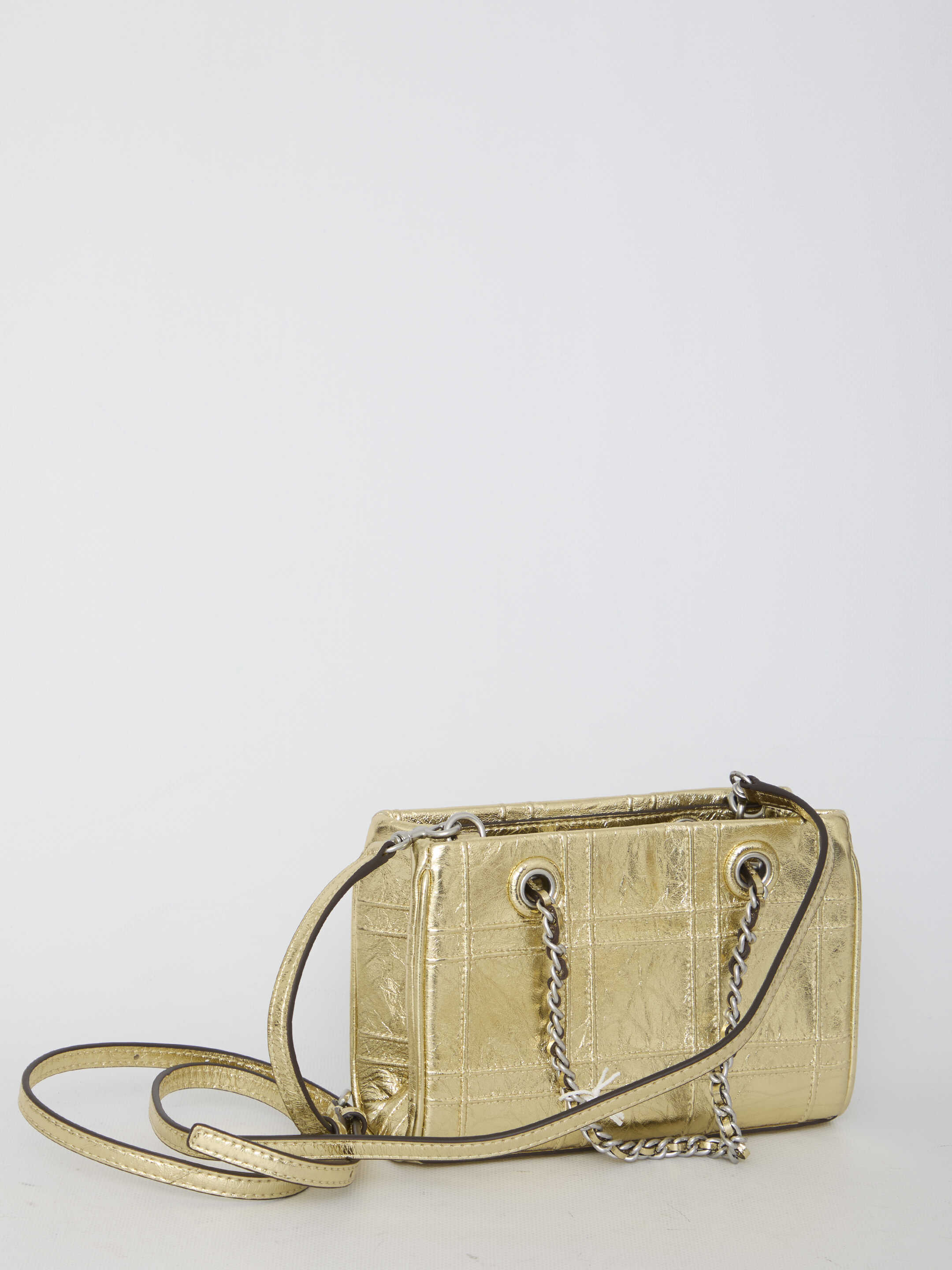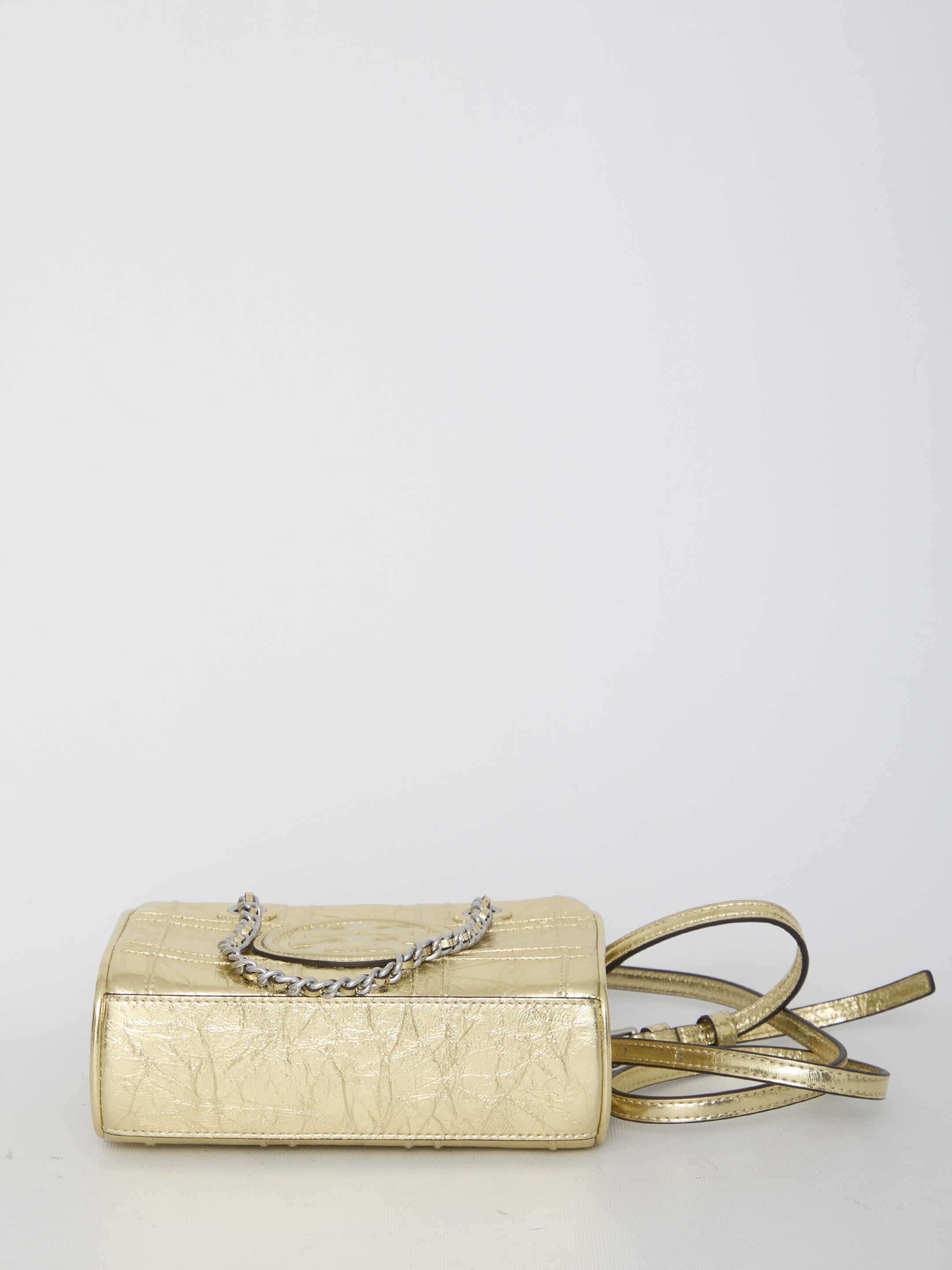 Fleming Soft Metallic Quilt Mini Chain Tote bag in gold-tone metallic leather with embossed Double T logo on the front. It features double chain handles, adjustable and detachable shoulder strap, magnetic closure, one main interior compartment and one interior card slot.