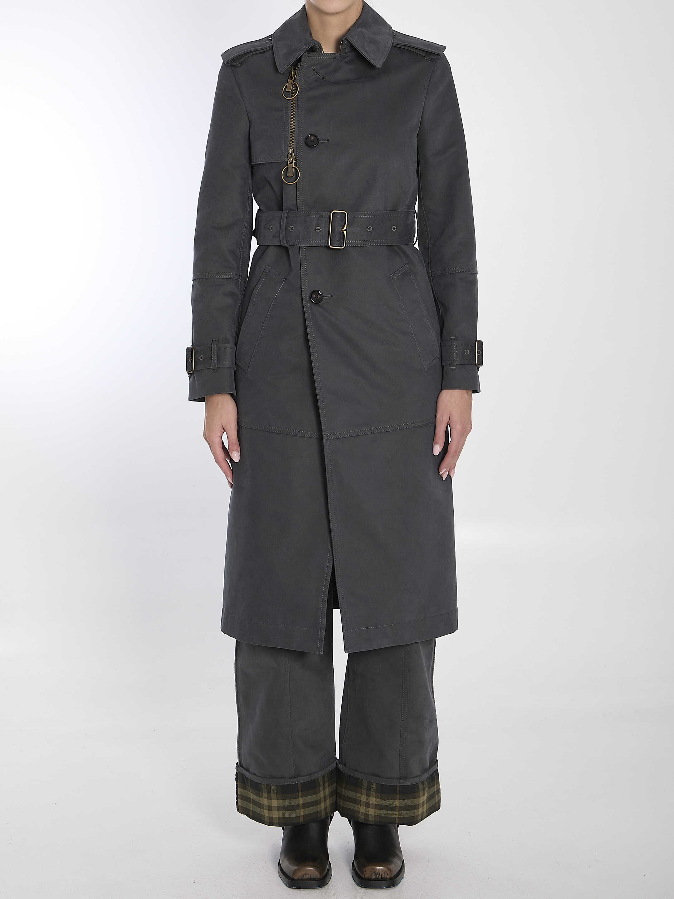 Trousers in cinder cotton and nylon with turn-up cuffs in Burberry Check flannel. It features zip, button and hook closure, B-cut detail at the waistband, two side welt pockets, two rear welt pockets and belt loops. Regular fit.