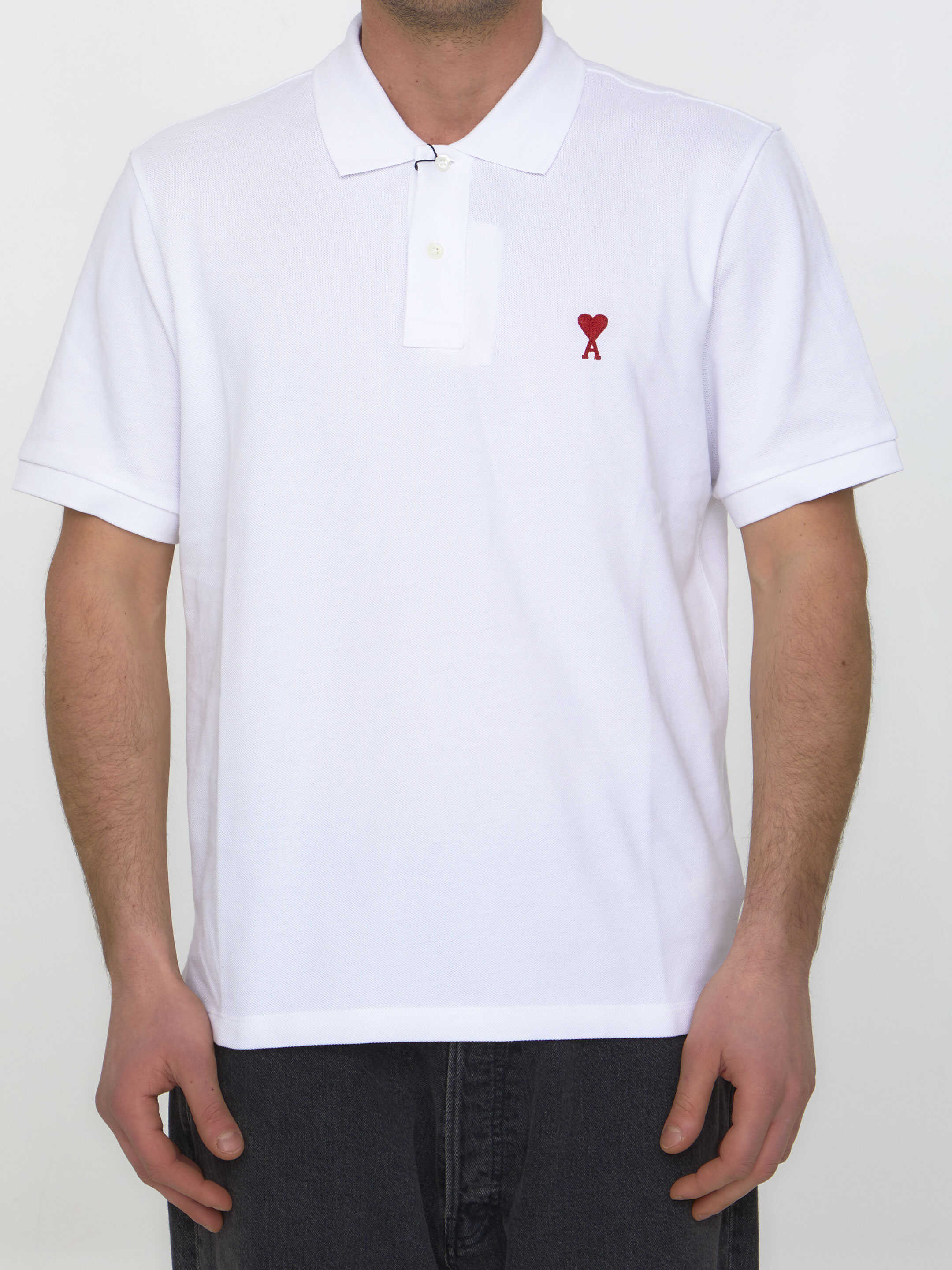 Short-sleeved polo shirt in white piqué organic cotton with red Ami De Coeur embroidery on chest. It features classic collar, front buttoned placket and ribbed trims. Regular fit.