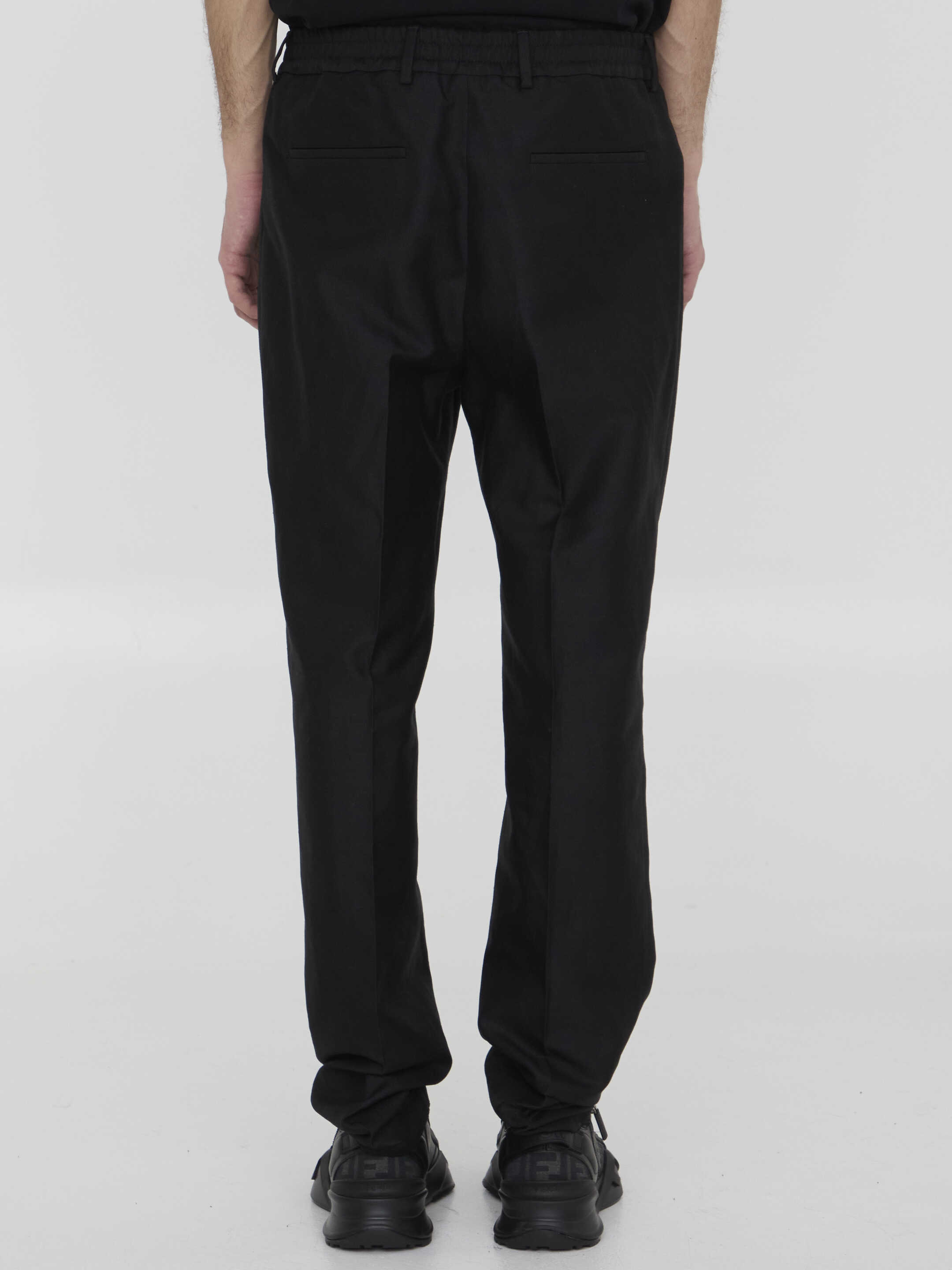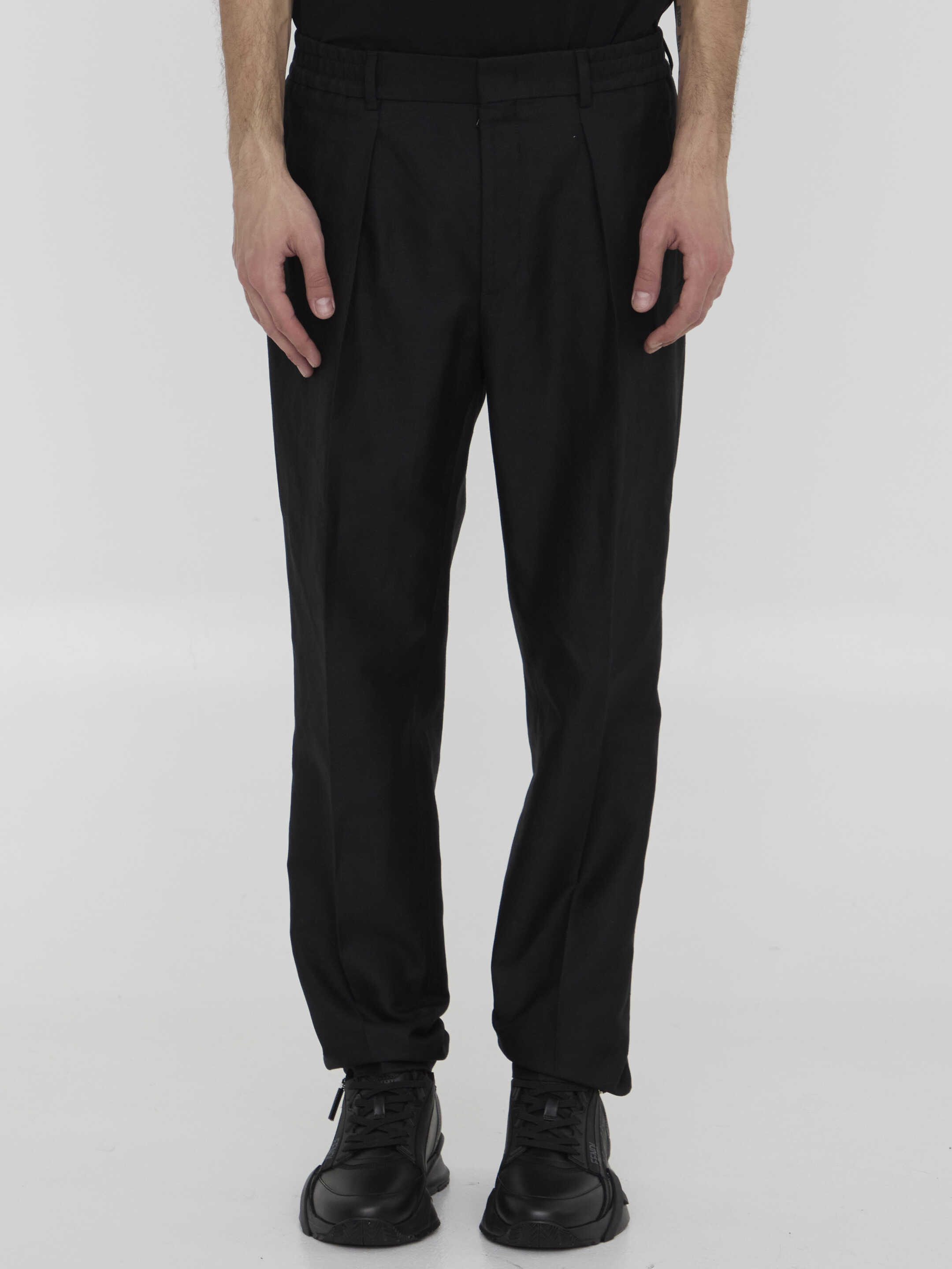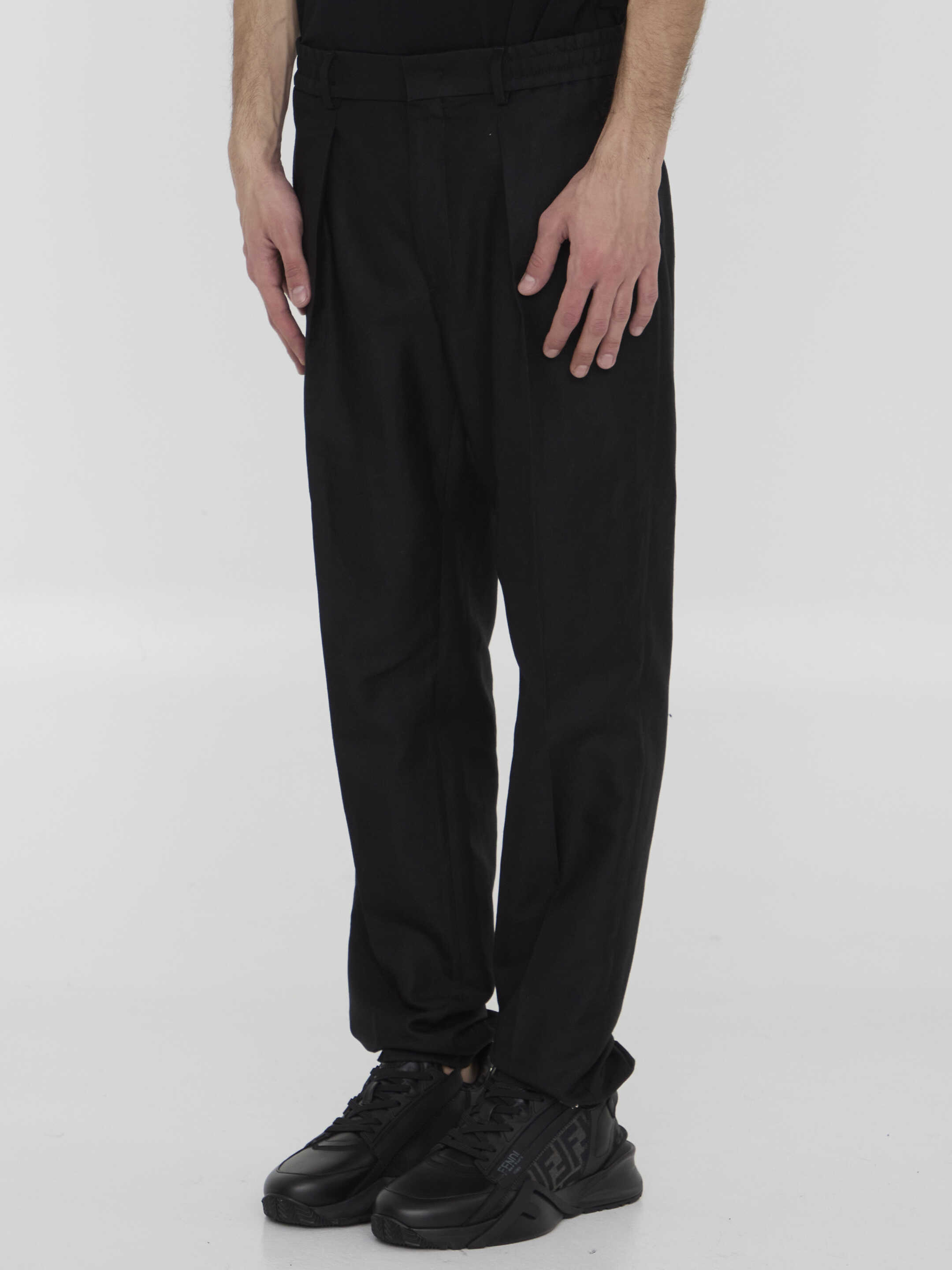 Pleated trousers in black cotton blend. It features elasticated waistband, zip, button and hook-and-eye closure, two side welt pockets, two rear welt pockets and belt loops. Regular fit.