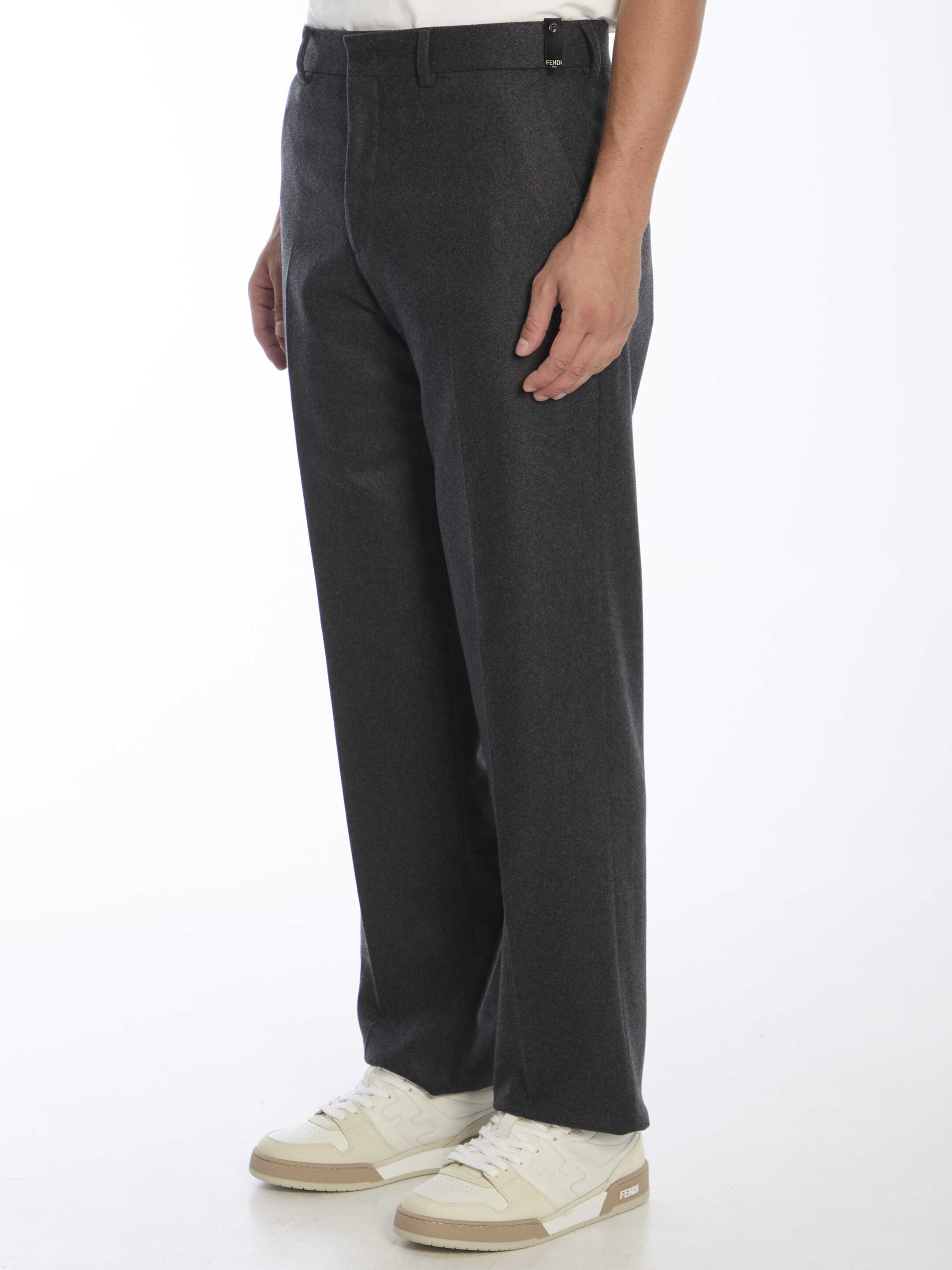 Straight-leg pleated trousers in grey cashmere. It features zip, button and hook-and-eye closure, two side welt pockets, two rear welt pockets and belt loops. Regular fit.