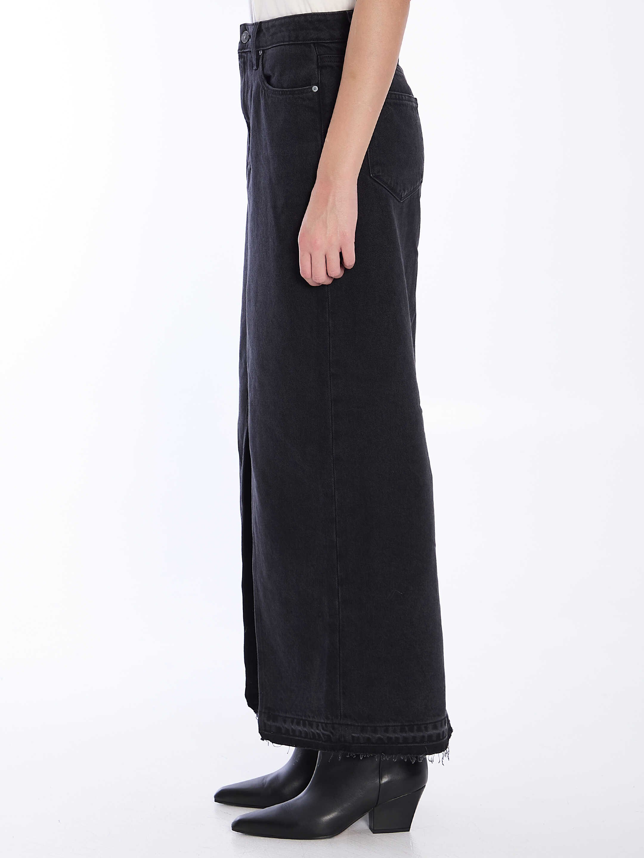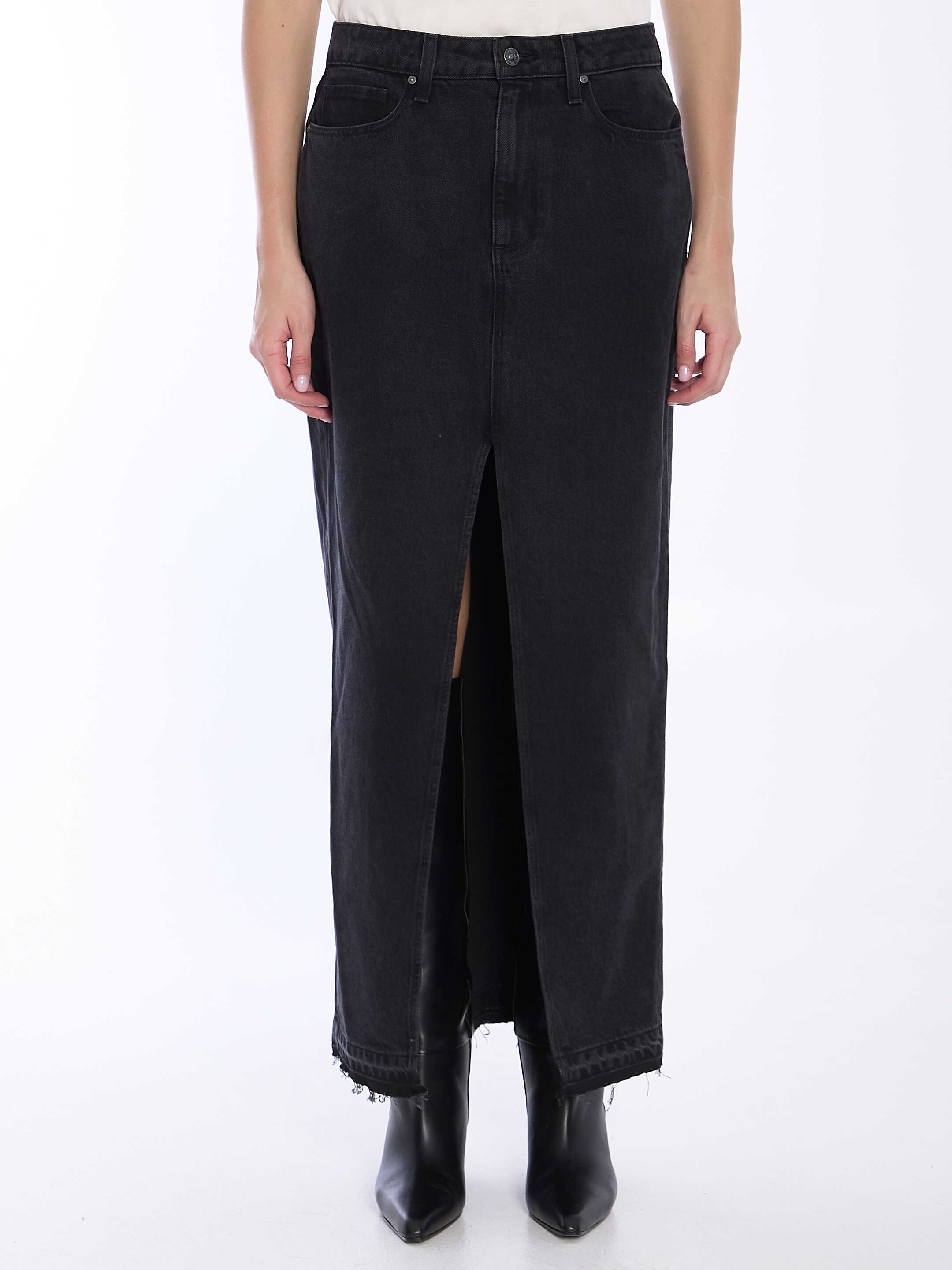 High-rise Angela maxi skirt in cotton blend denim with "Iridium" washing. It features front slit, zip and button closure, five-pocket design, belt loops and raw hem. Regular fit.