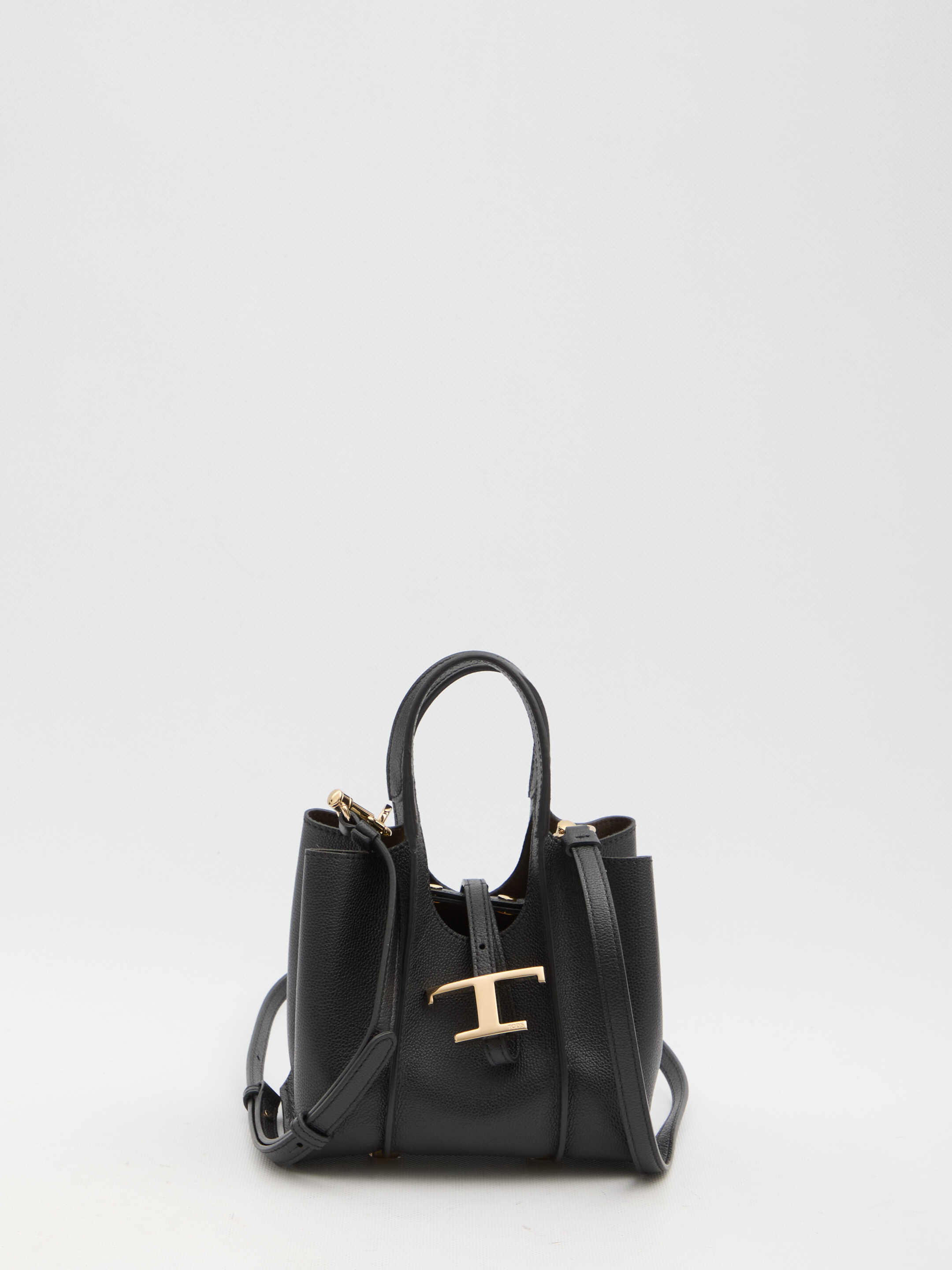 T Timeless Micro shopping bag in black grained leather with T Timeless charm. It features two flat handles, adjustable and detachable shoulder strap, snap-button tab closure and one main interior compartment. Any leather imperfections are not to be considered manufacturing defects, but a peculiarity of the material.
