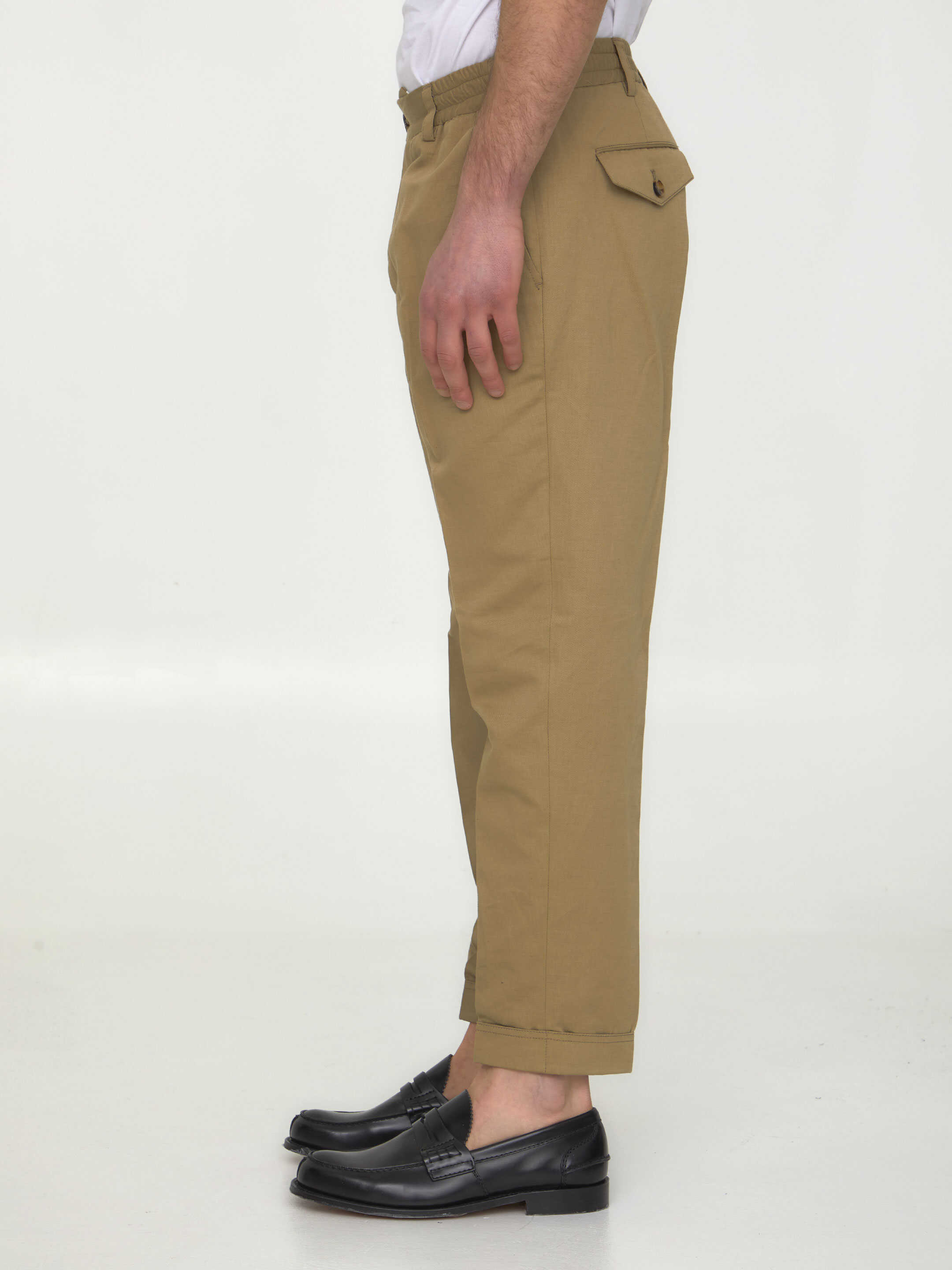 Ankle-length trousers in beige cotton and linen. It features elasticated waistband, button closure, two side welt pockets, two rear buttoned flap pockets and belt loops. Regular fit.