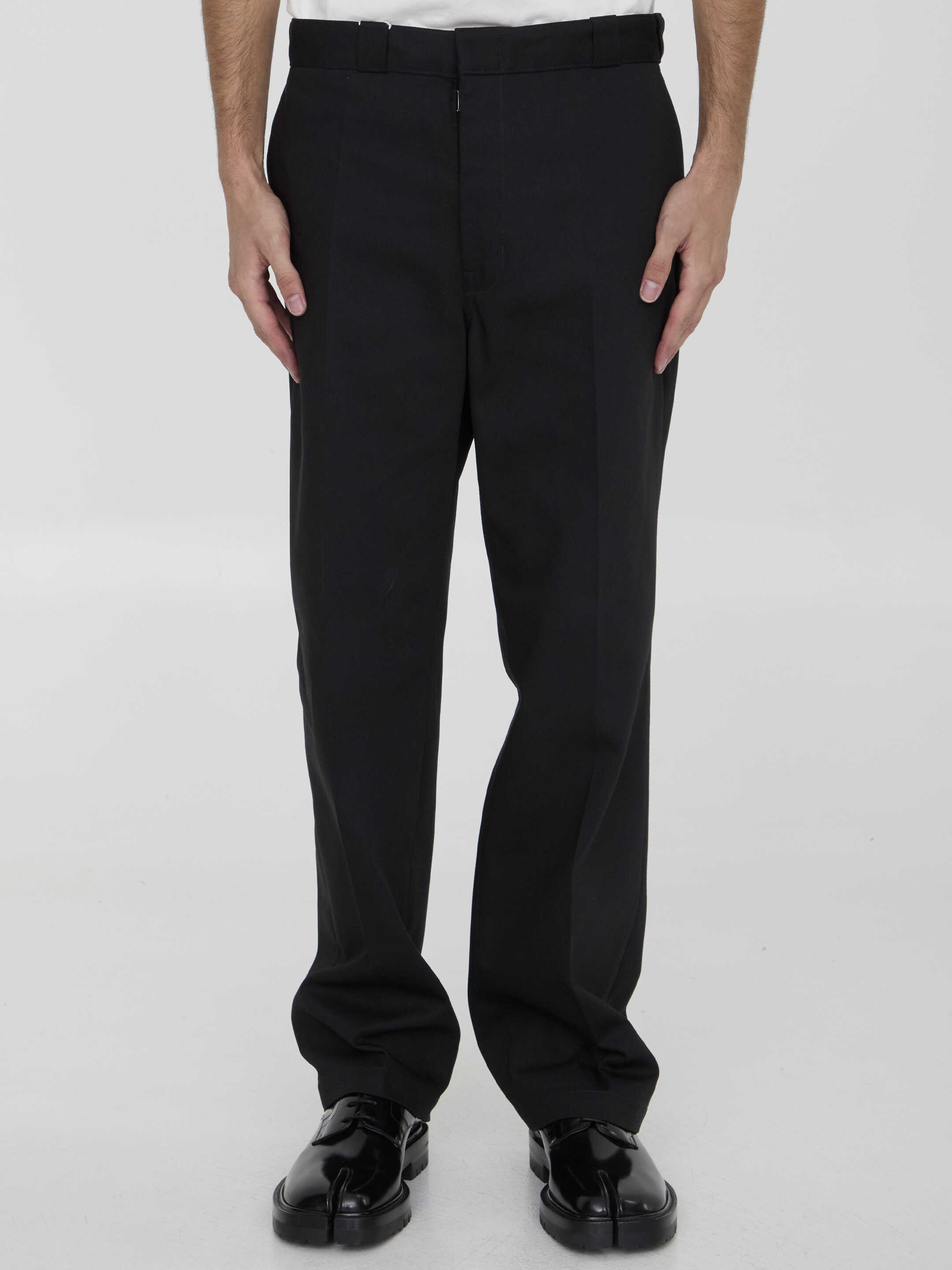 Straight-leg pleated trousers in black cotton blend twill with Four Stitches detail at the back. It features zip, button and hook closure, two side welt pockets, two rear welt pockets and belt loops. Regular fit.