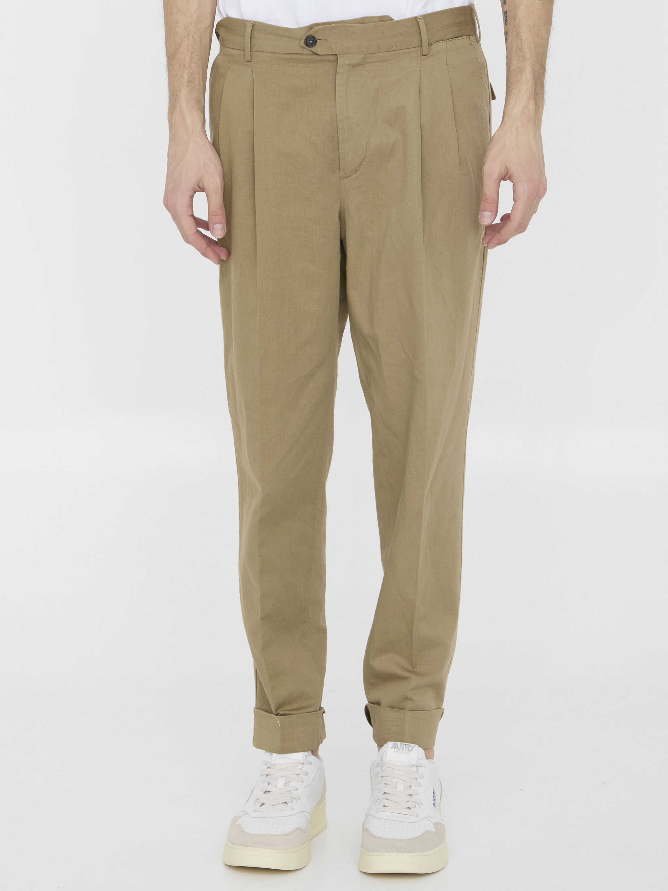 Straight-leg trousers in beige cotton and linen. It features zip and button closure, two side welt pockets, two rear buttoned flap pockets, belt loops and cuffed hem. Regular fit.