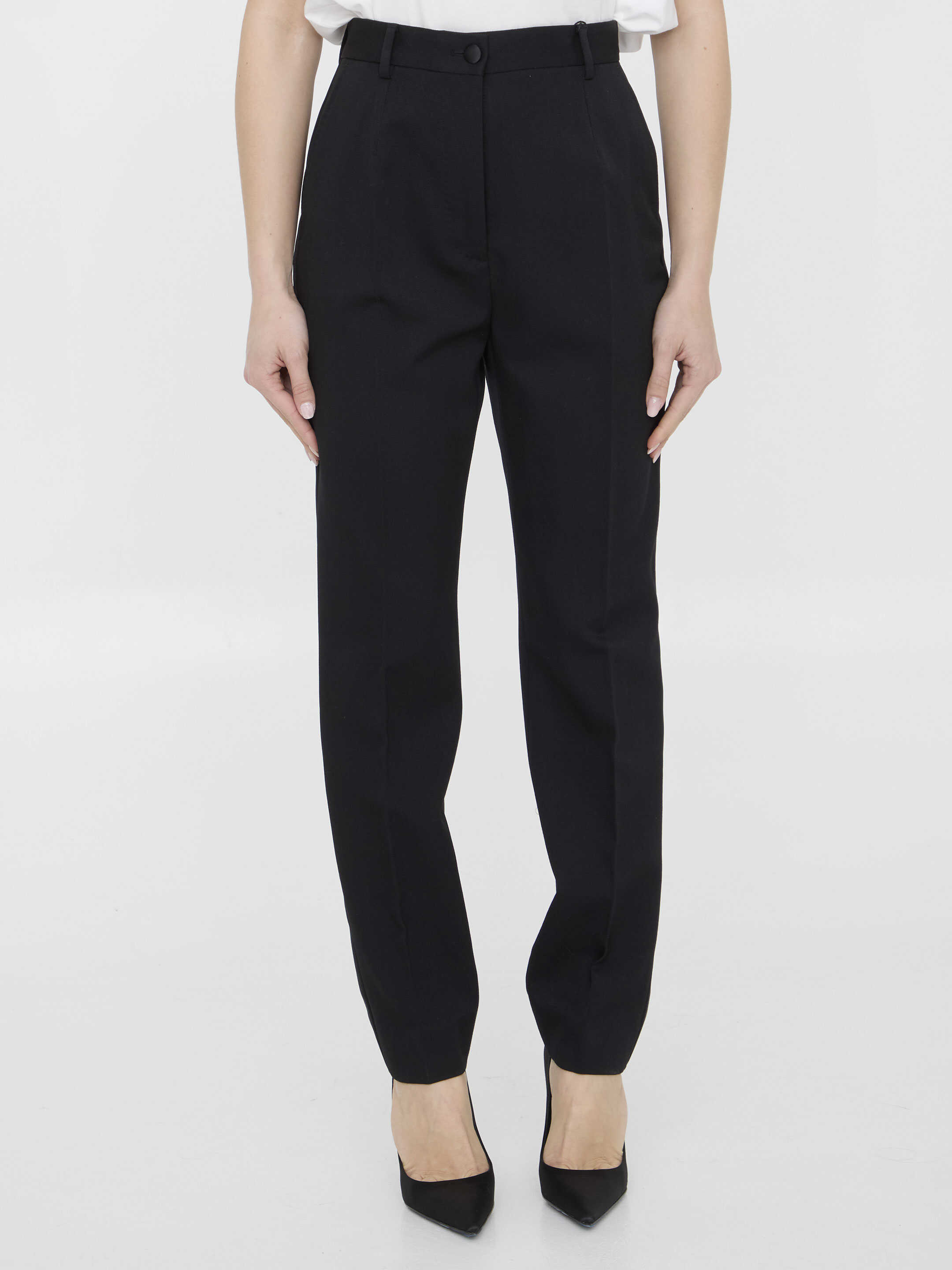 High-waisted black wool gabardine cigarette pants with side silk details. It features zip and button closure, two side welt pockets and two rear welt pockets. Belt loops. Slim fit.