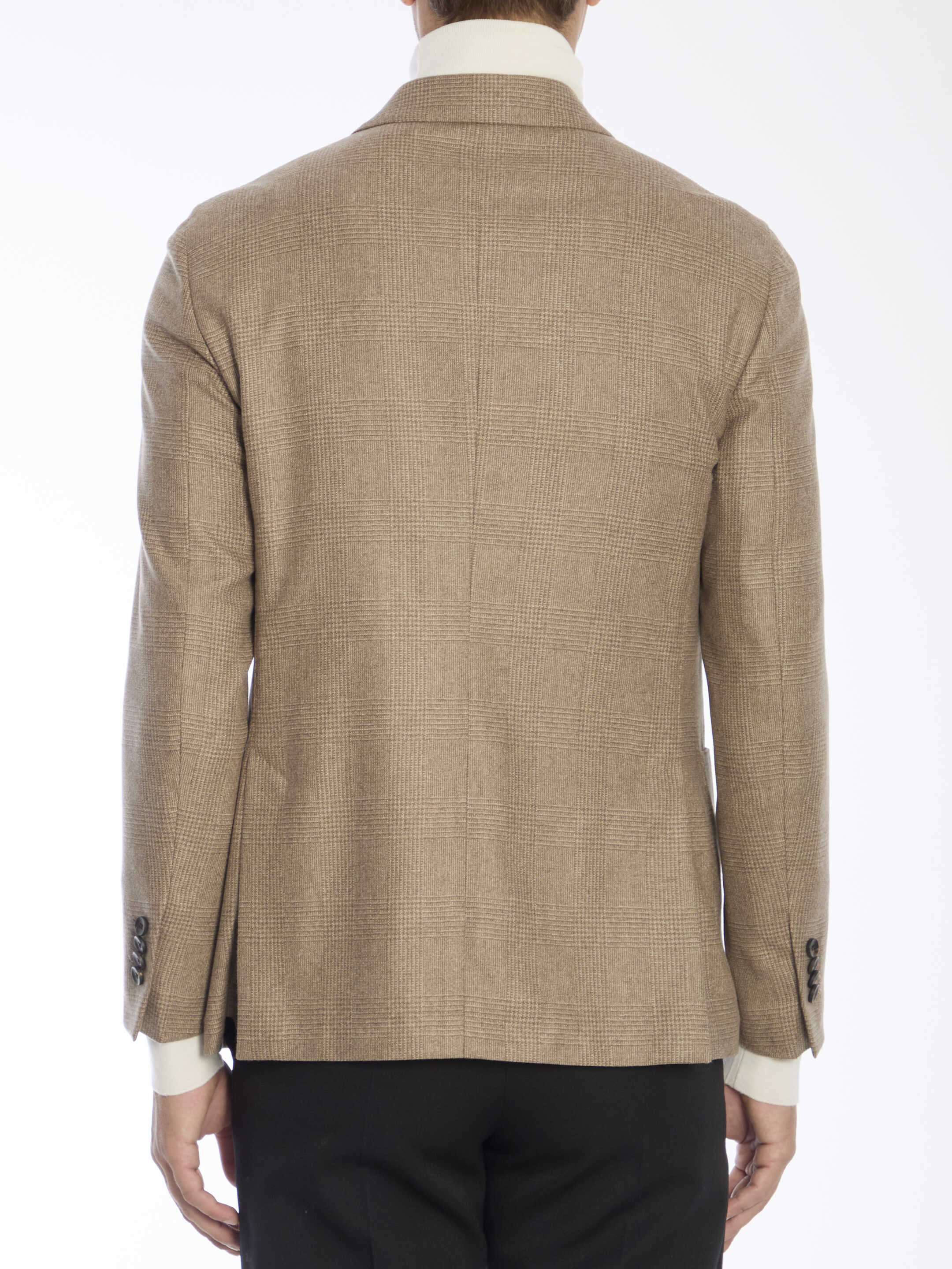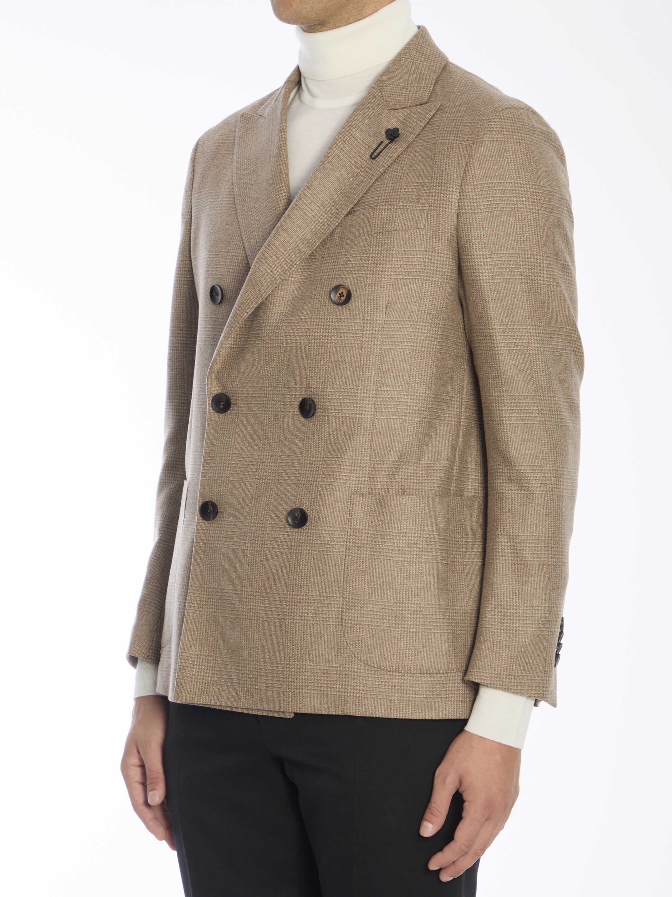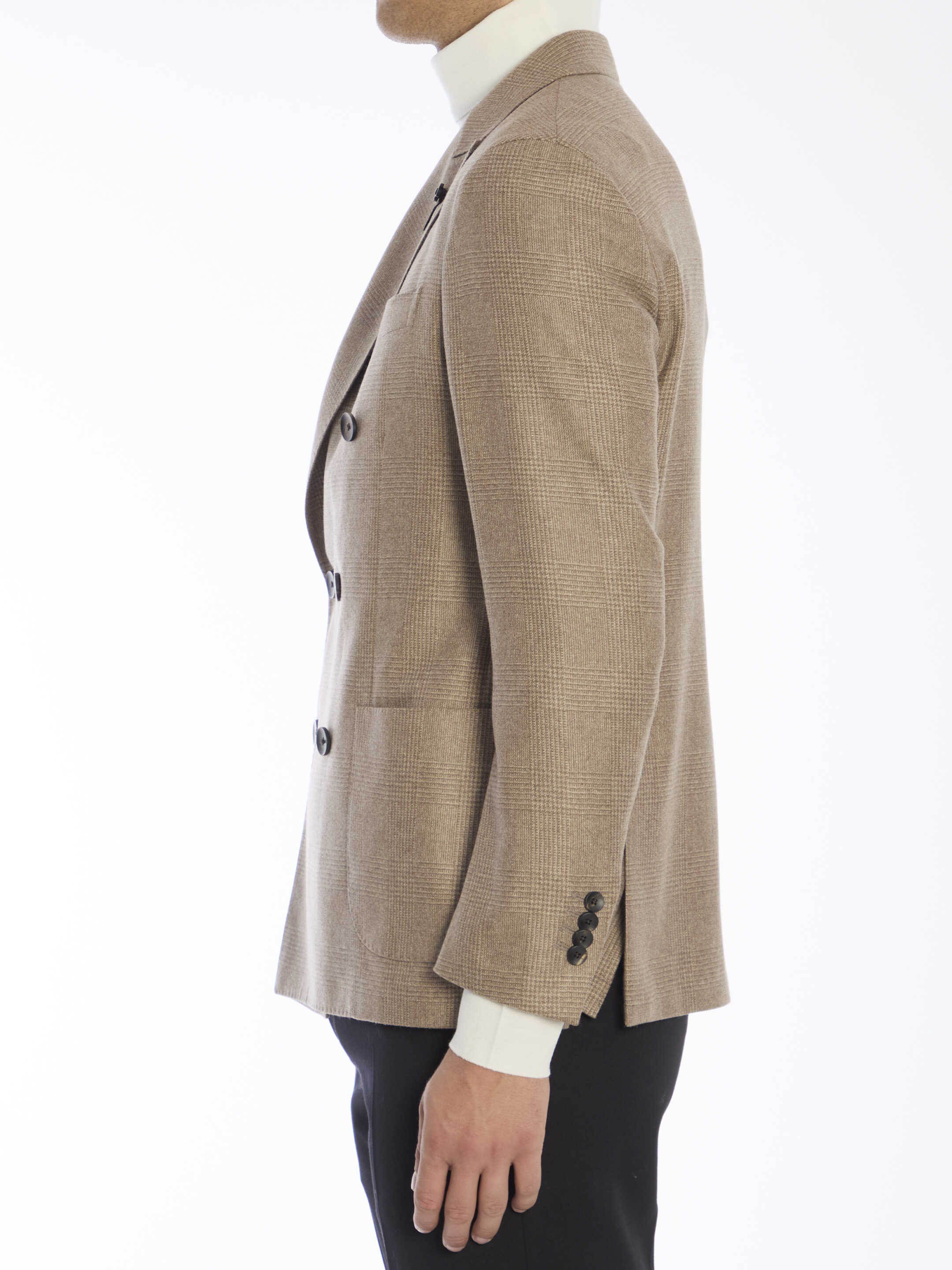 Double-breasted jacket in beige cashmere with check motif. It features peaked lapels with brooch on lapel, front button closure, a welt pocket on chest, two front patch pockets and buttoned cuffs. Regular fit.