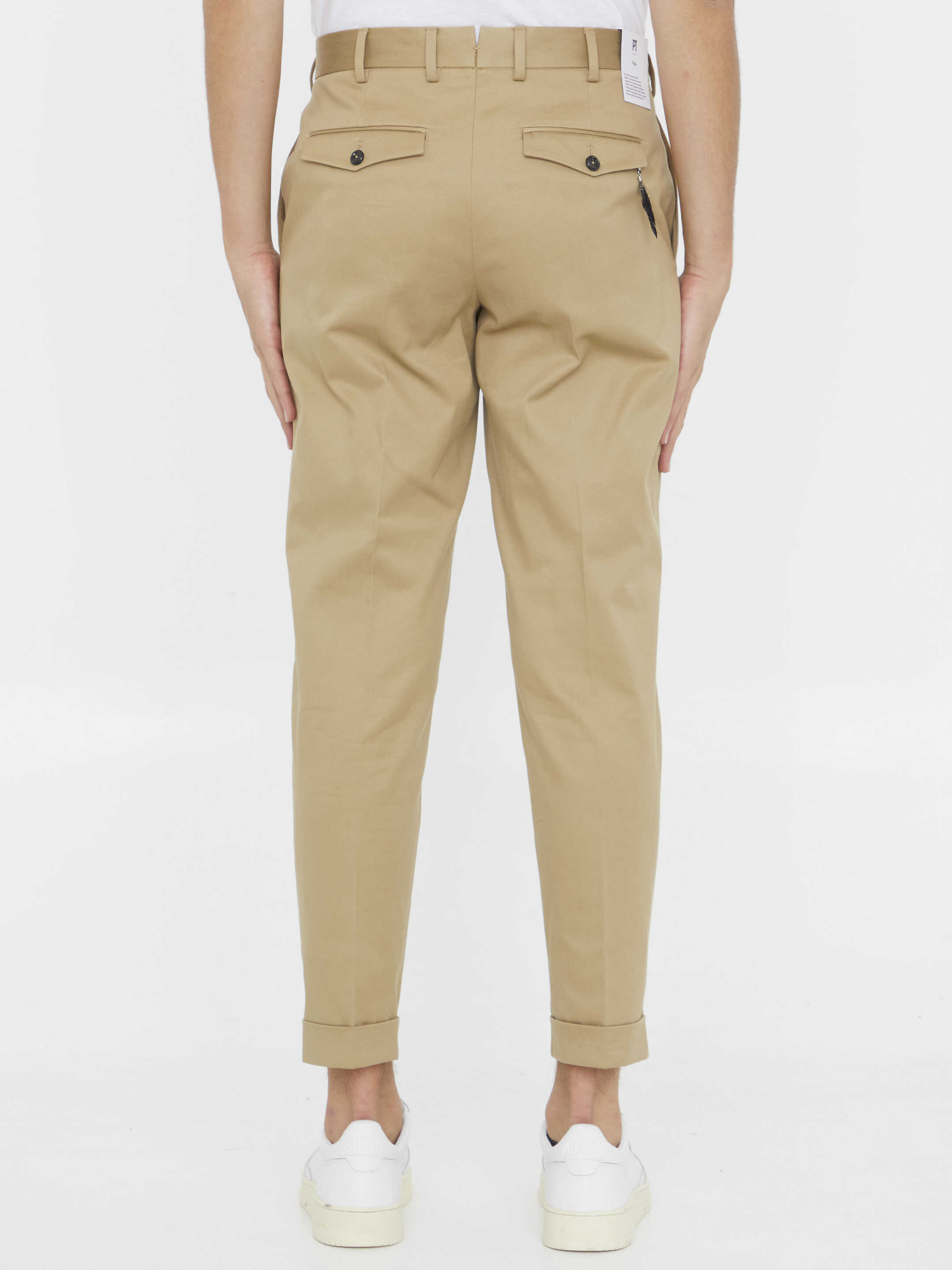 Beige cotton trousers with pleats. It features zip, button and hook-and-eye closure, two side welt pockets, two rear buttoned flap pockets and belt loops. Regular fit.