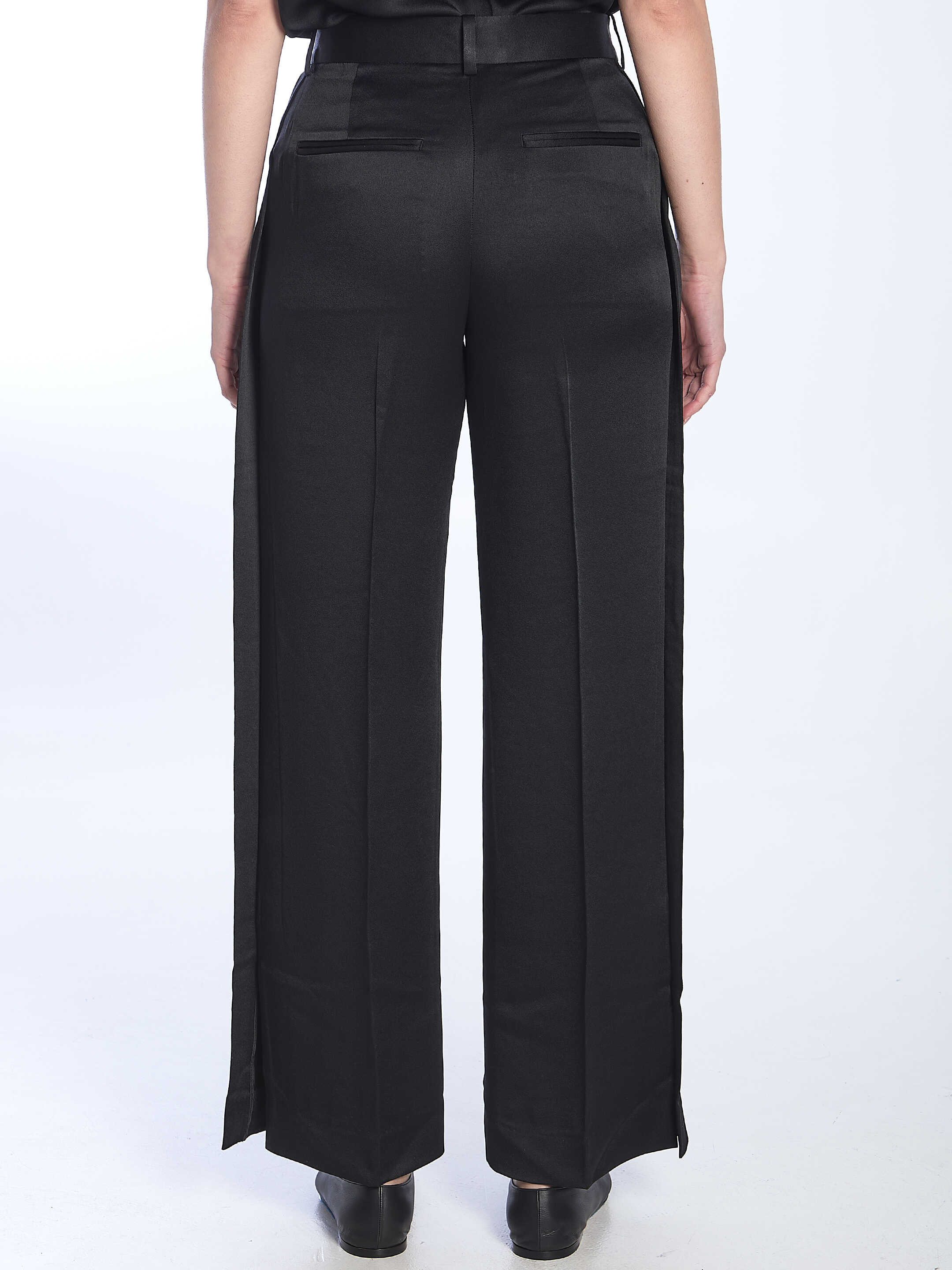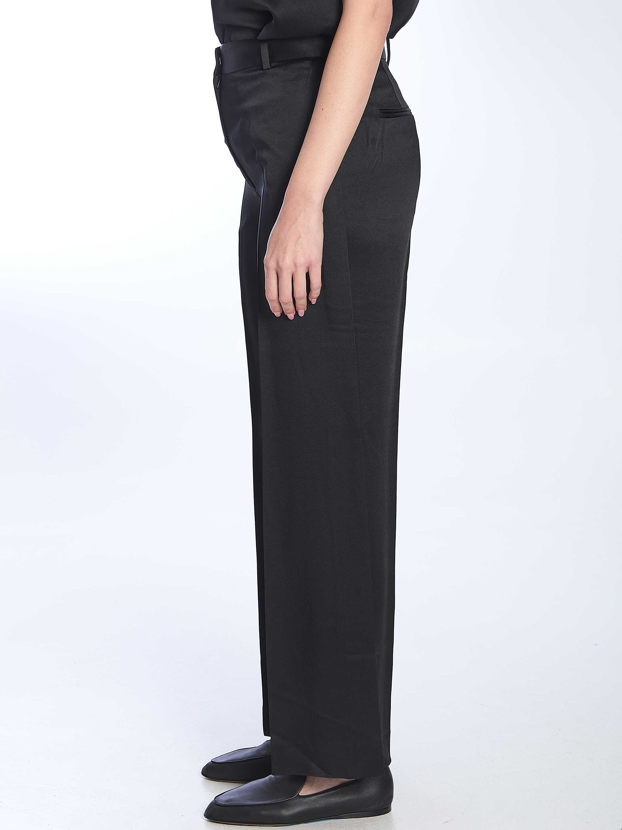 Black trousers with belt loops, side and back pockets, and a front zip closure. True to size.