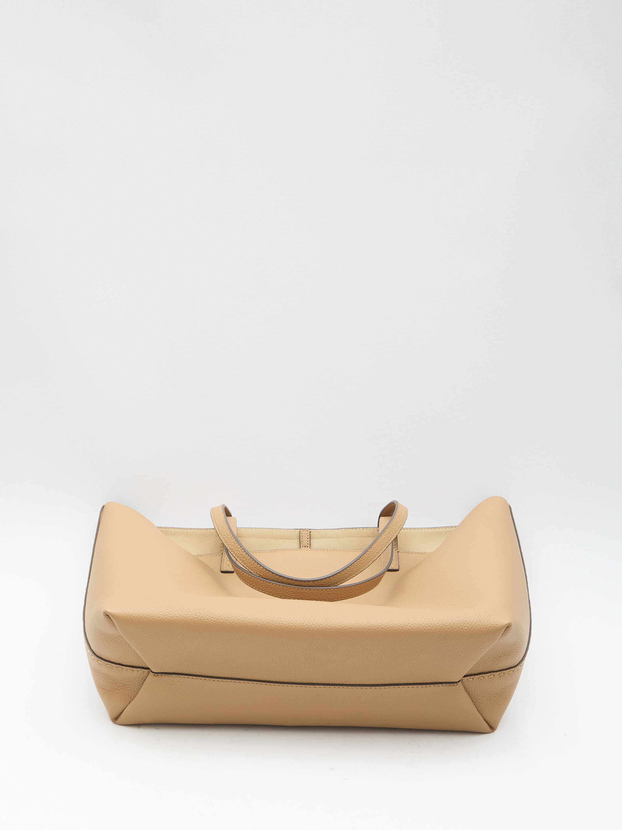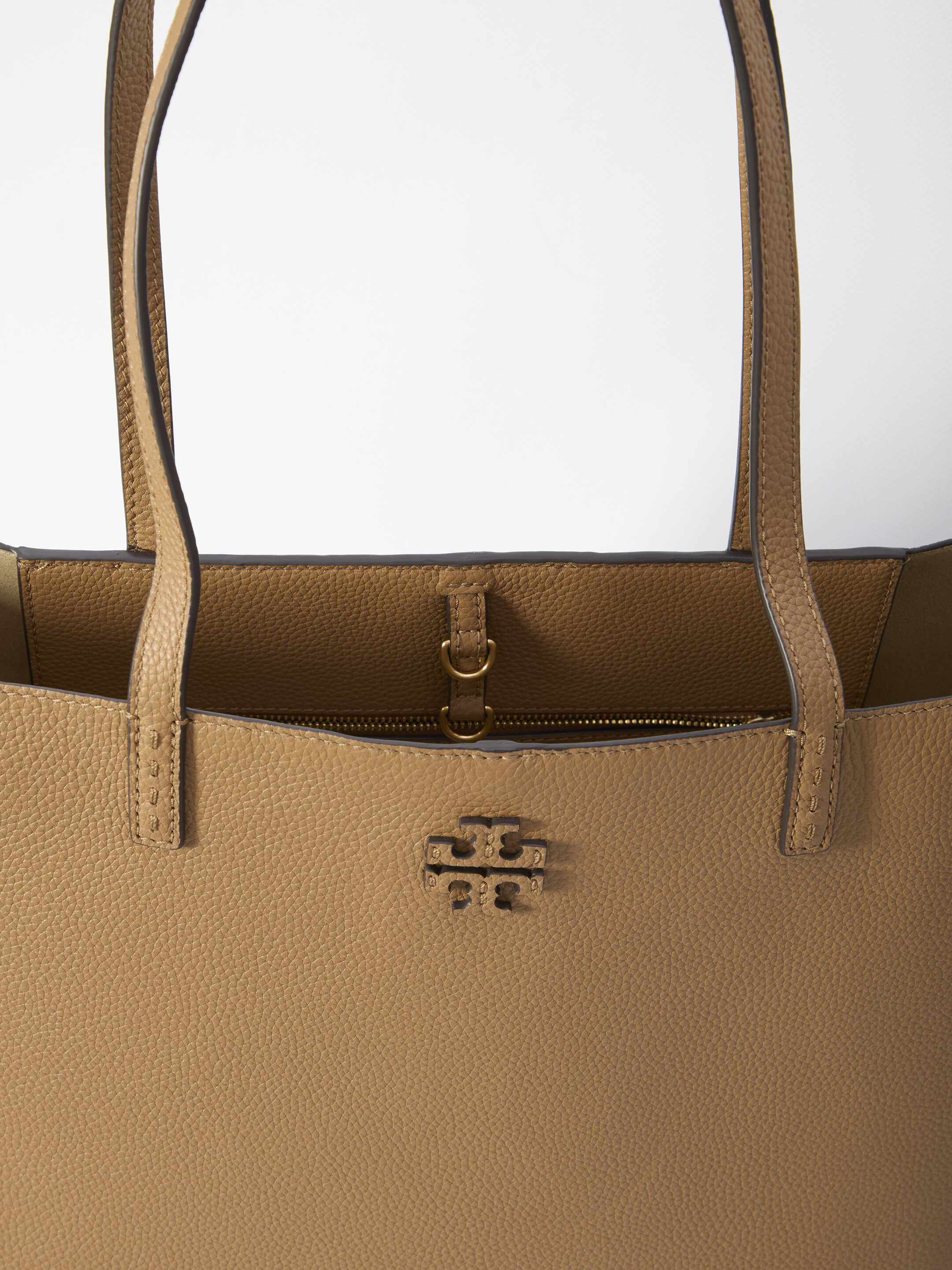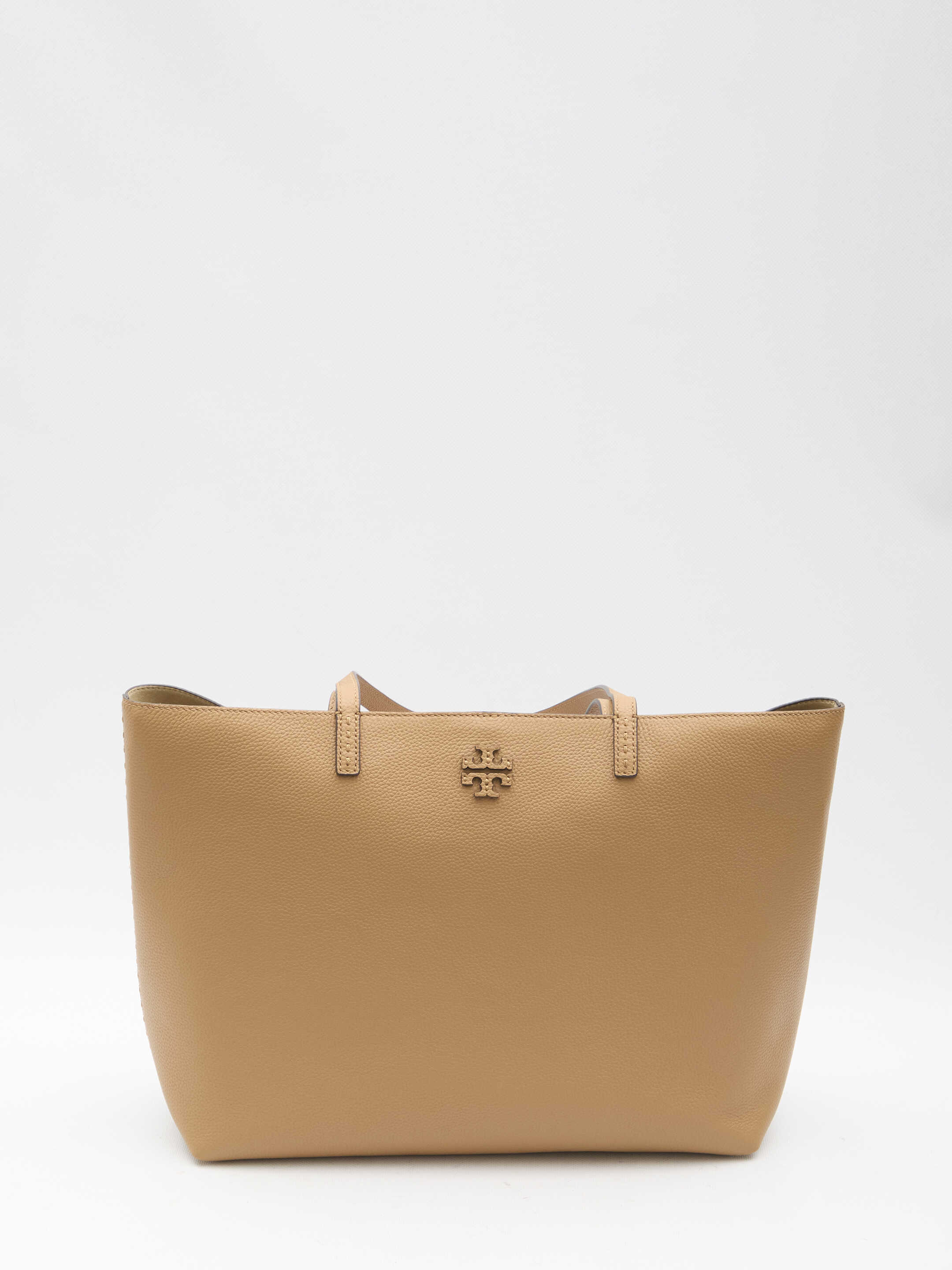 McGraw tote bag in brown grained leather with embossed Double T logo on the front. It features fixed double handles, interior hook closure, one main interior compartment and one interior zip pocket. Any leather imperfections are not to be considered manufacturing defects, but a peculiarity of the material.