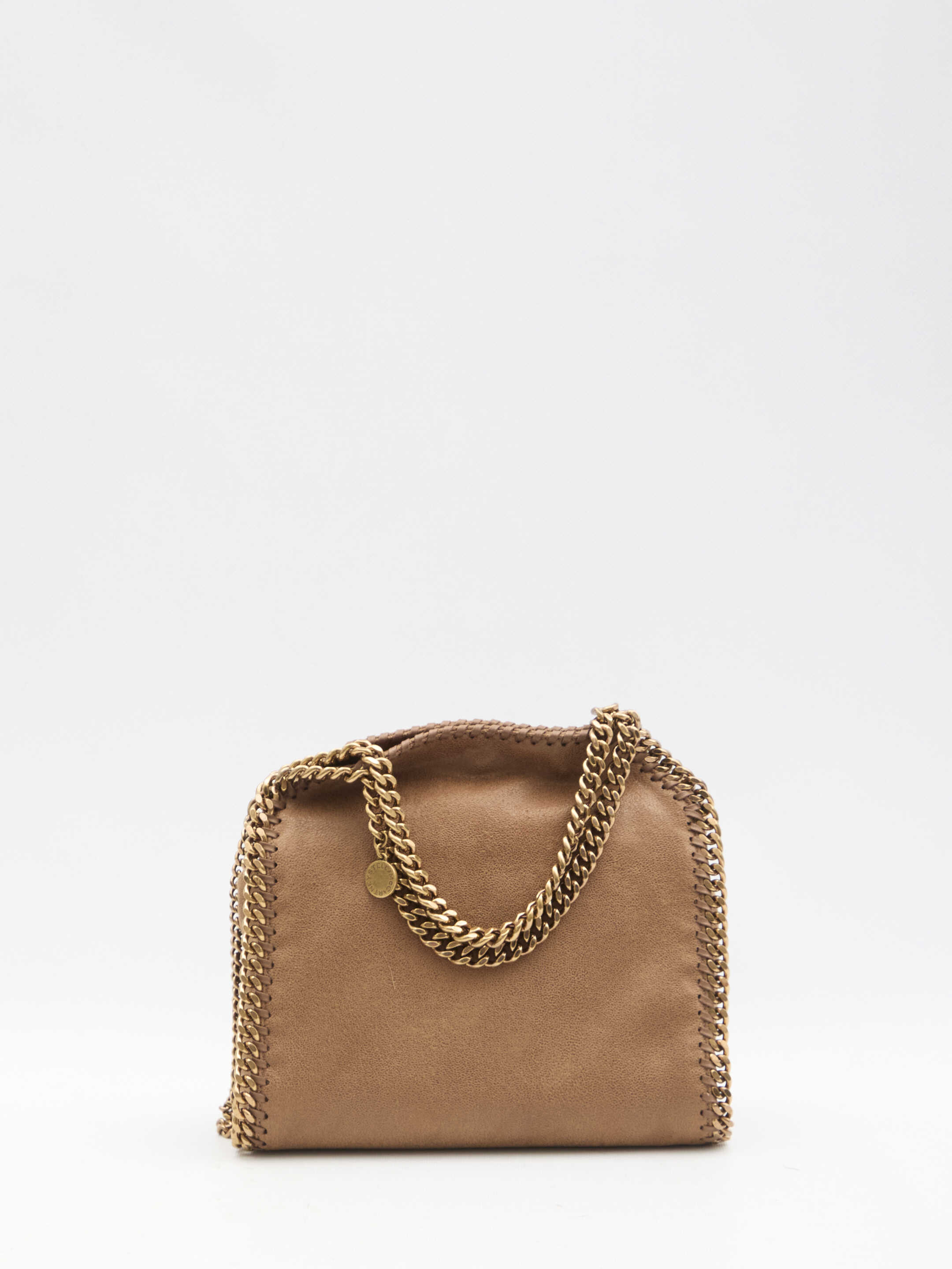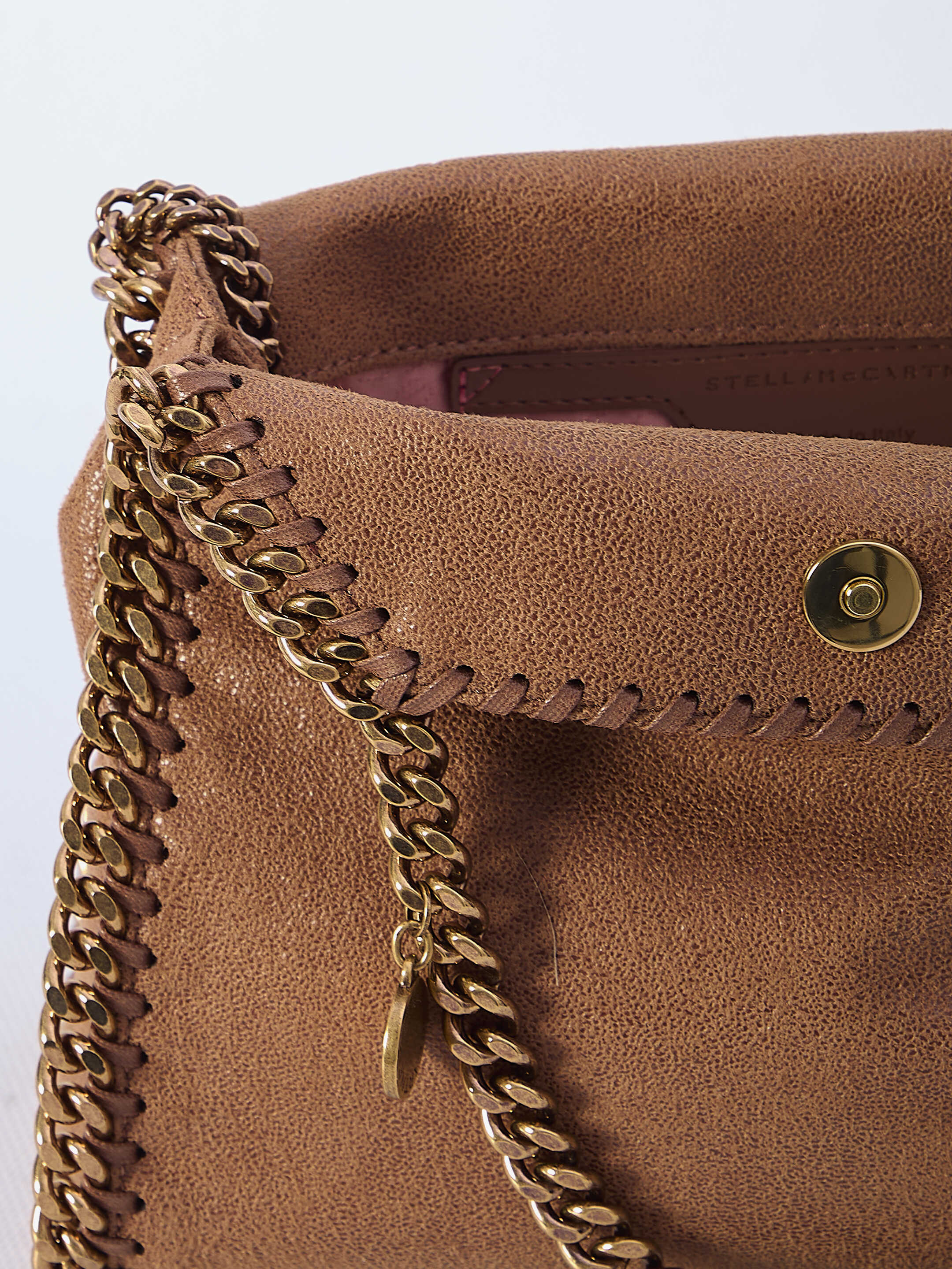 Falabella mini tote bag in pecan brown Shaggy Deer vegan fabric with diamond-cut chain in recycled brass and aluminum. It features double top chain handles, chain shoulder strap, magnetic closure, one main interior compartment and one interior slip pocket.