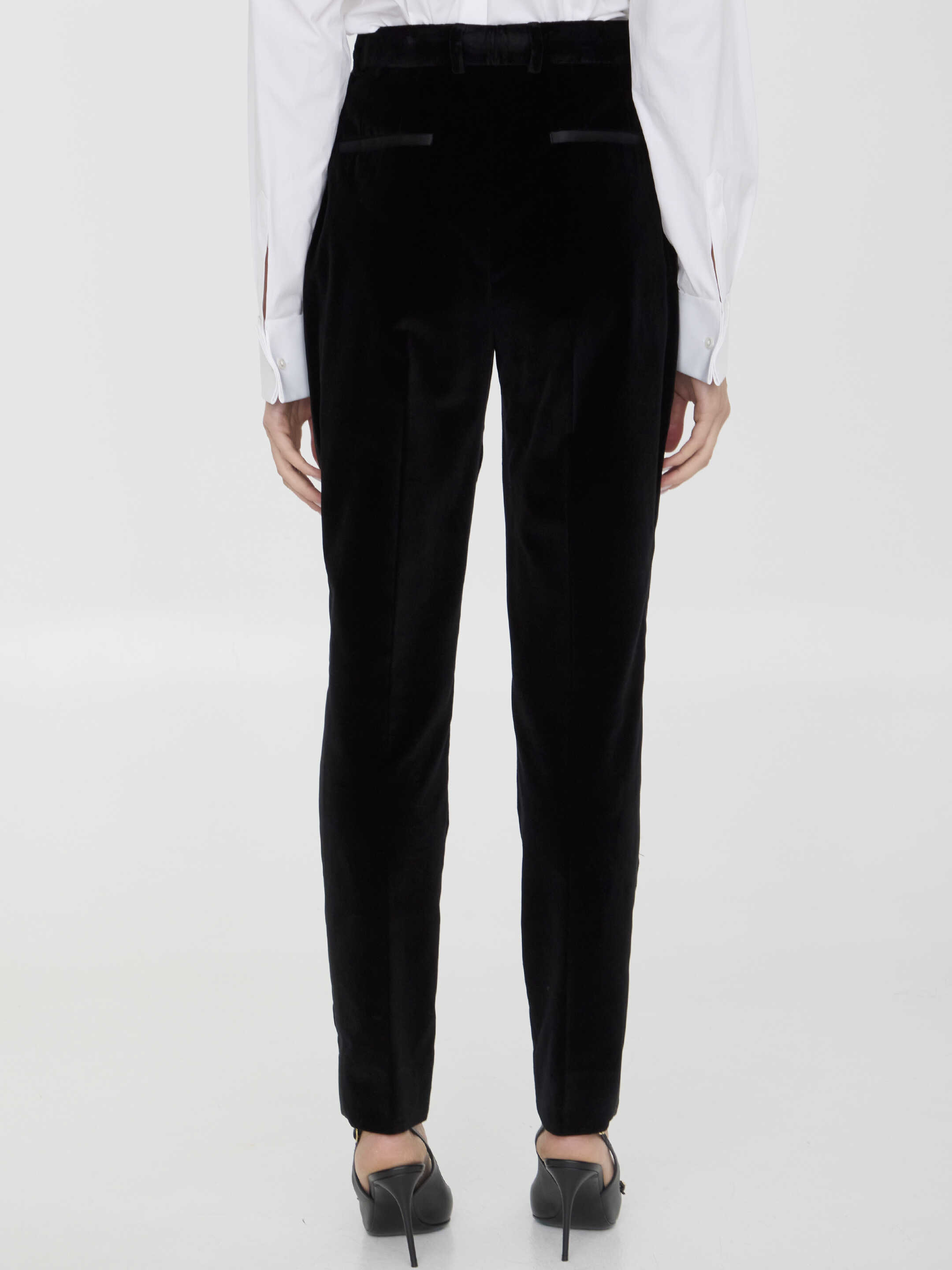 High-waisted tailored tuxedo pants in black velvet with side bands in silk duchesse. It features zip and button closure, two side welt pockets, two rear welt pockets and belt loops. Regular fit.