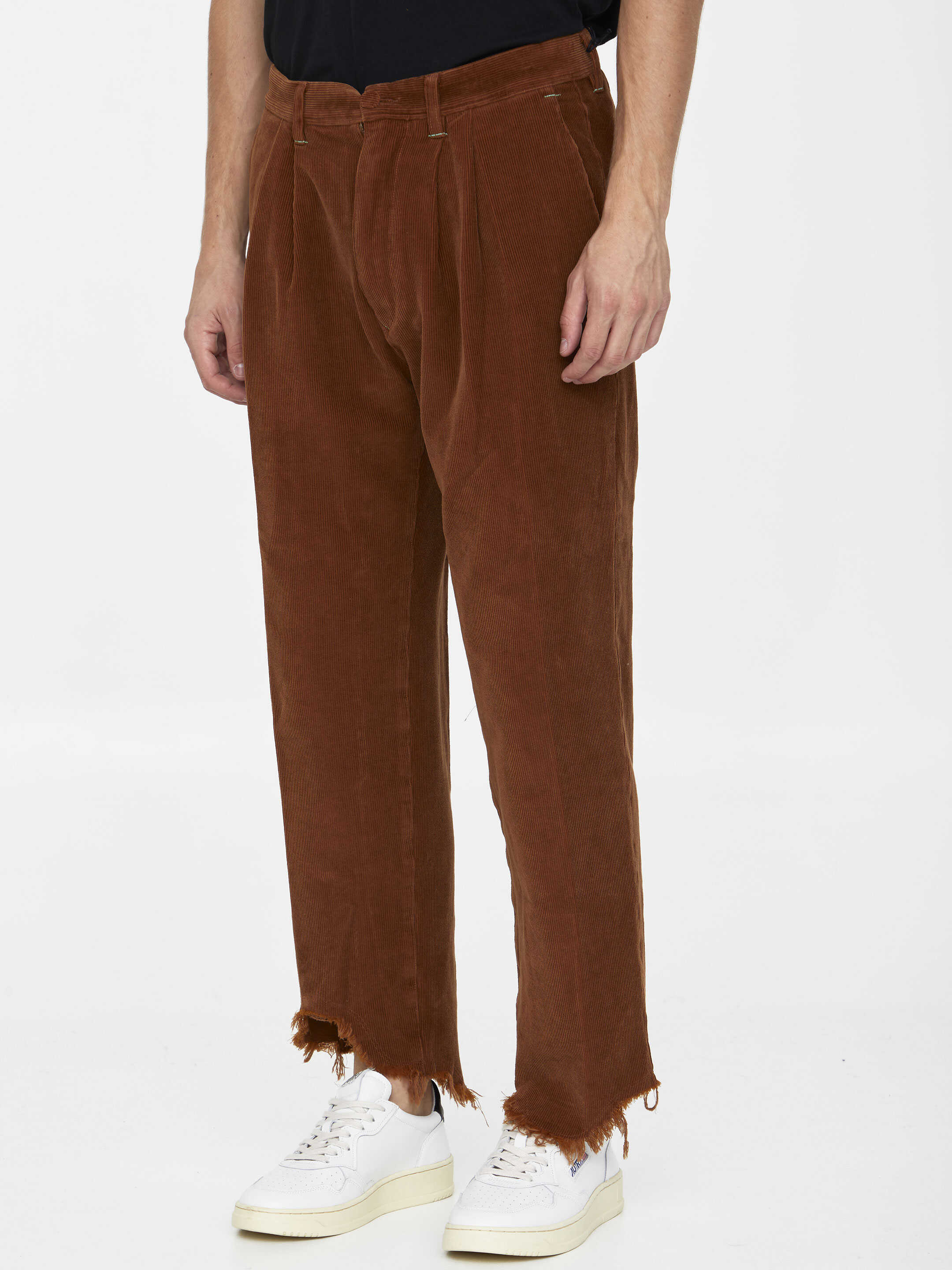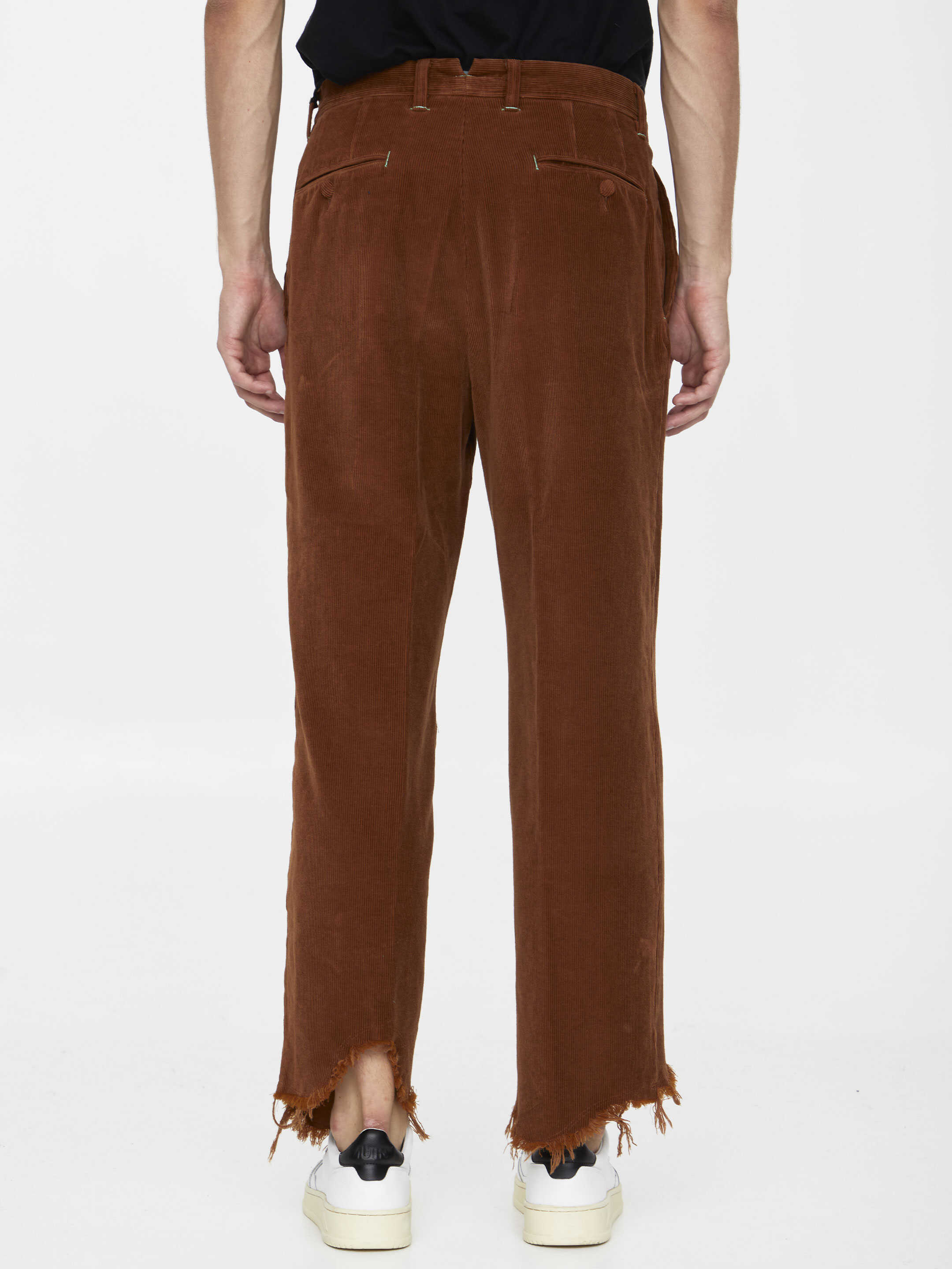 Cognac-colored corduroy trousers with fringed hems on the ankles. It features zip and button closure, contrasting drawstring, two side welt pockets, two rear welt pockets and belt loops.