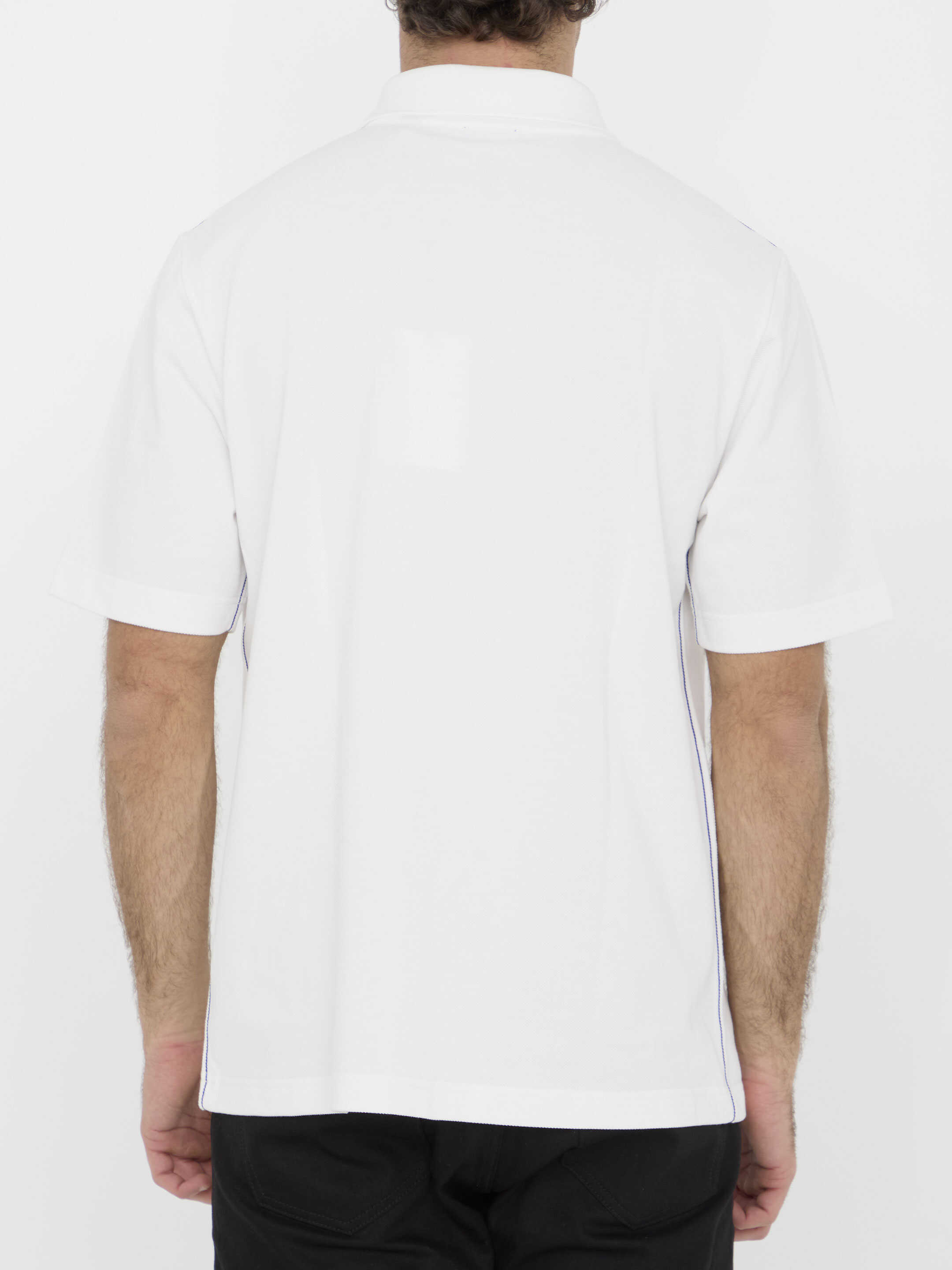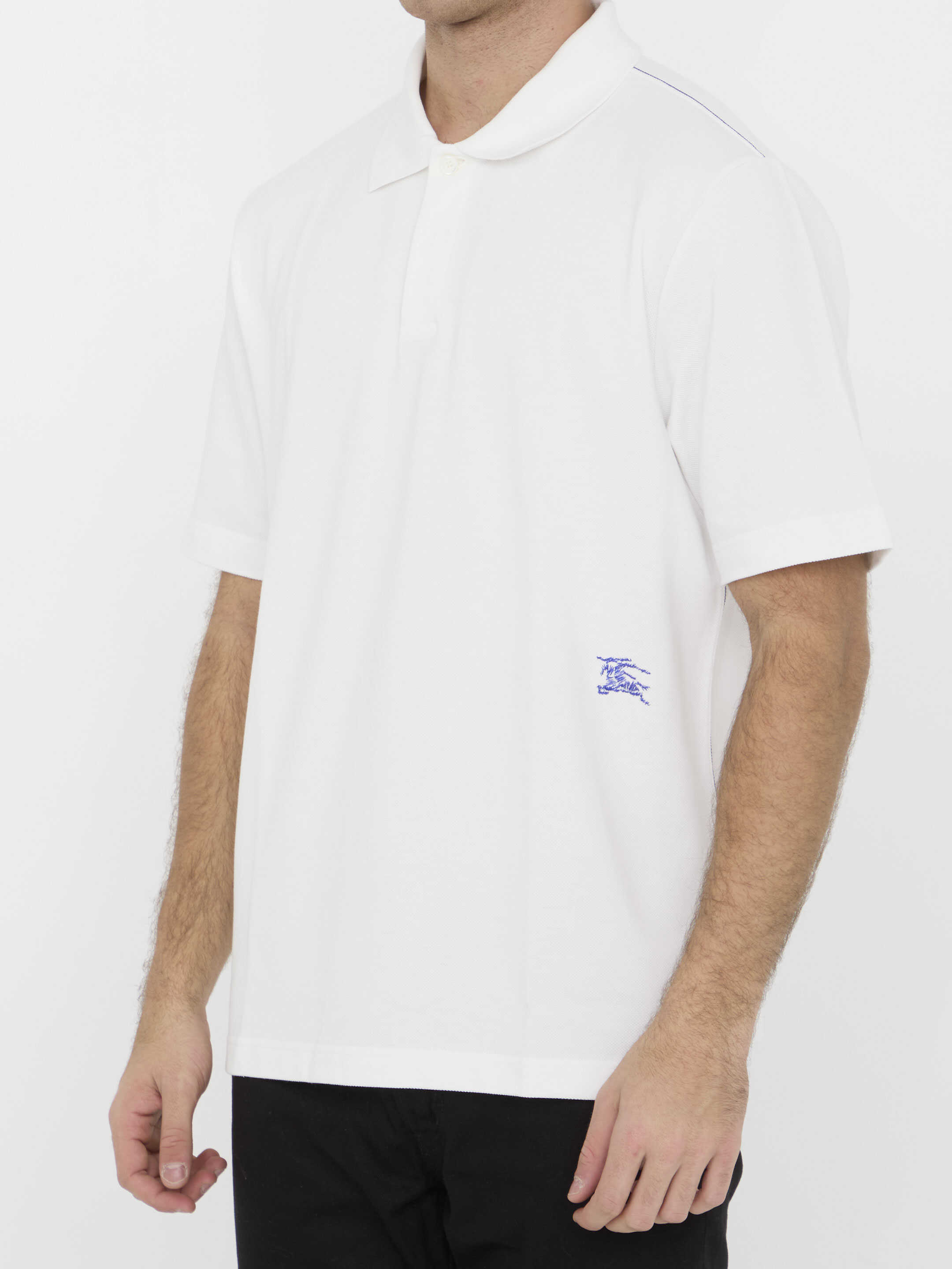 Short-sleeved polo shirt in white cotton piqué with contrast Equestrian Knight Design embroidered on the front. It features classic collar, front buttoned placket and contrast topstitching. Regular fit.