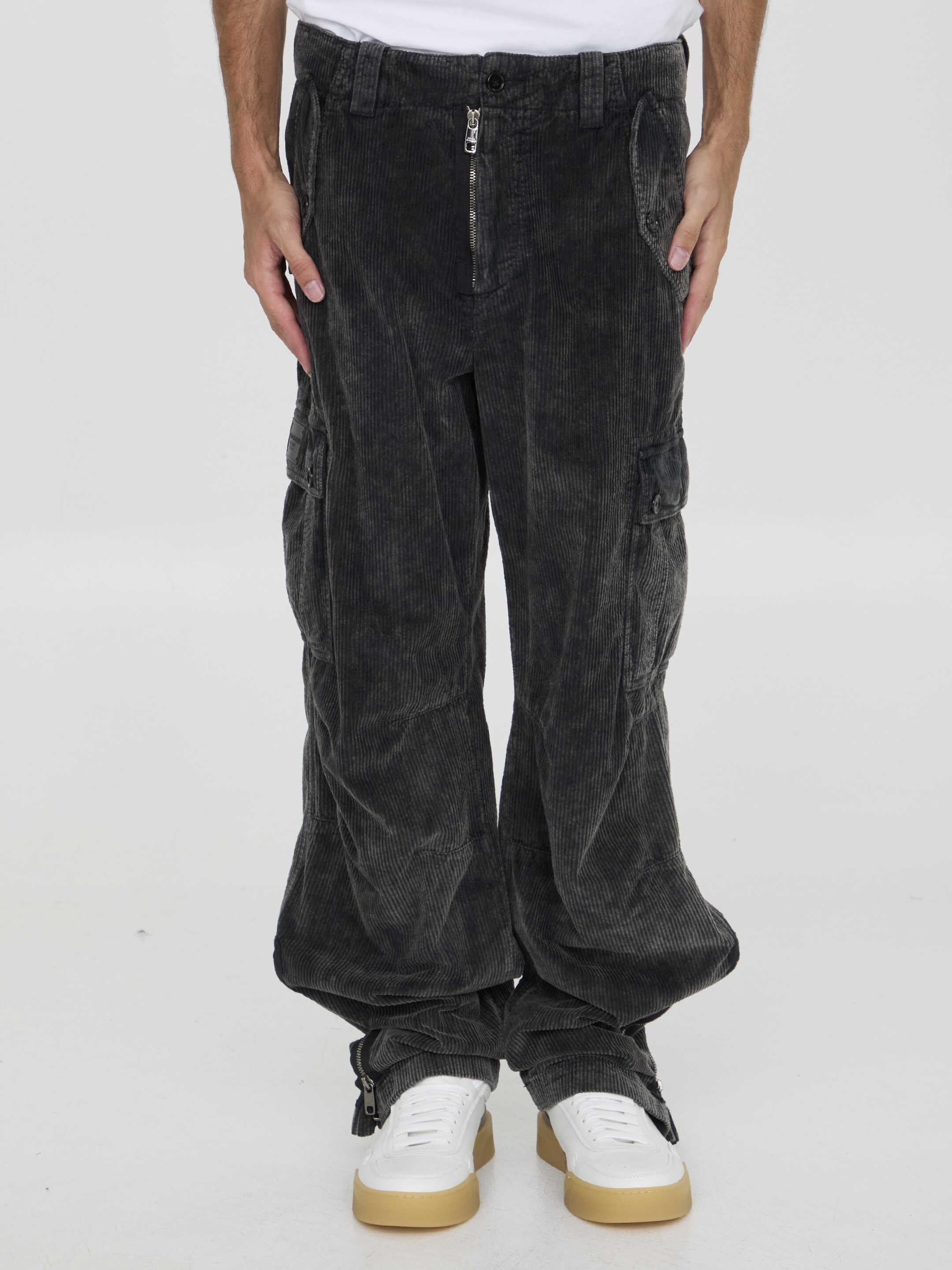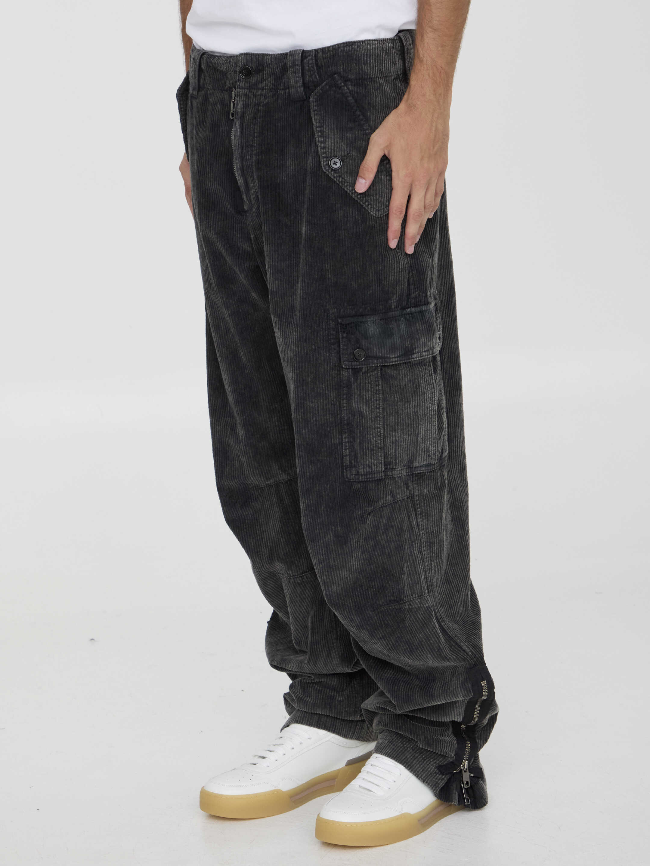 Black corduroy combat pants. Featuring a button and silver zip fly, two front flap pockets with snap buttons, cargo pockets with button closures and a tone-on-tone logo patch. Back pockets feature a zip and button closure, and a double zip at the bottom of the leg allows for adjustable width. The model is 189cm tall and wears a size 48 IT.