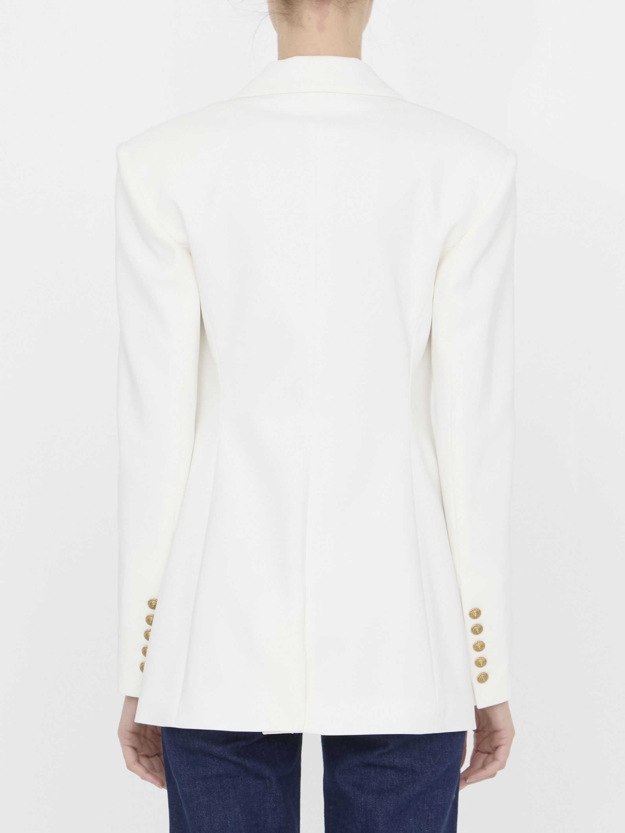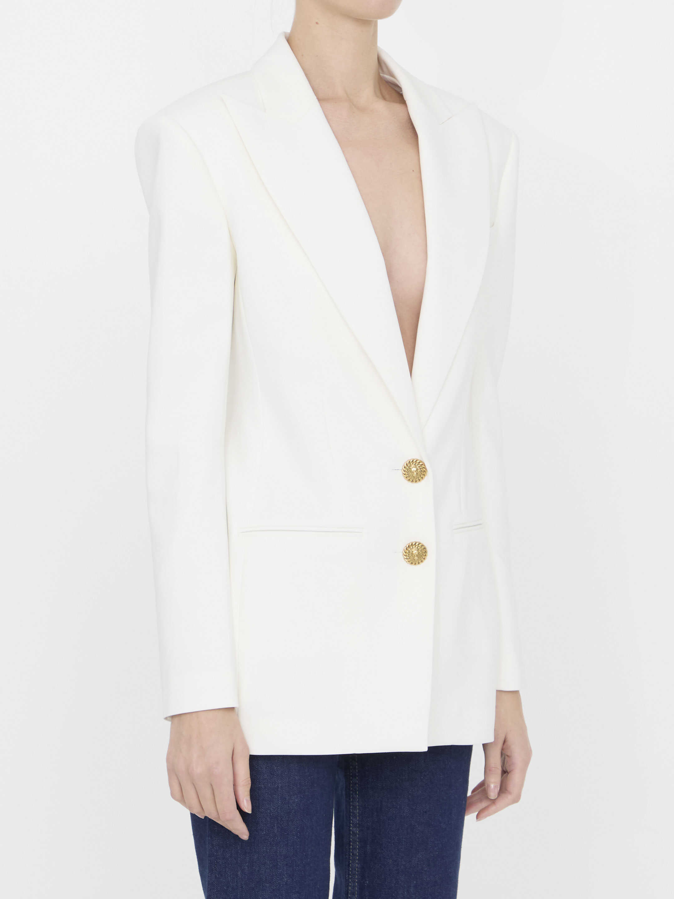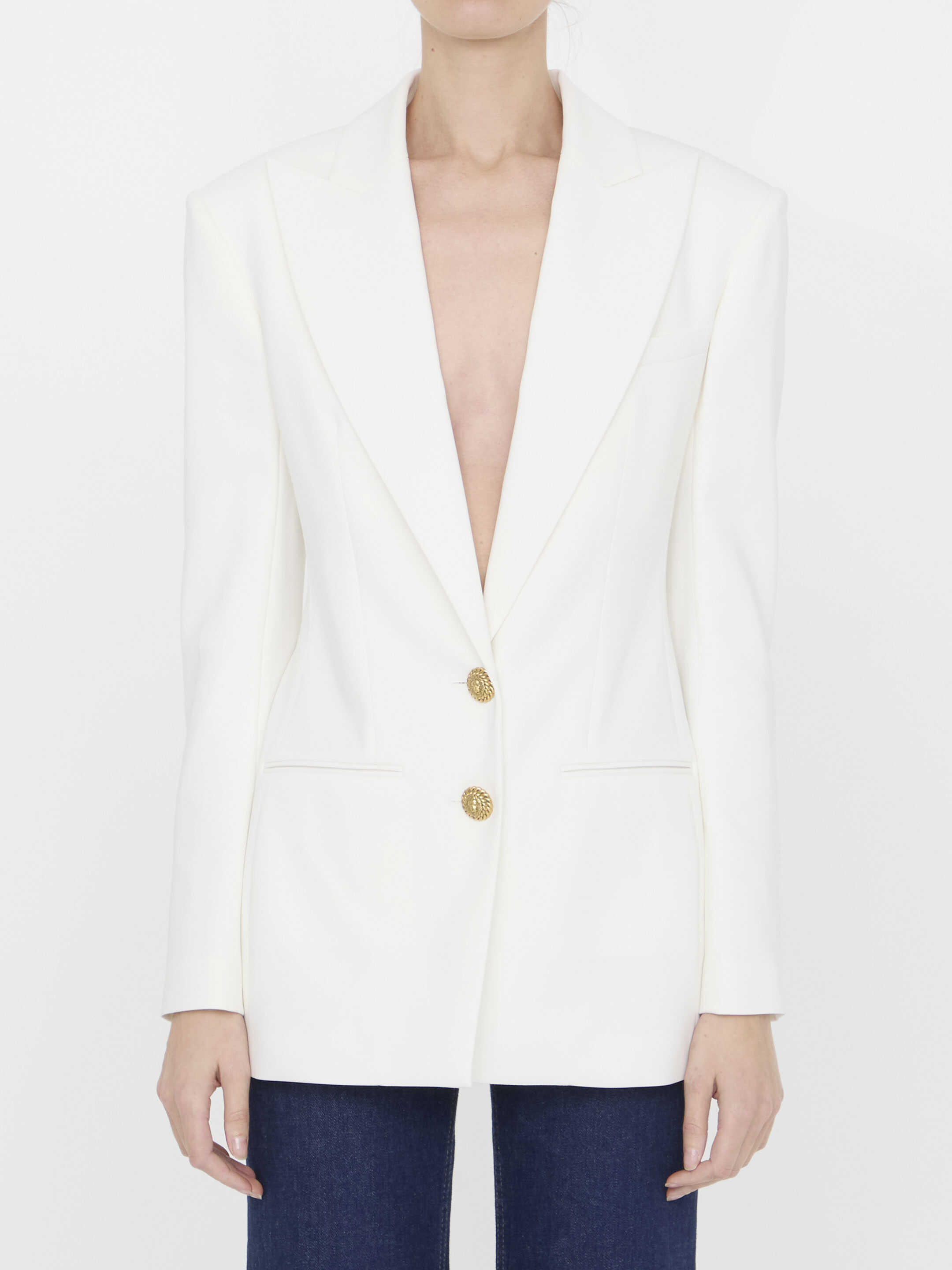 Single-breasted jacket in white crêpe with "Iconic Lion" buttons in gold-tone metal. It features structured shoulders, peaked lapels, front two-button closure, two front welt pockets, a welt pocket on chest and buttoned cuffs. Fitted cut.