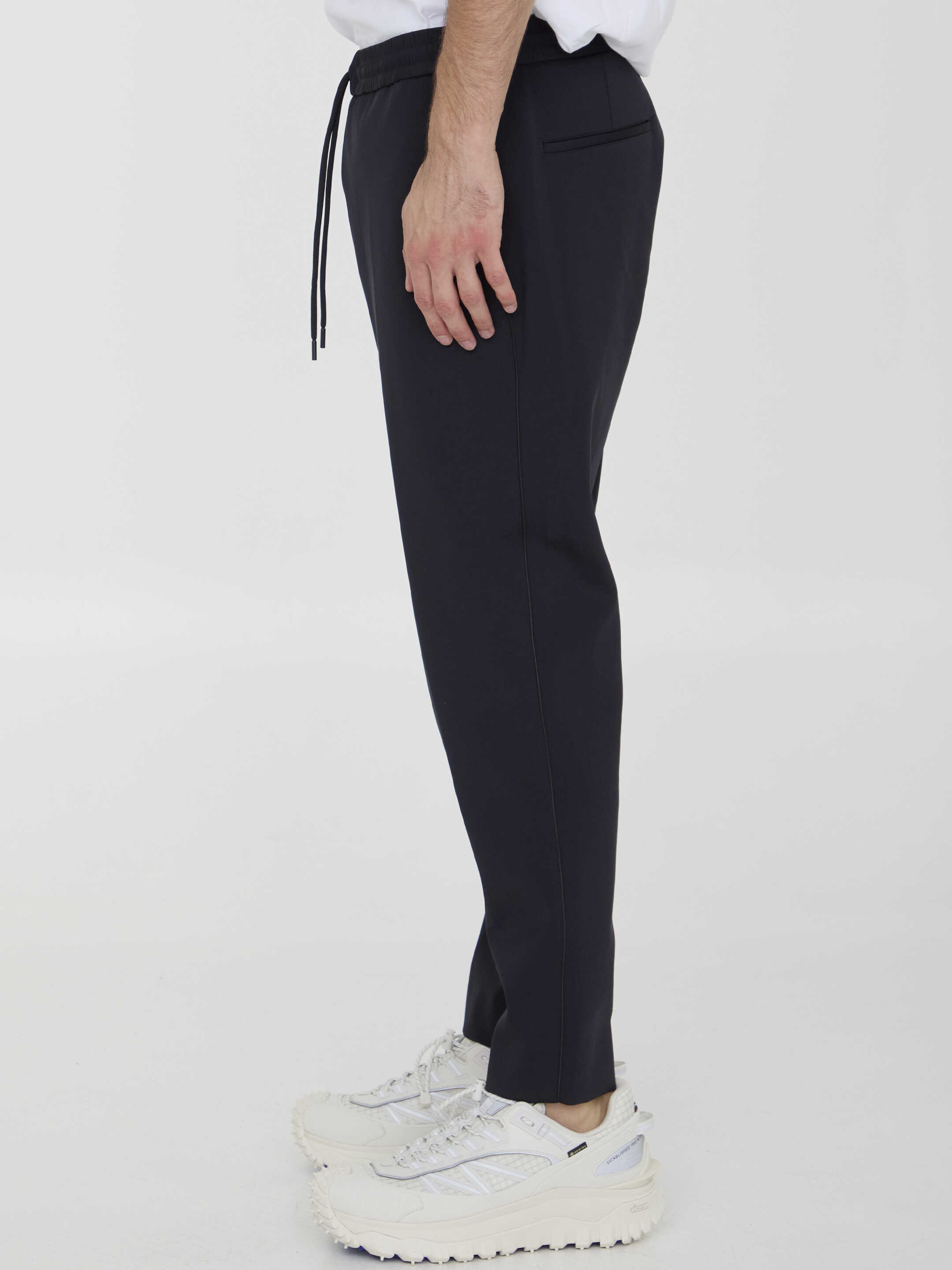 Black technical nylon pants. It features elasticated waistband with drawstring, two side welt pockets, two rear welt pockets and rear Moncler label. Regular fit.