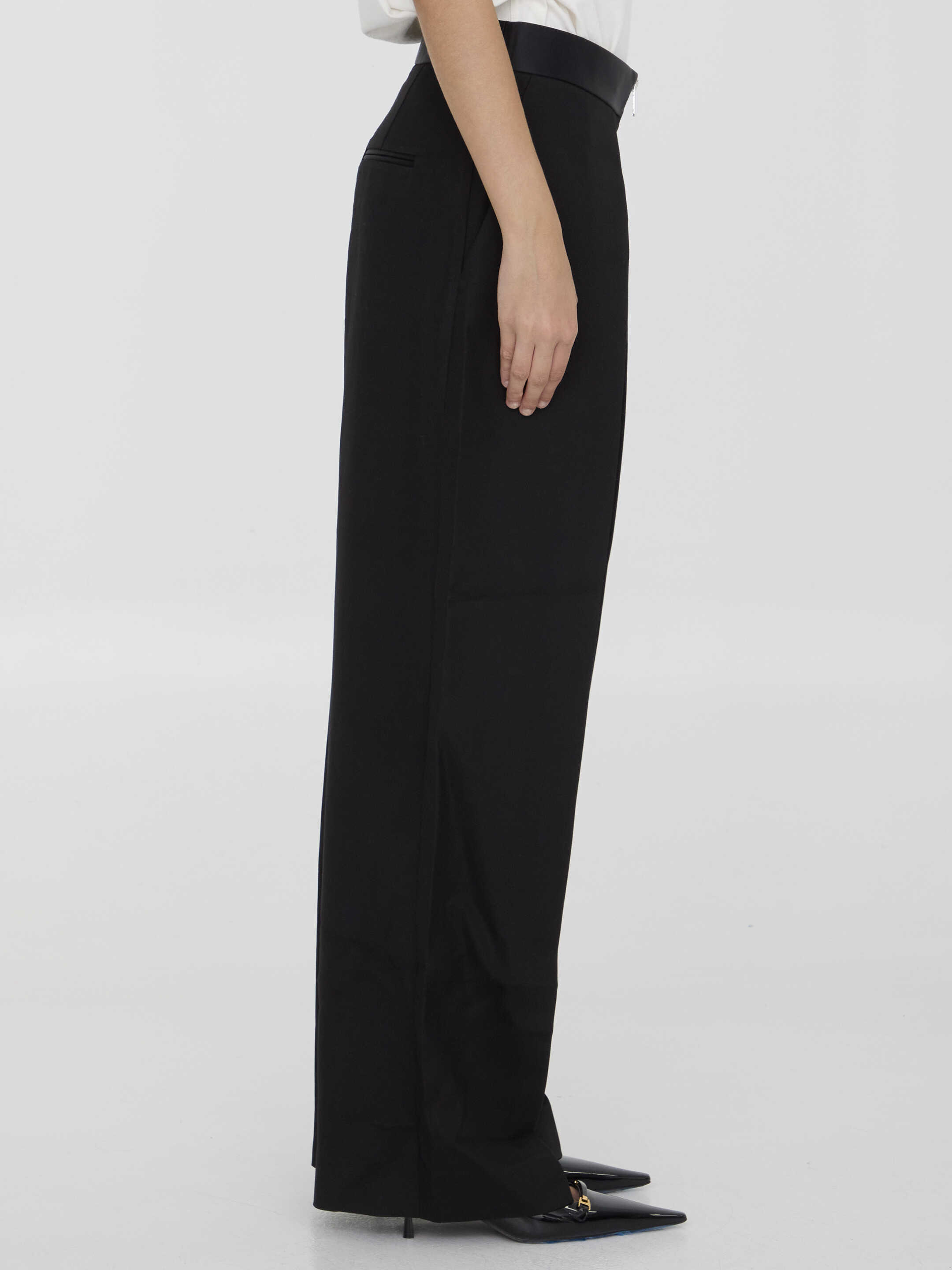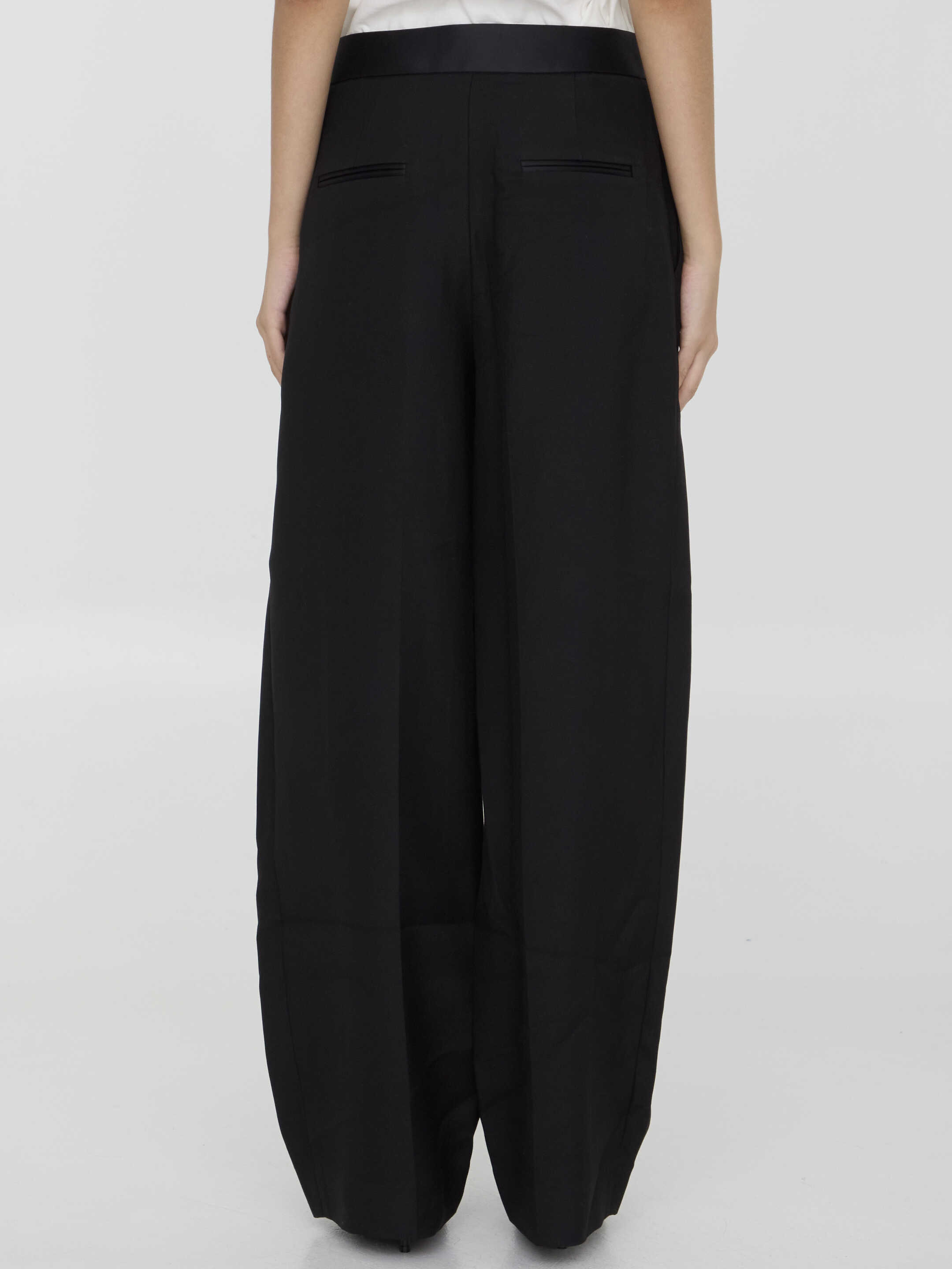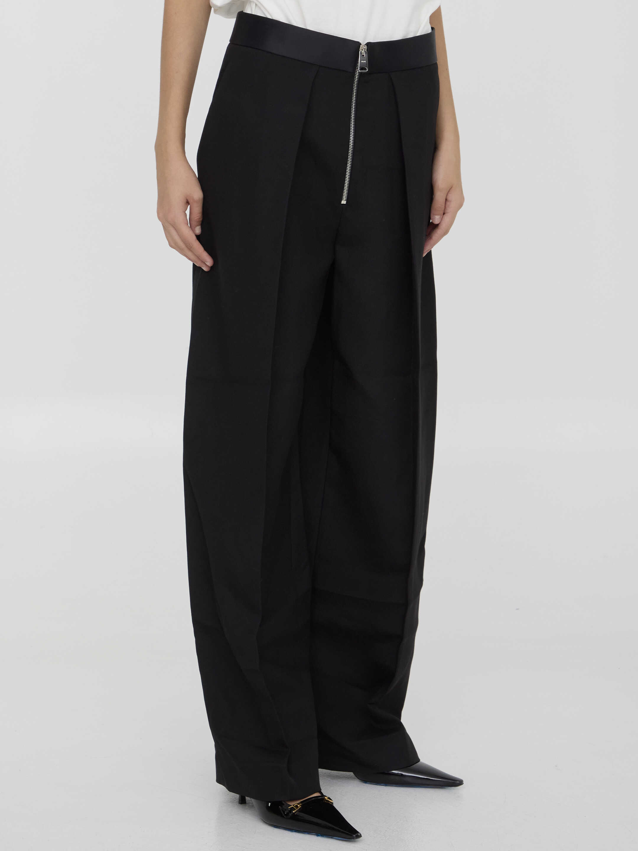 Marine pants in black viscose blend with satin detail at waistband. It features pleats, front zip and concealed button closure, two side welt pockets and two rear welt pockets. Regular fit.