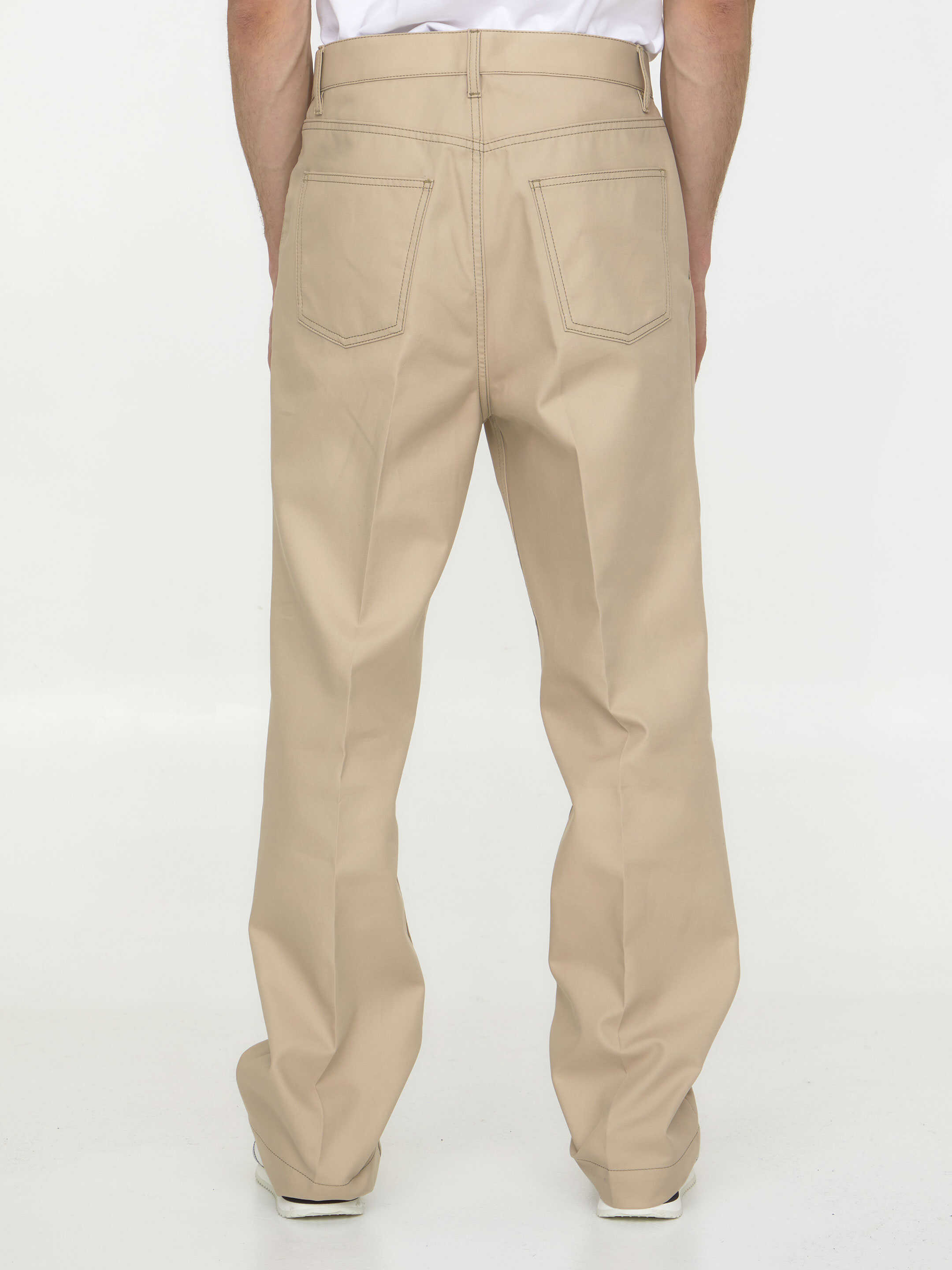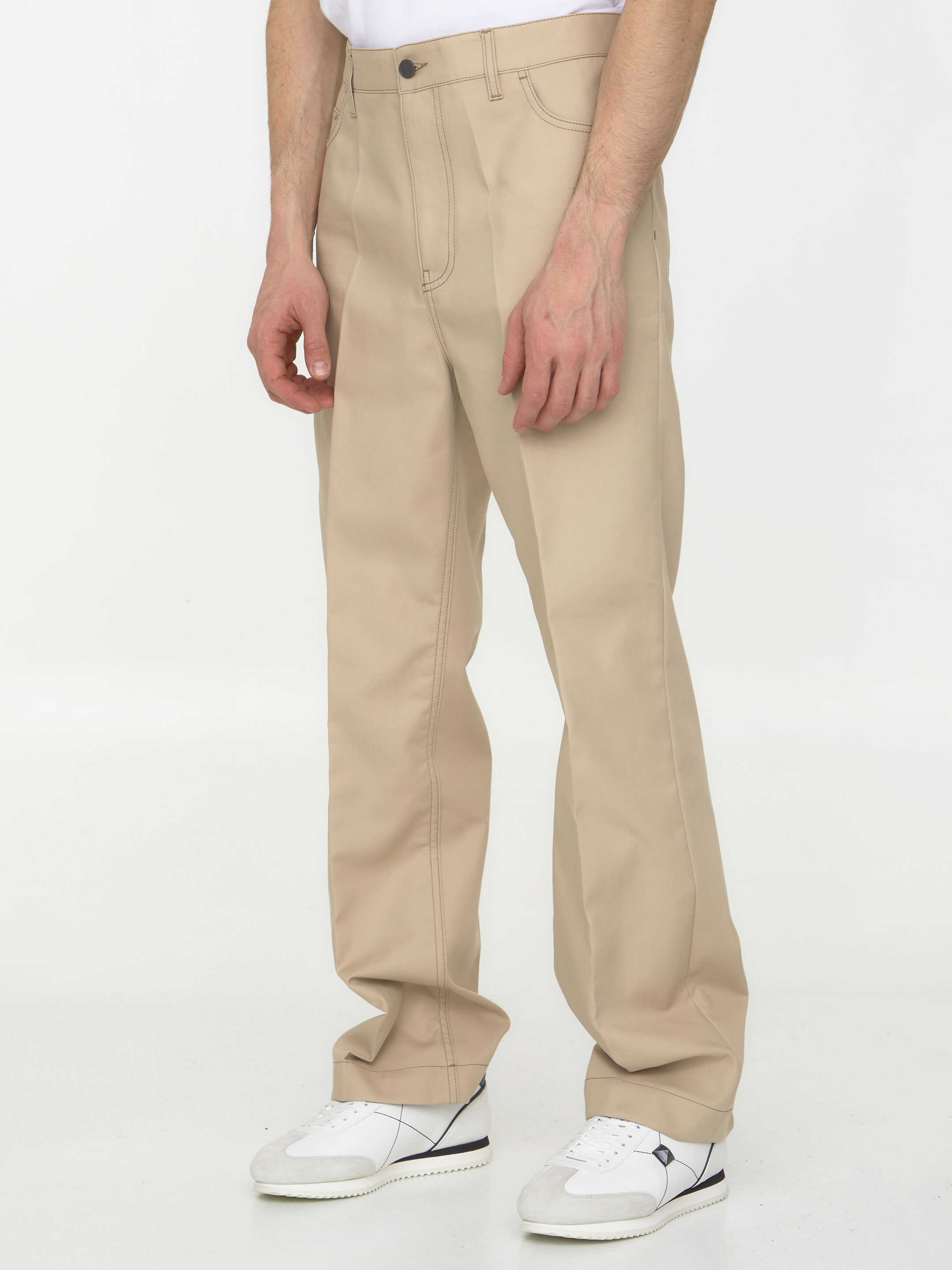 Beige cotton gabardine trousers. It features zip and button closure, five-pocket design and belt loops. Regular fit.