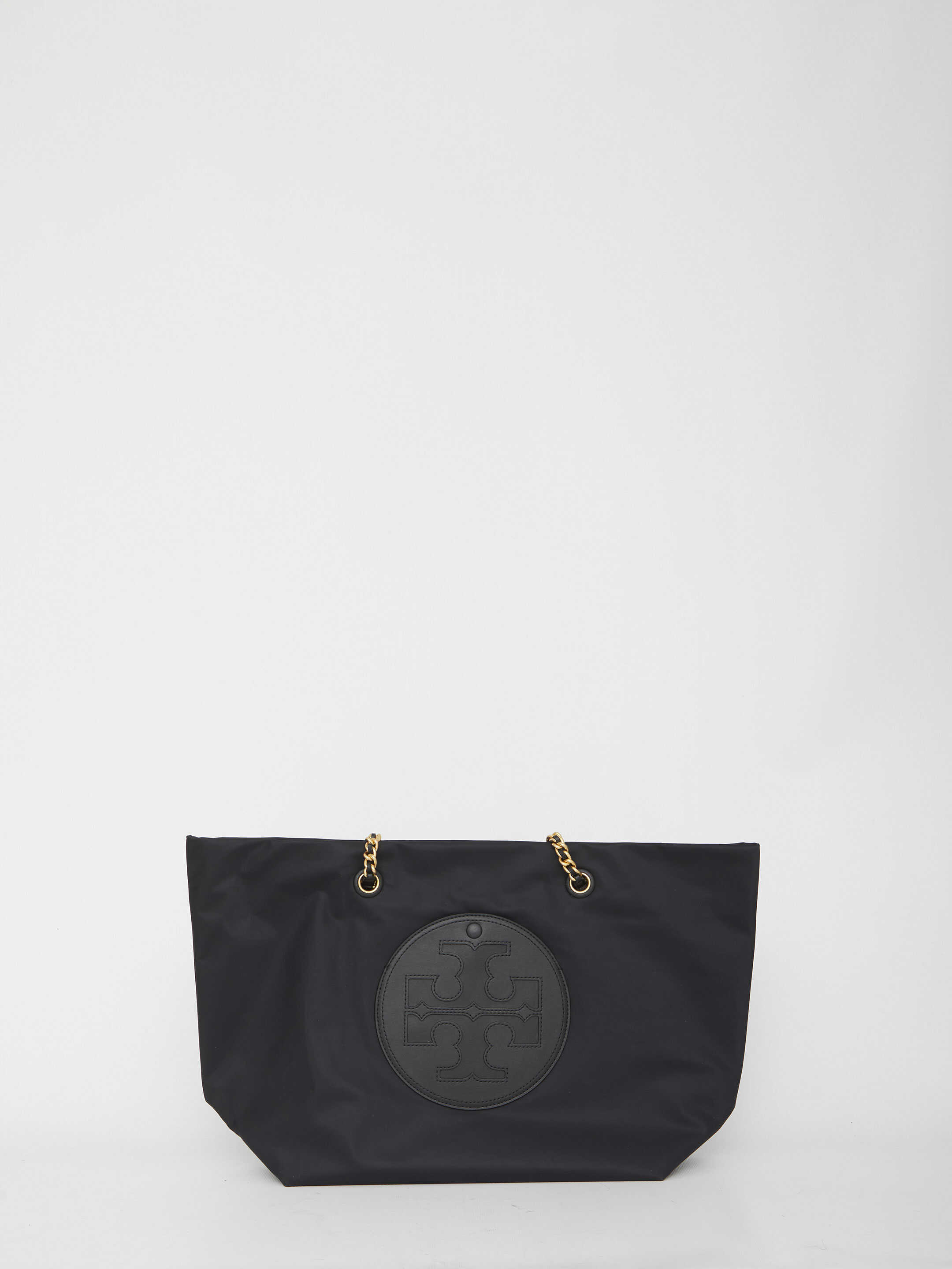 Ella Chain Tote bag in black coated canvas with press-stud Double T logo leather patch on the front. It features chain handles, magnetic closure, one main interior compartment and one interior zip pocket.