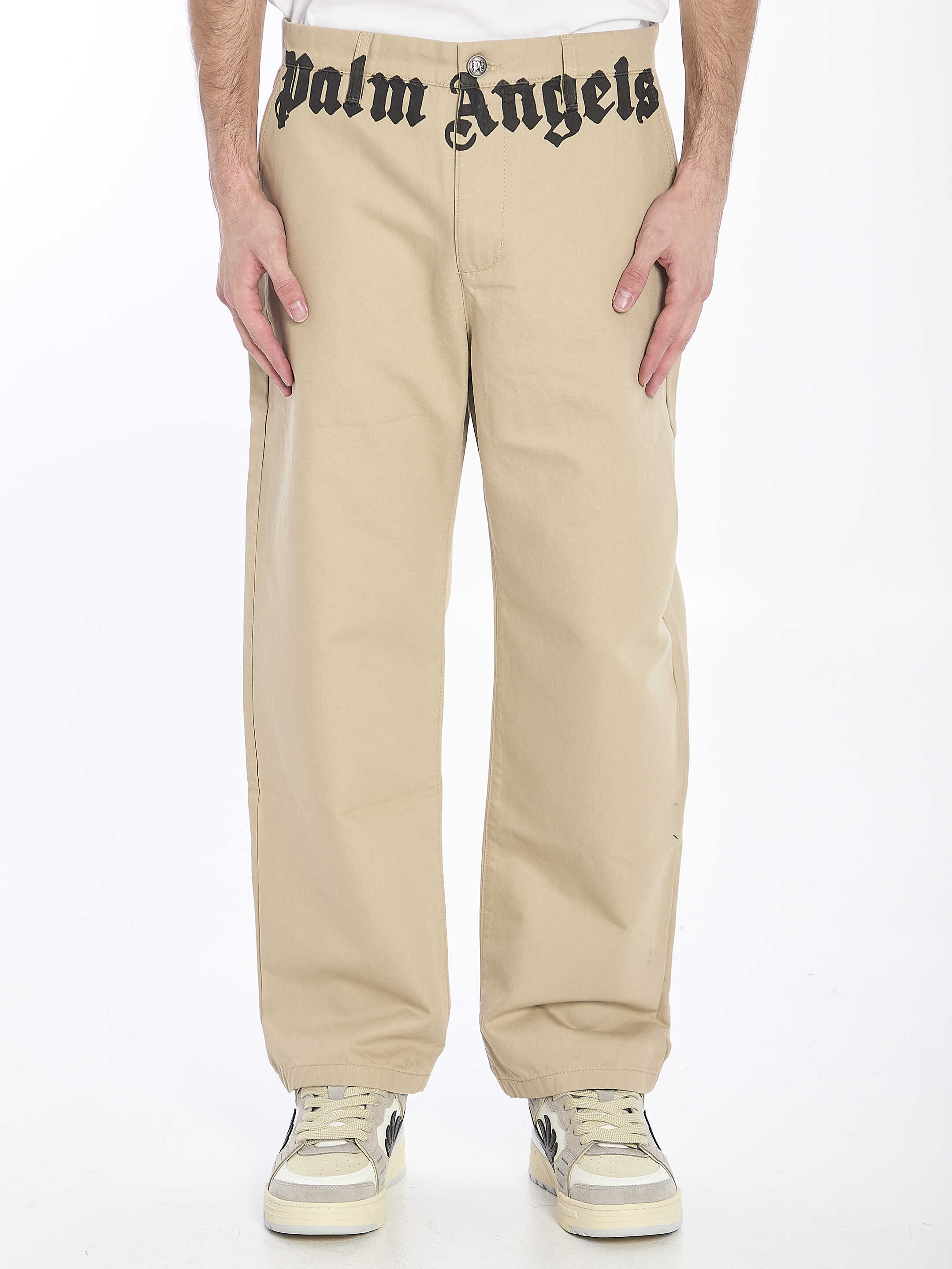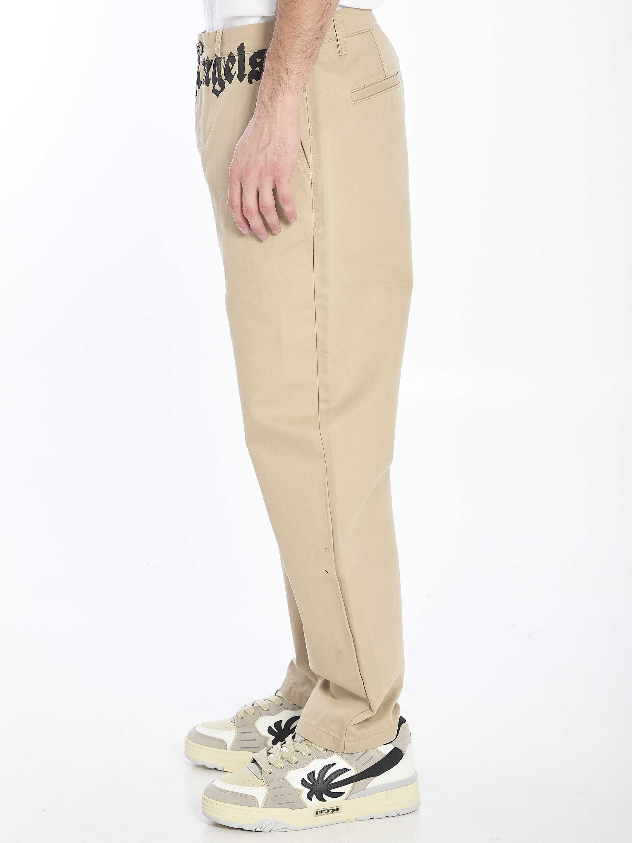 Chino pants in beige cotton with Palm Angels logo printed on the front. It features zip and button closure, two side welt pockets, two rear welt pockets and belt loops. Slim fit.