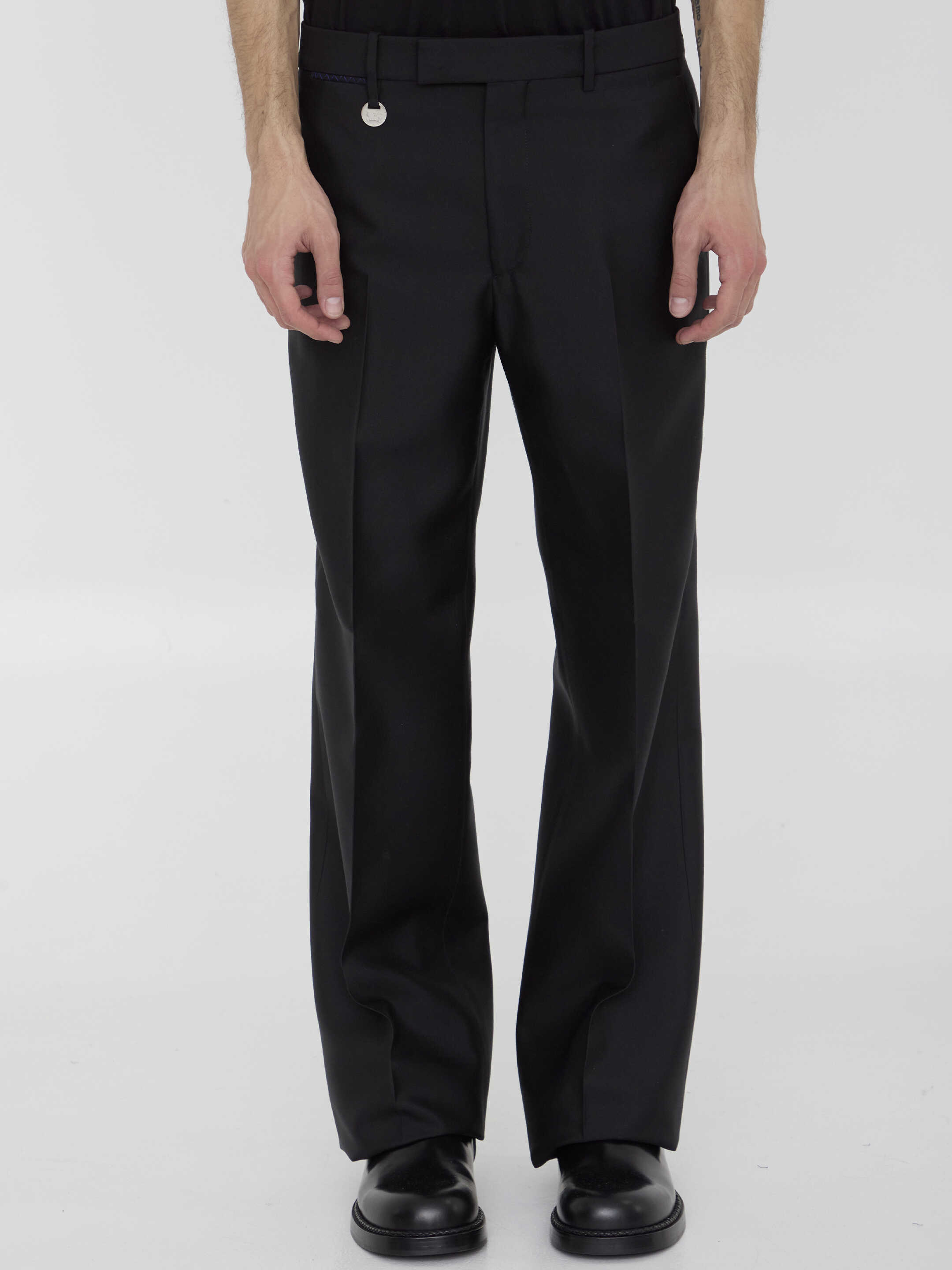 Tailored trousers in black wool and silk. It features zip, button and hook-and-eye closure, Equestrian Knight Design detail on loop, two side welt pockets, two rear buttoned welt pockets and belt loops. Relaxed fit.
