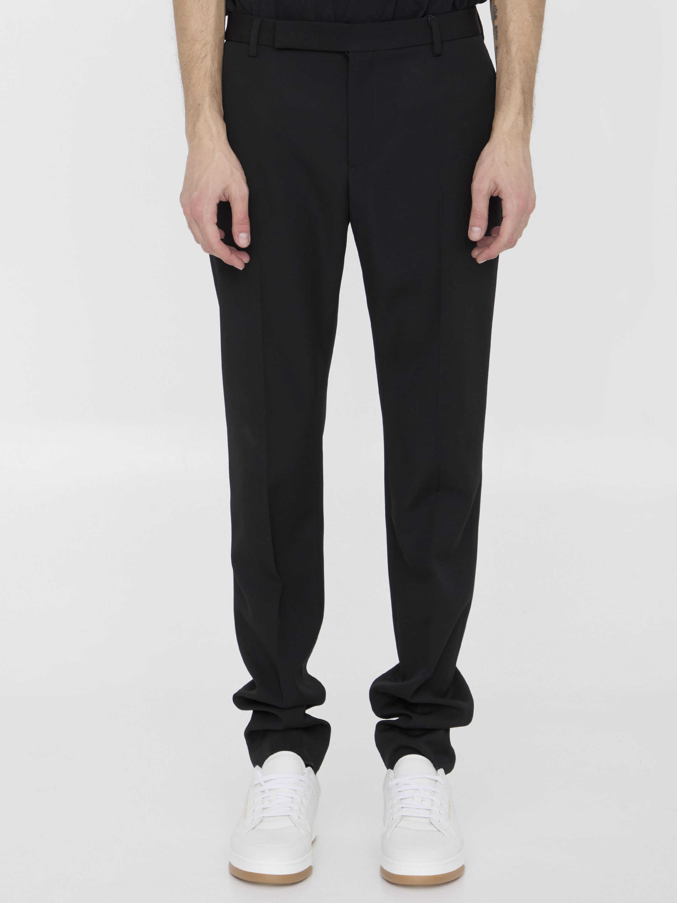 Black wool trousers. It features zip, button and hook-and-eye closure, two side welt pockets and two rear buttoned welt pockets. Slim fit.