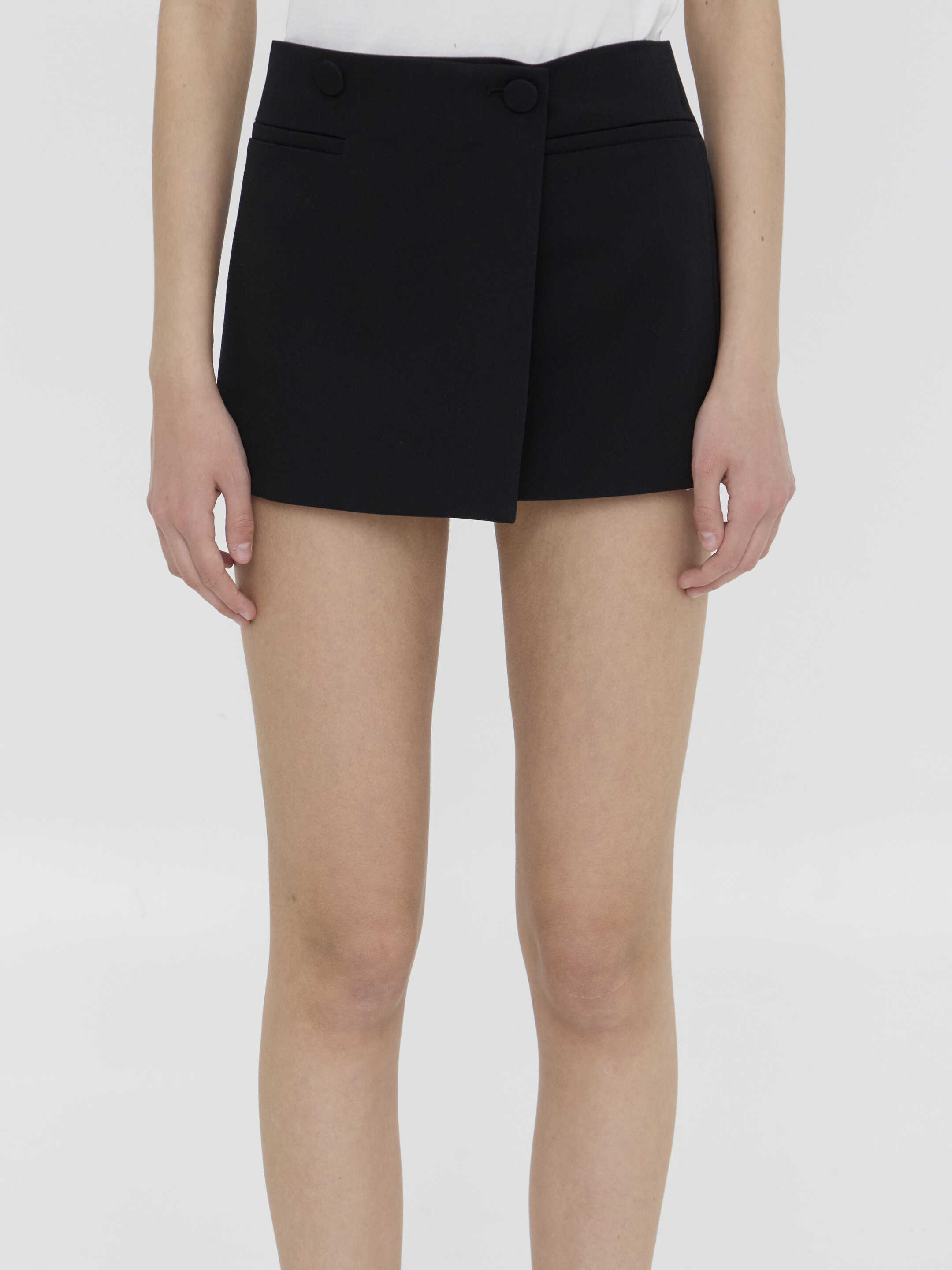 Black grisaille miniskirt. It features wrap closure and two faux welt pockets on the front. Slim fit.
