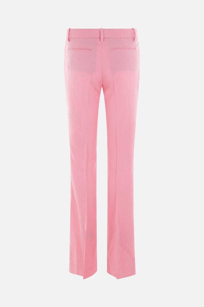Versace's flared pants crafted in pink Versace Allover jacquard wool. Featuring hook-and-eye / zip closure, belt loops, multiple pockets and pressed crease along centre. Unlined interior. "La Vacanza" capsule.
