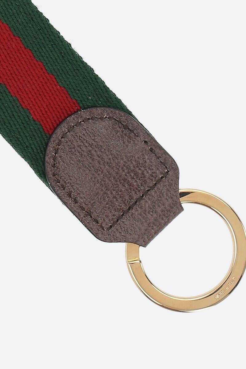 Gucci's key holder crafted in green and red Web fabric with brown leather insert. It features gold-tone metal key ring and Double G detailing.