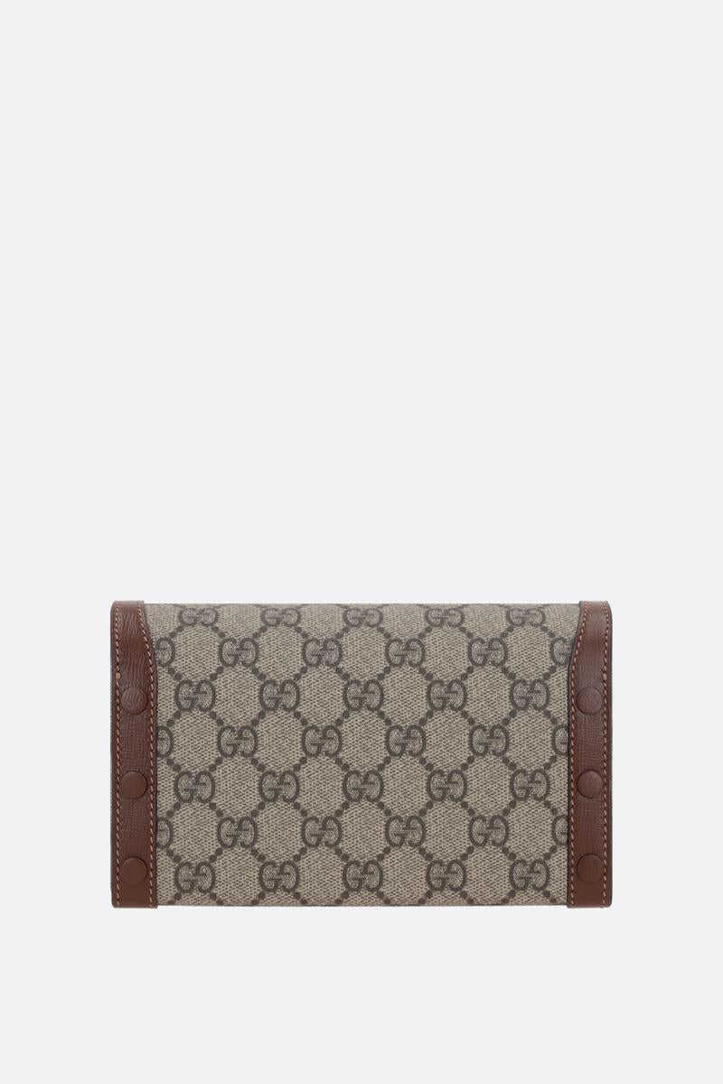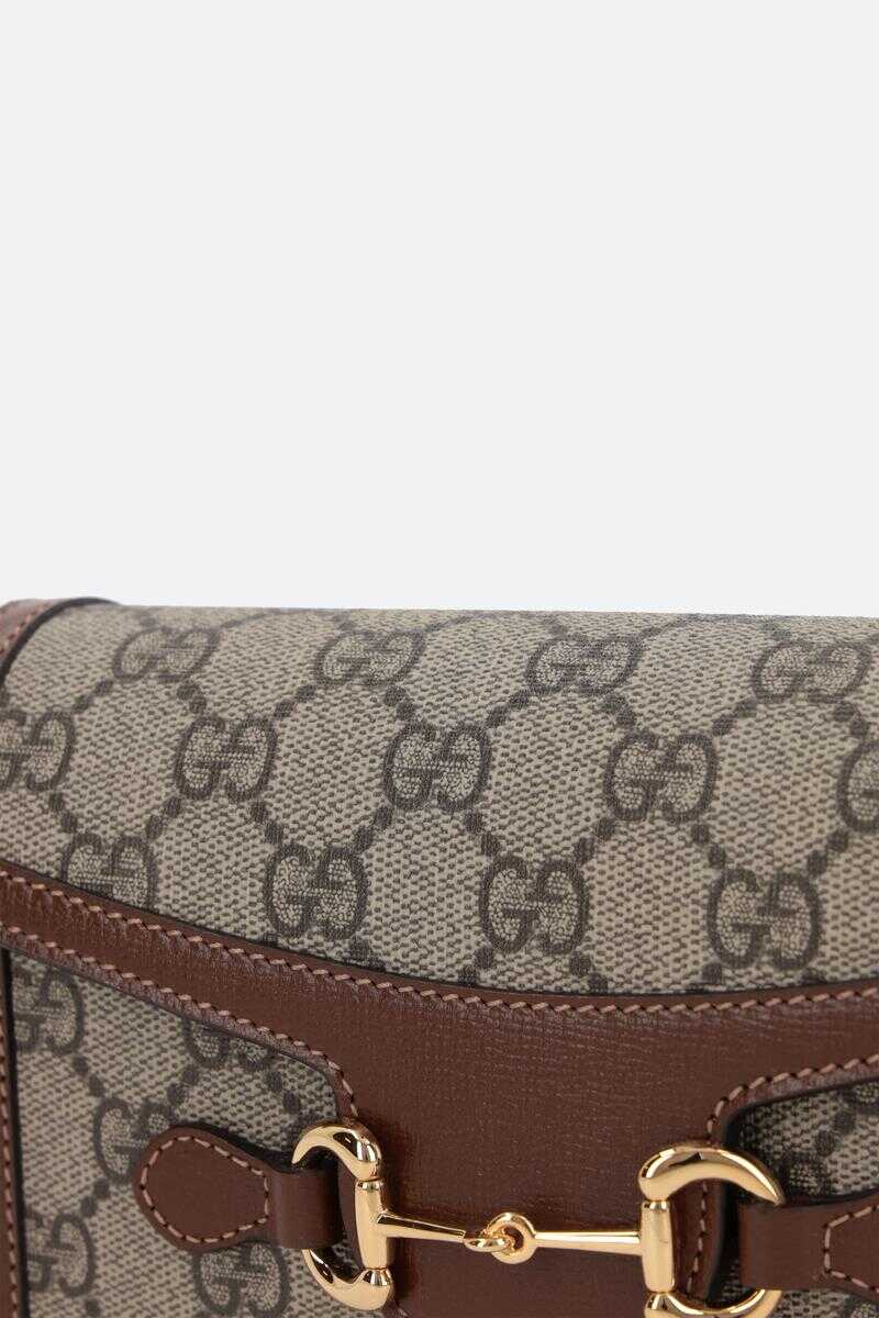Gucci's crossbody bag crafted in beige and ebony GG Supreme coated canvas with brown smooth leather trims. It features gold-tone hardware, magnetic button closure on flap and adjustable strap. Powder pink suede-effect fabric-lined interior. The design is completed by the iconic metal Horsebit detailing.