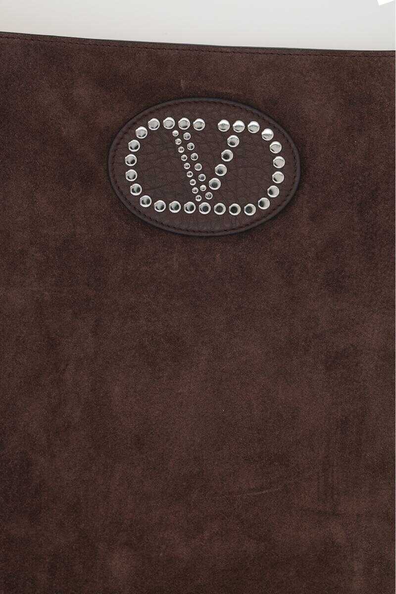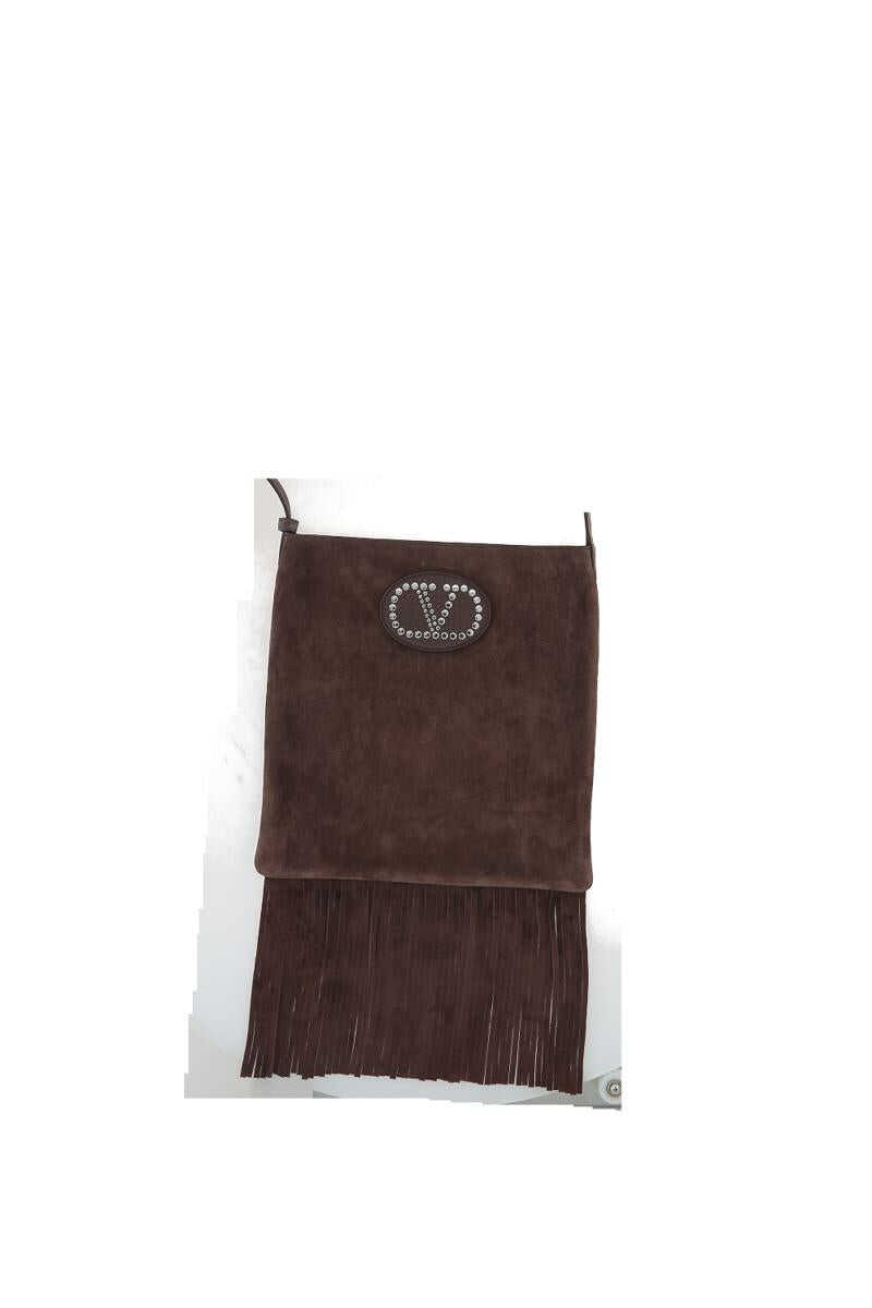 Valentino Garavani shoulder bag crafted in dark brown suede with fringe accents at the bottom. It features silver-tone hardware and adjustable shoulder strap. Tone-on-tone suede-lined interior. The design is completed with a front-applied VLogo Signature patch embellished by metal studs.