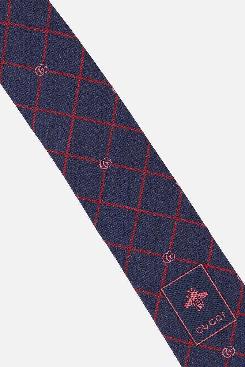 Gucci's tie crafted in blue silk and wool jacquard with Double G and check motif.