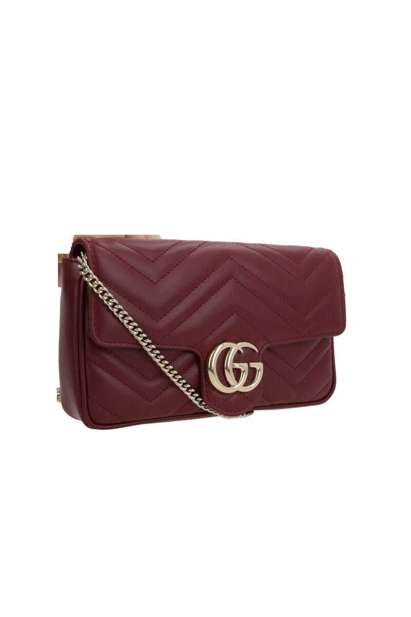 Gucci's shoulder bag crafted in burgundy quilted leather. It features gold-tone hardware, snap-button closure on flap and removable chain shoulder strap. Ivory leather-lined interior with two card slots and removable zipped card case in ivory leather. The design is completed by back slide pocket and the unmistakable metal Double G detail on flap.