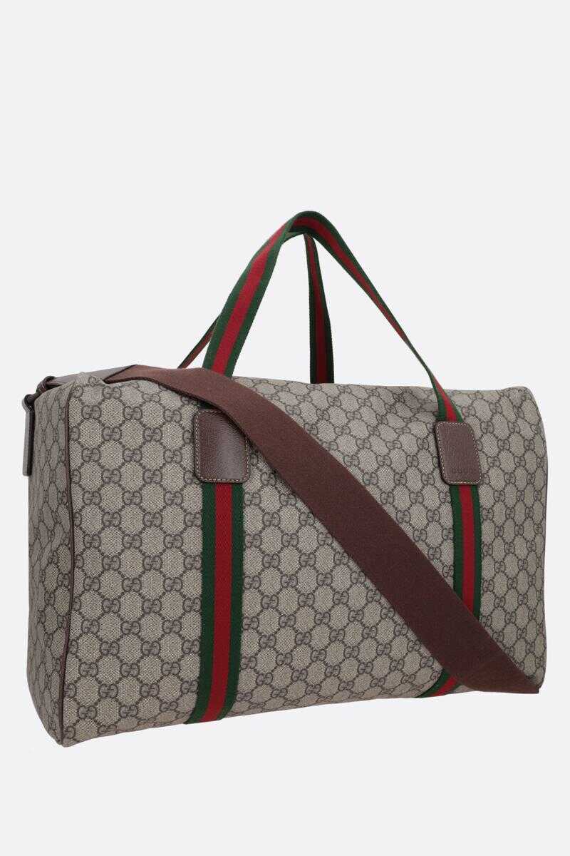 Gucci's weekend bag crafted in beige and ebony GG Supreme coated canvas with brown grained leather trim. It features silver-tone hardware, zip fastening, Web fabric handles and adjustable / removable fabric shoulder strap. Brown nylon-lined interior with zip pocket.
