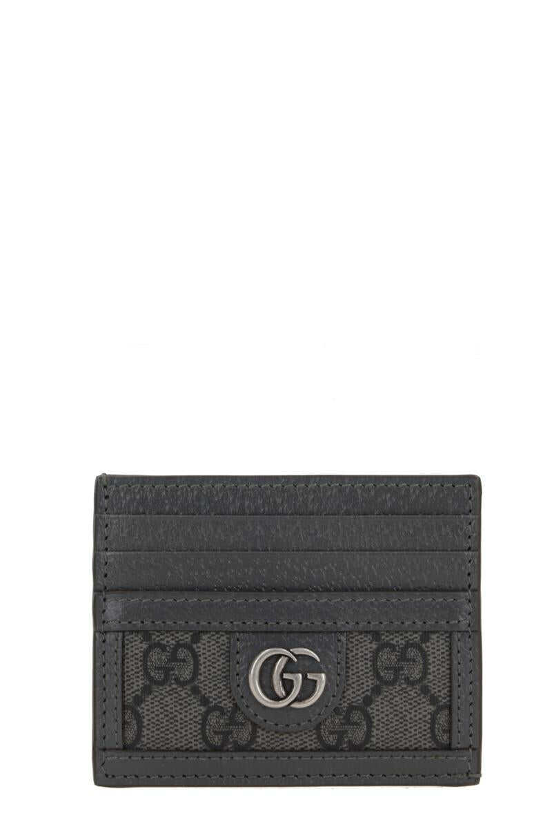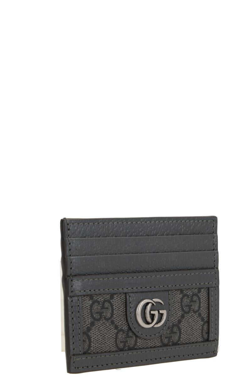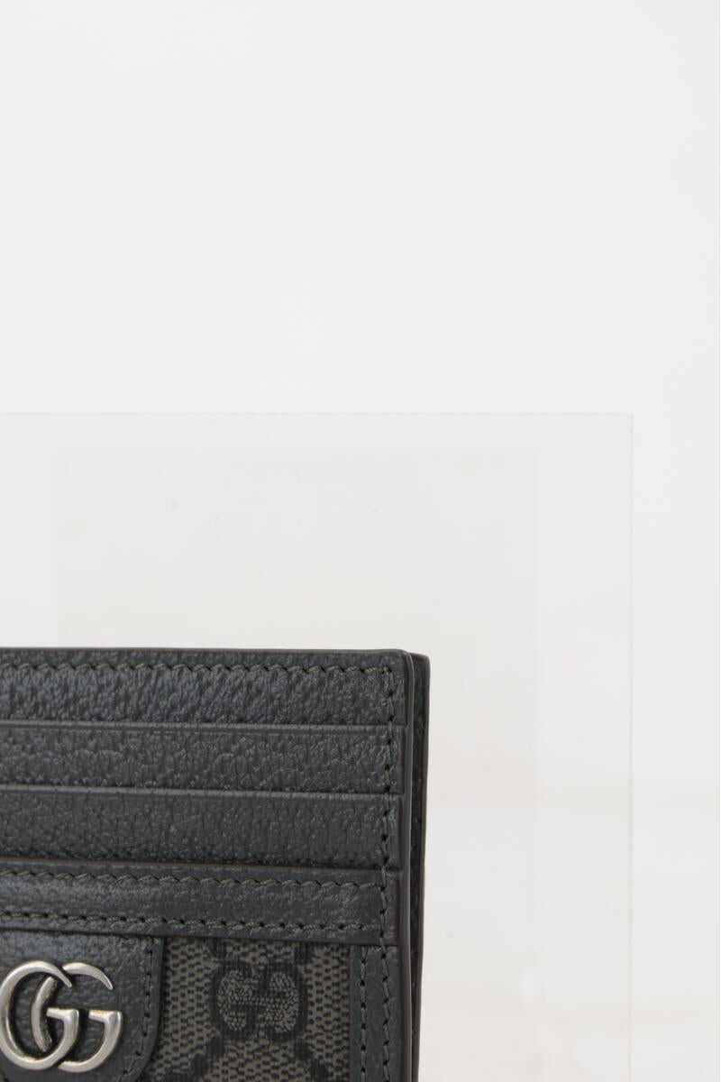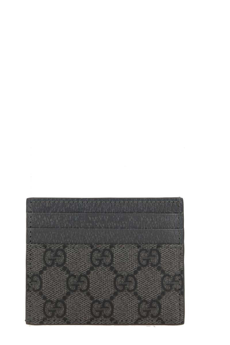 Gucci open-sided cardholder crafted from black and gray GG Supreme canvas. The leather and fabric-lined interior features six card slots. The design is finished with the iconic Double G metal detail.