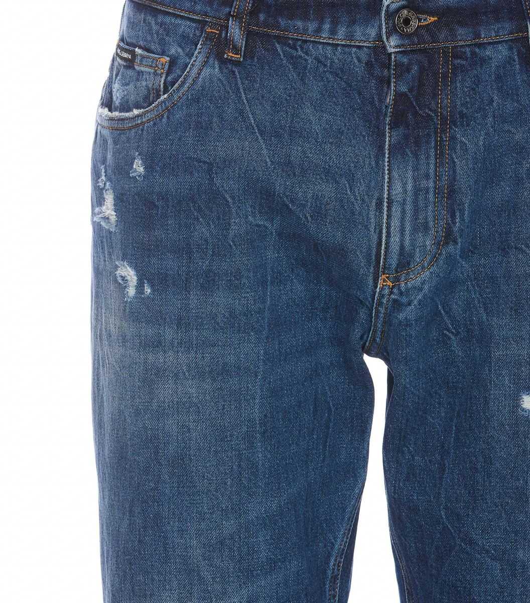 Blue cotton ripped detailing washed denim classic five pockets front button and zip fastening belt loops embroidered logo to the rear
