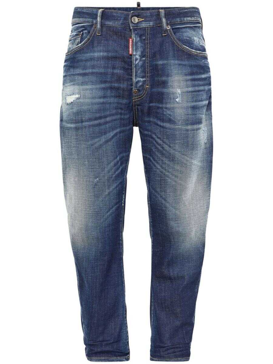 navy blue cotton washed denim faded effect whiskering effect at the thighs ripped detailing mini logo tag logo patch to the rear button fly fastening belt loops classic five pockets straight leg