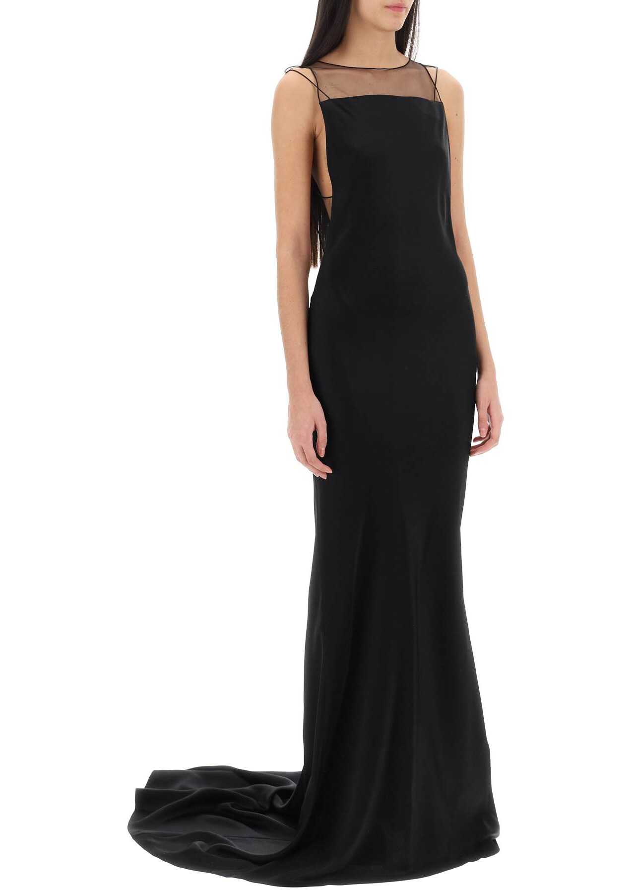 Sleeveless gown with train in fluid hammered satin by Maison Margiela, featuring a sleek open back silhouette enriched by sheer tulle inserts and spaghetti straps. Signature four-stitches moniker on the back, silk lining. Back closure with a small button. The model is 177 cm tall and wears a size IT 40.