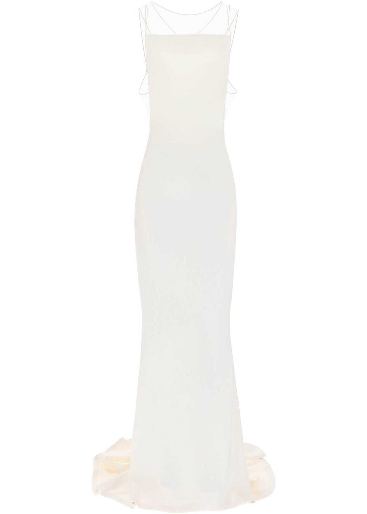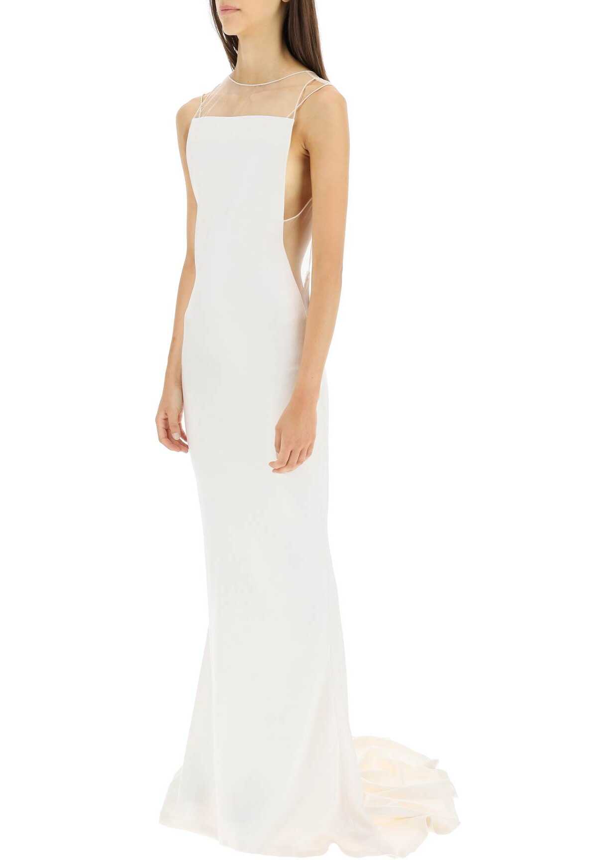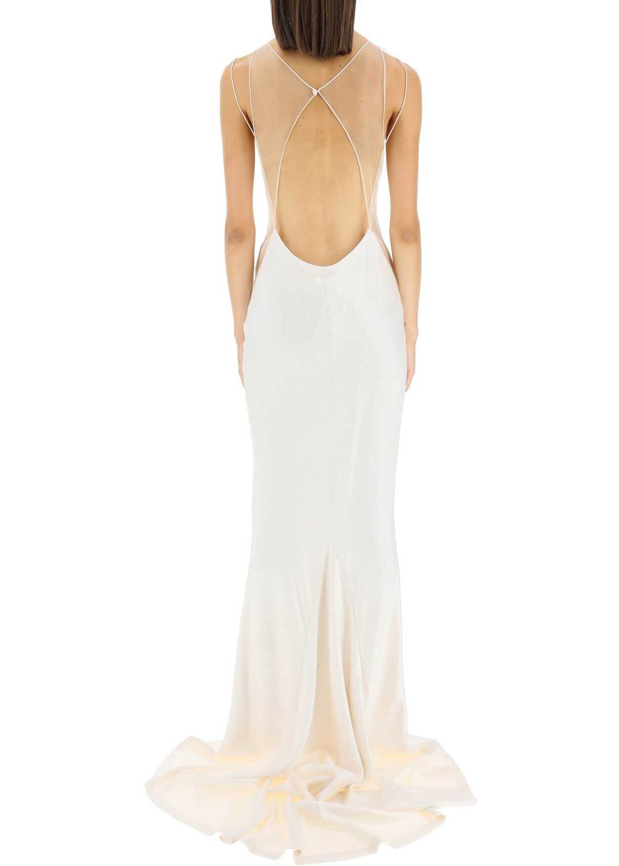Sleeveless gown with train in fluid hammered satin by Maison Margiela, featuring a sleek open back silhouette enriched by sheer tulle inserts and spaghetti straps. Signature four-stitches moniker on the back, silk lining. Back closure with a small button. The model is 177 cm tall and wears a size IT 40.