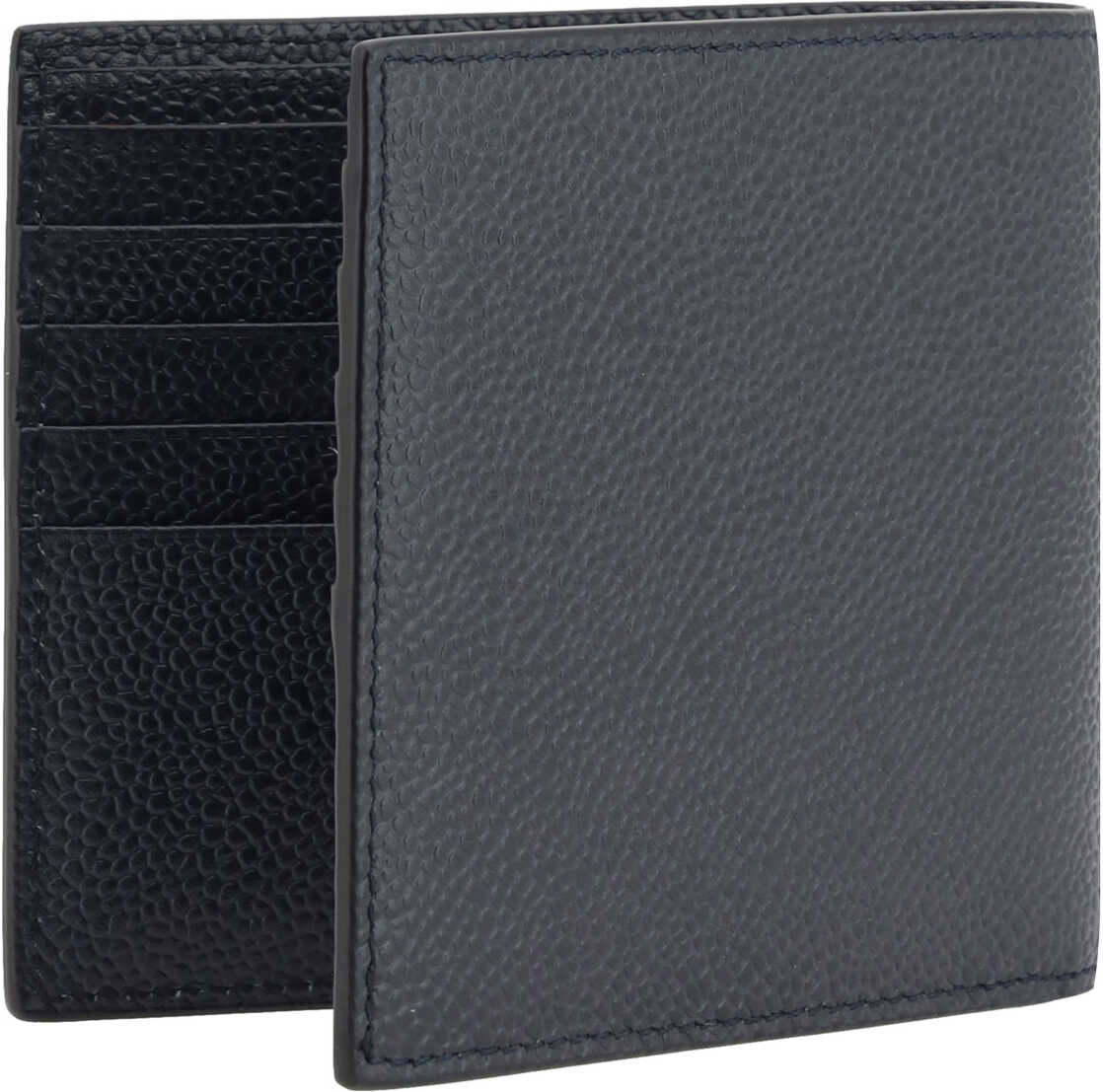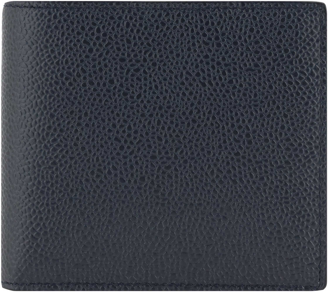 Thom Browne's grained leather wallet features a stylish bifold design with two bill compartments and card slots with an iconic tab. It also includes two slit pockets for added convenience. The interior is lined in the brand's distinctive colors, while the gold logo on the inside adds a touch of understated luxury. A refined and functional accessory perfect for those seeking style and quality.