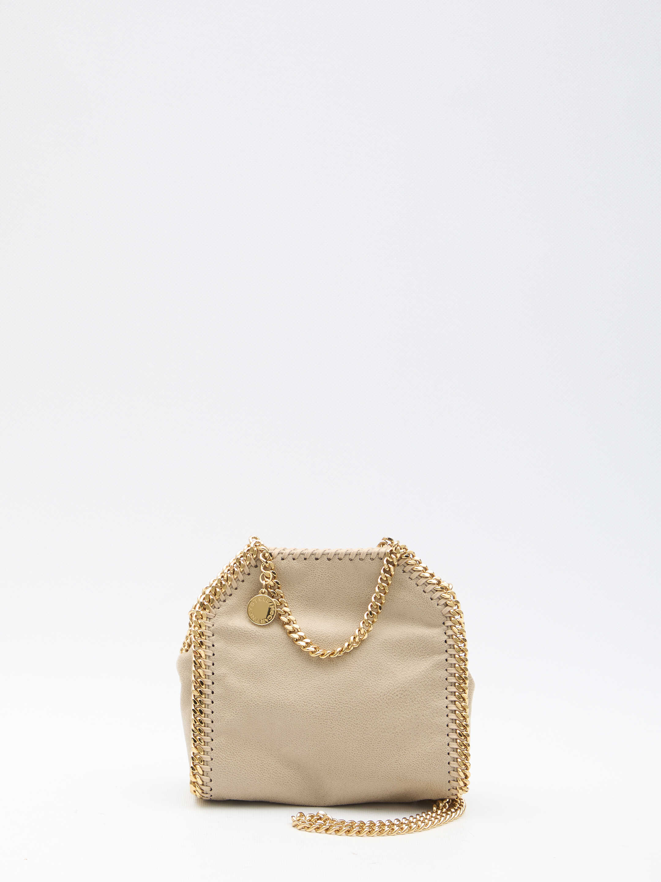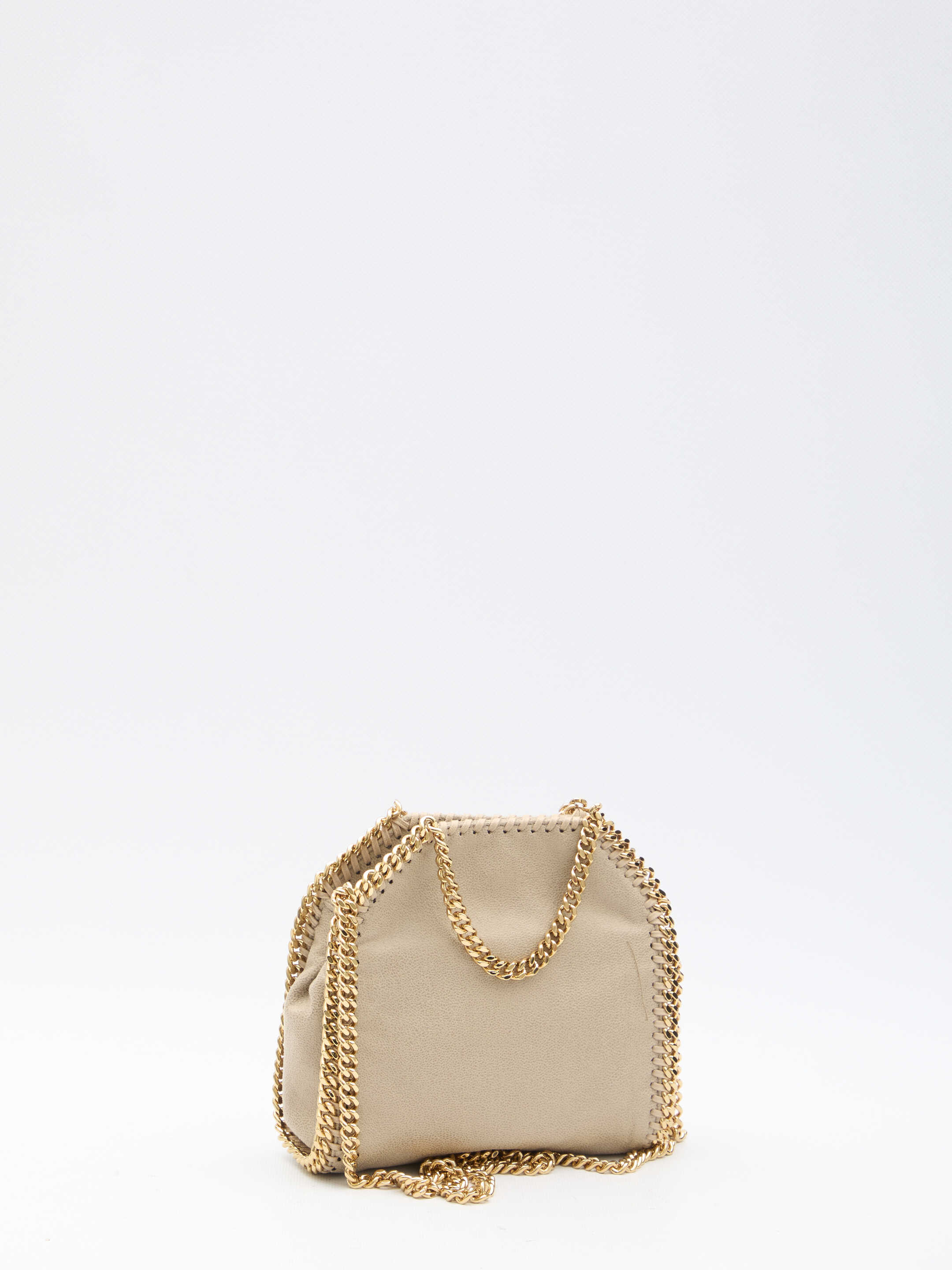 Falabella micro tote bag in cream-colored vegan Shaggy Deer fabric with gold-tone diamond-cut chain. It features two top handles, shoulder strap, magnetic closure, one main interior compartment and one interior slip pocket.