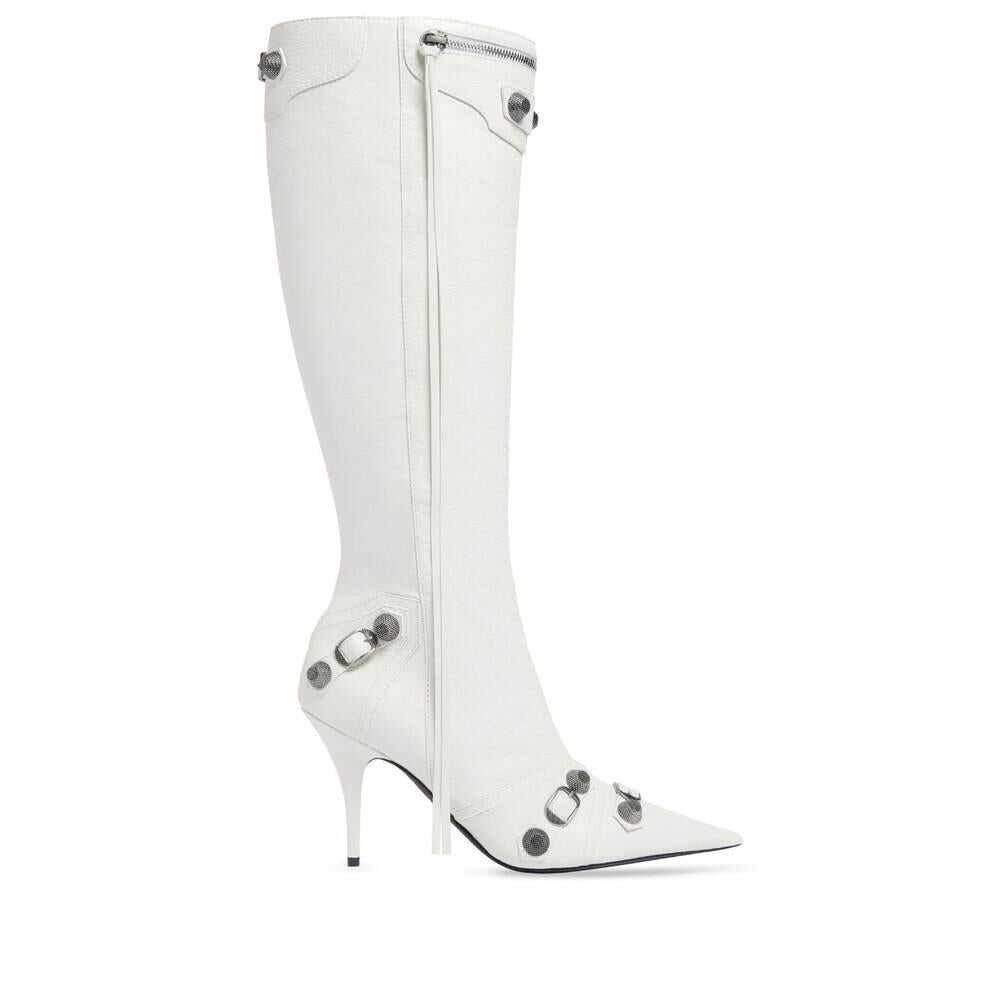 Off-white calf leather grained texture knee-high silver-tone stud detailing decorative zip detailing decorative buckle detailing side zip fastening pointed toe branded leather insole high stiletto heel we've partnered with good on you — an independent agency that rates how brands perform in relation to their impact on the planet, people and animals, with a multi-criteria rating simplified to a five points scale. in order to be awarded our conscious label, larger brands need to score a minimum of four out of five ('good'), while smaller brands must score at least three out of five ('it's a start'). this item comes from a brand rated four out of five ('good') by good on you at the time it was added on farfetch. please note, this is a brand-level rating and does not guarantee that this product is made with conscious materials. learn more about what makes a product conscious on our conscious criteria page