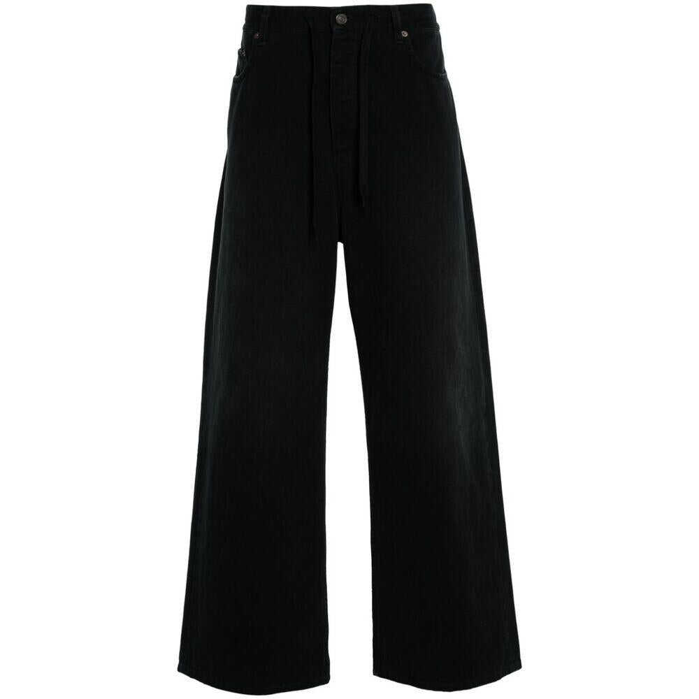 Black cotton denim distressed effect drawstring waist belt loops classic five pockets full-length logo patch to the rear wide leg front concealed fly and button fastening when buying this unisex item, keep in mind that it is graded in standard men's sizing. learn more about what makes a product conscious on our conscious criteria page
